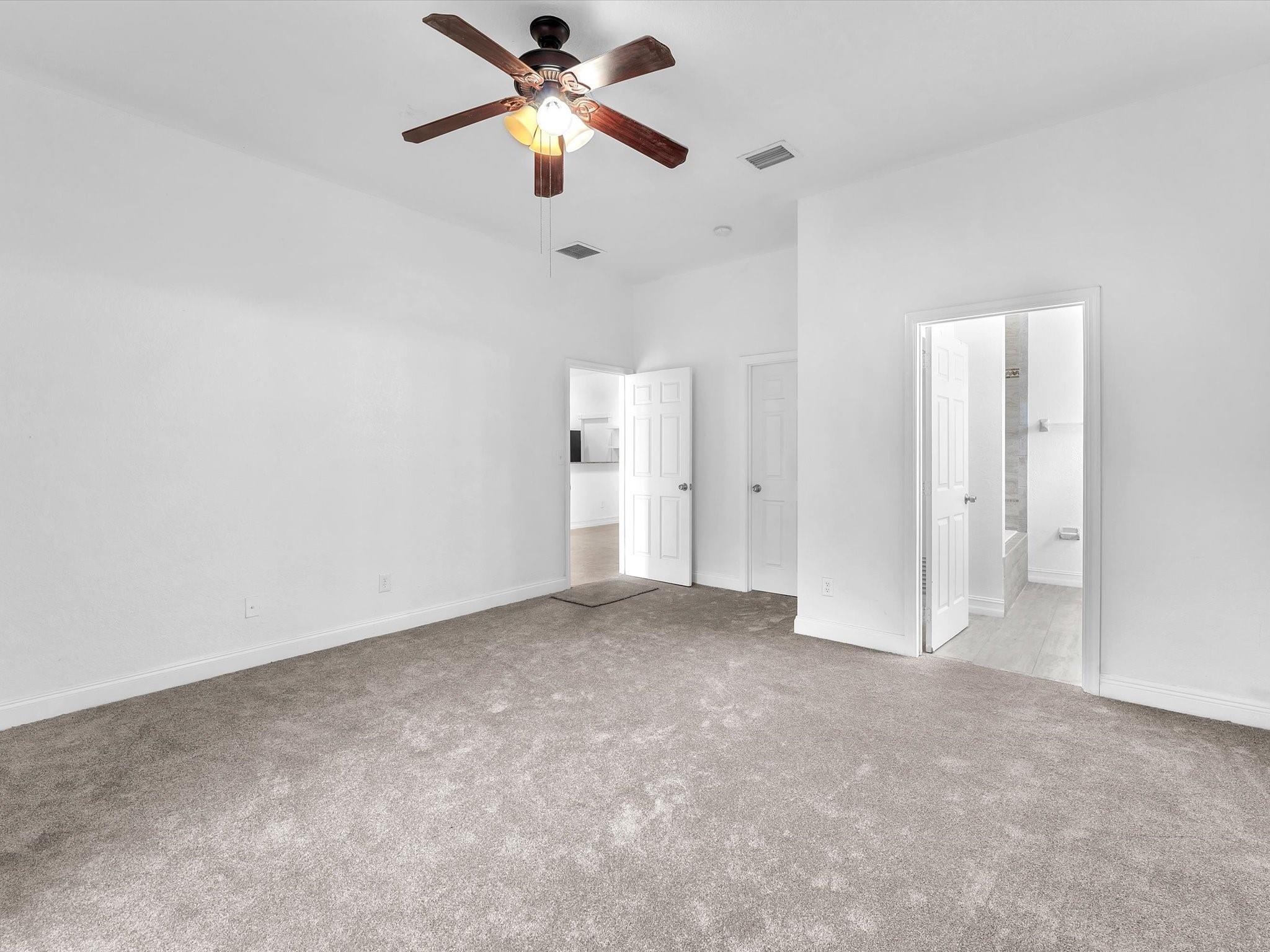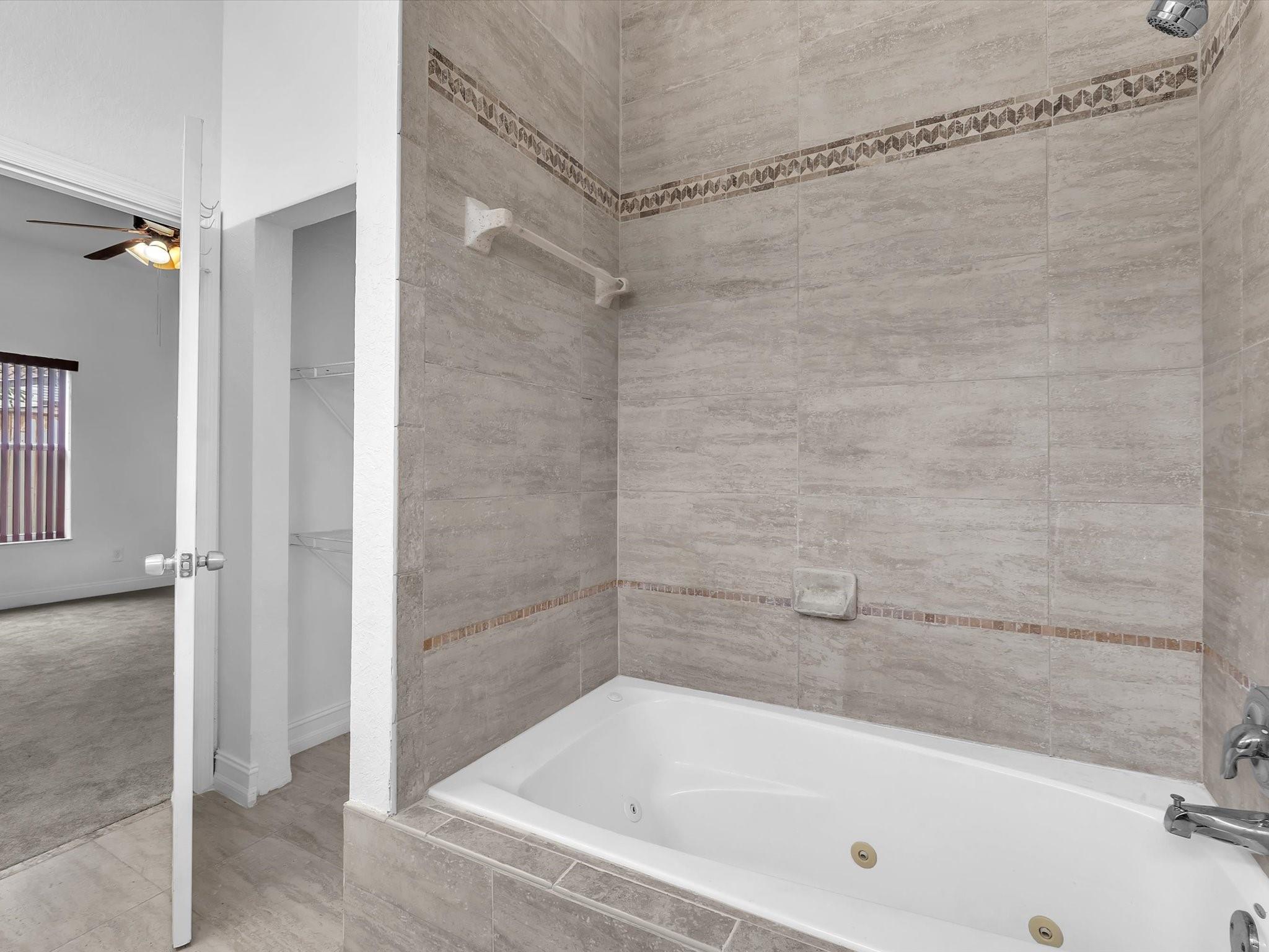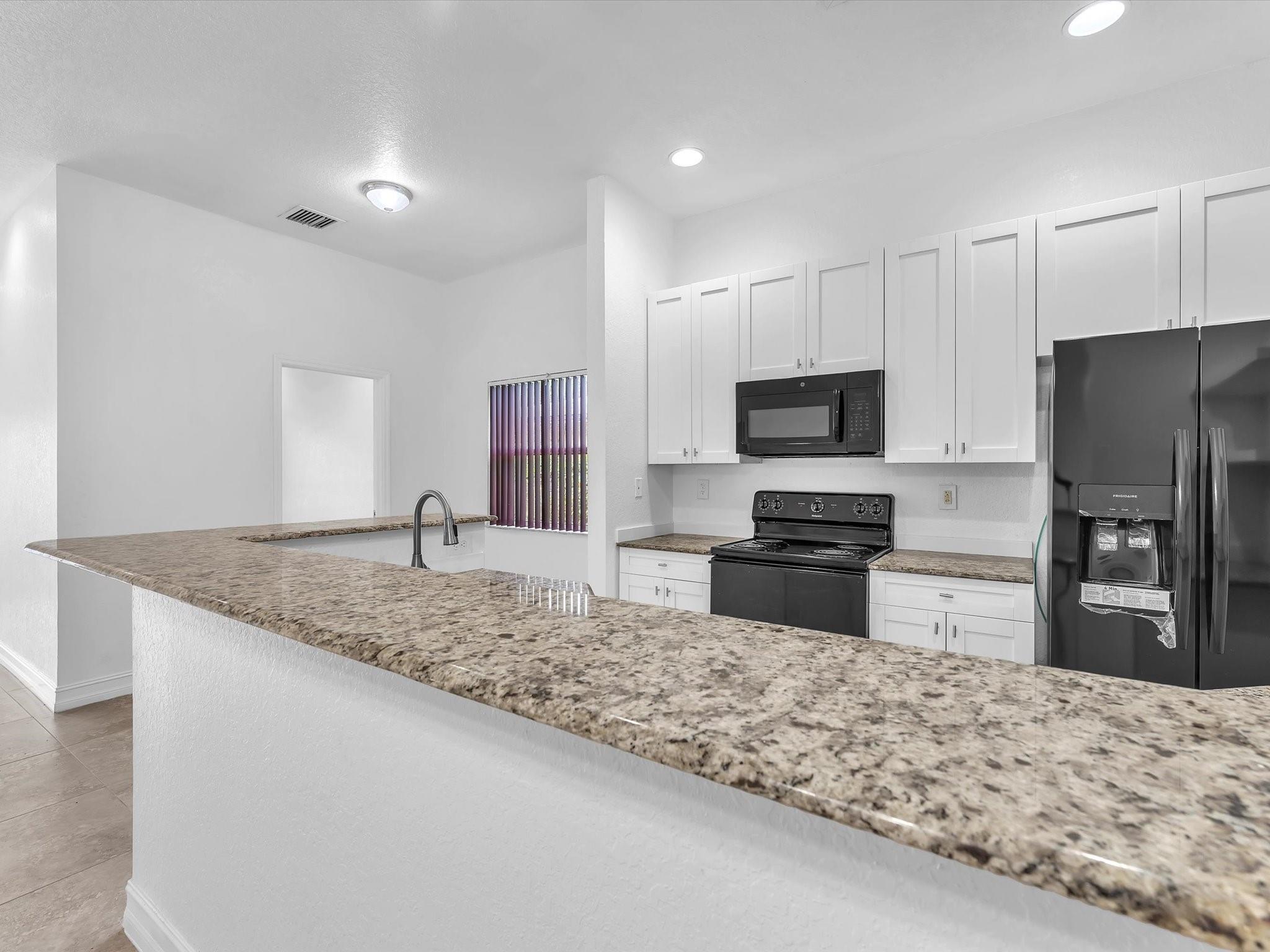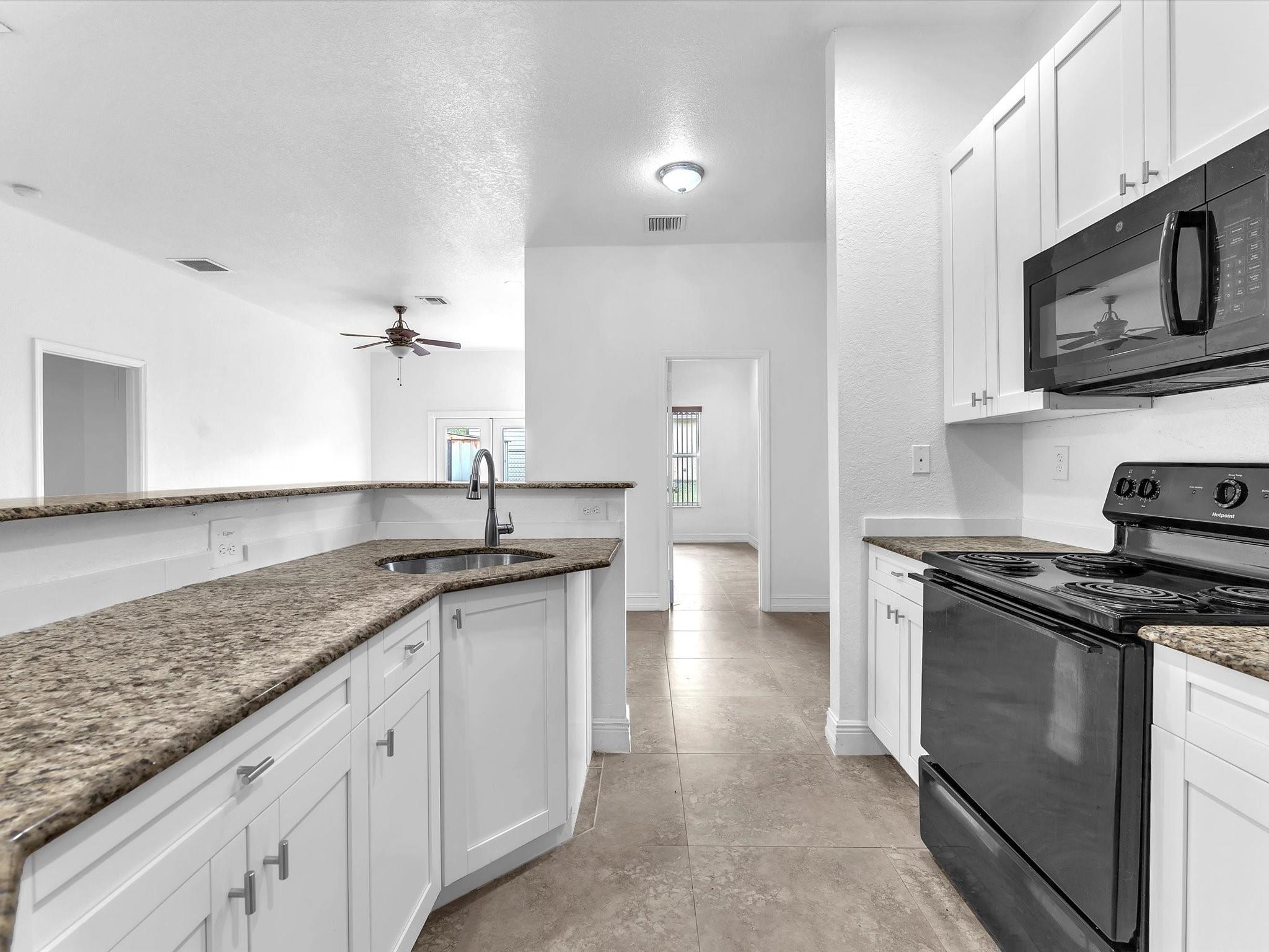 This spacious 4 bedroom, 2 bathroom home boasts 10ft ceilings and a 2 car garage. The kitchen is the heart of the home offering granite counters, new cabinetry, black appliances and a breakfast bar. The large primary bedroom provides a private retreat, with an ensuite that features a modern double sink vanity, a luxurious jetted tub, a linen closet and a walk-in closet. The open floorplan includes neutral tile flooring throughout the main living areas and new carpeting in the bedrooms. Freshly painted, new roof (6/2023), new refrigerator, aluminum hurricane panels, and a timed irrigation system.