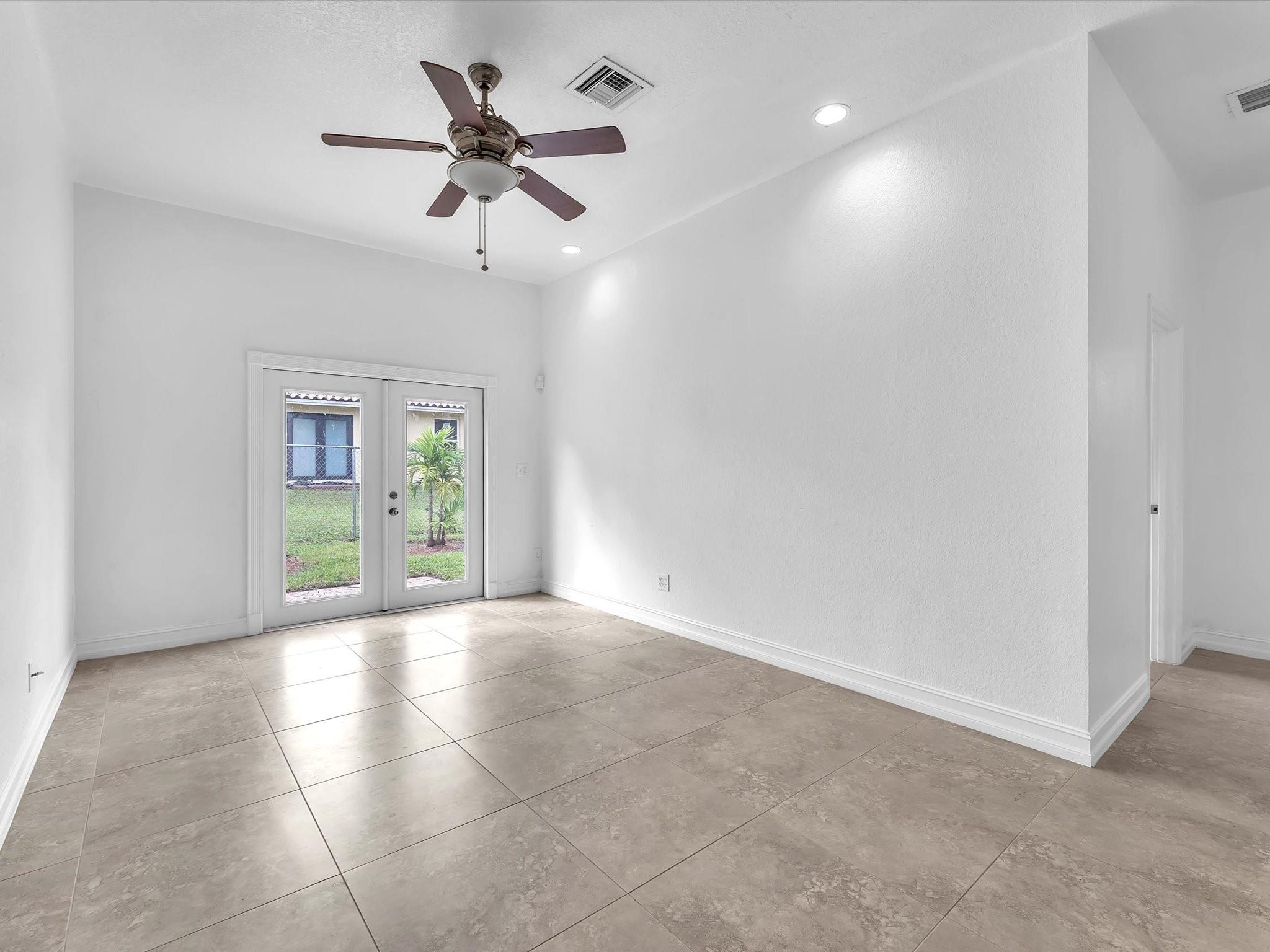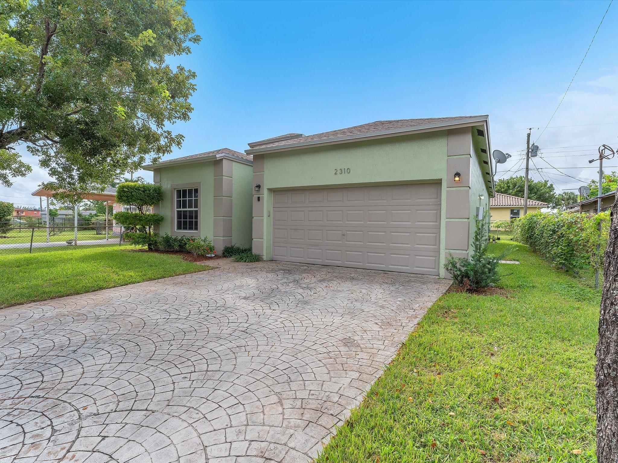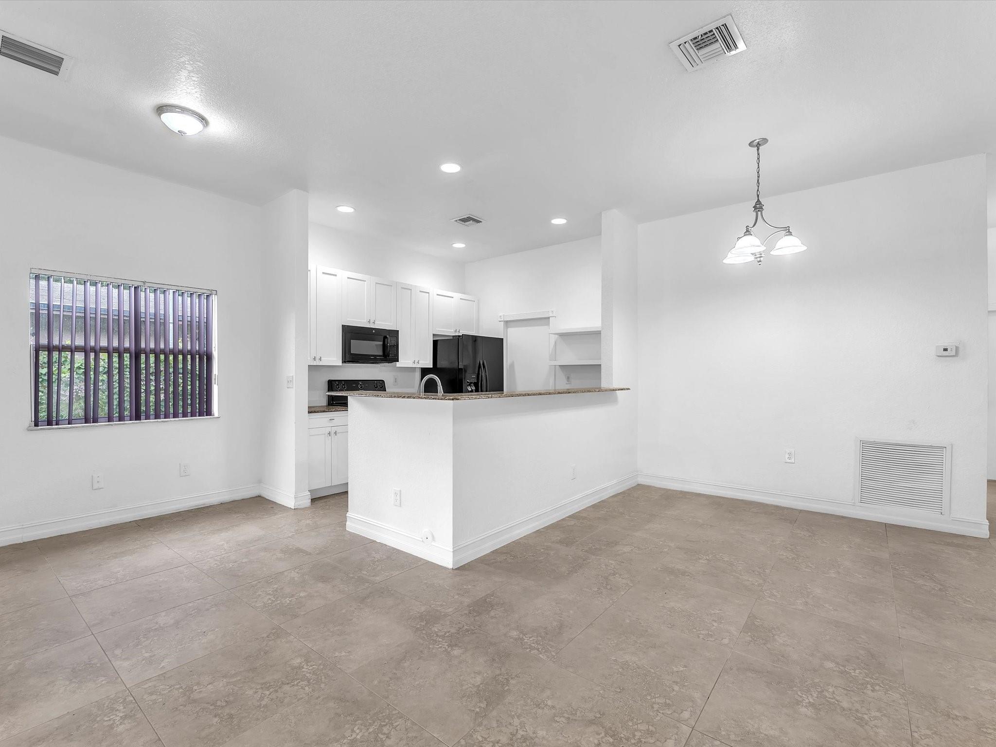 This spacious 4 bedroom, 2 bathroom home boasts 10ft ceilings and a 2 car garage. The kitchen is the heart of the home offering granite counters, new cabinetry, black appliances and a breakfast bar. The large primary bedroom provides a private retreat, with an ensuite that features a modern double sink vanity, a luxurious jetted tub, a linen closet and a walk-in closet. The open floorplan includes neutral tile flooring throughout the main living areas and new carpeting in the bedrooms. Freshly painted, new roof (6/2023), new refrigerator, aluminum hurricane panels, and a timed irrigation system.