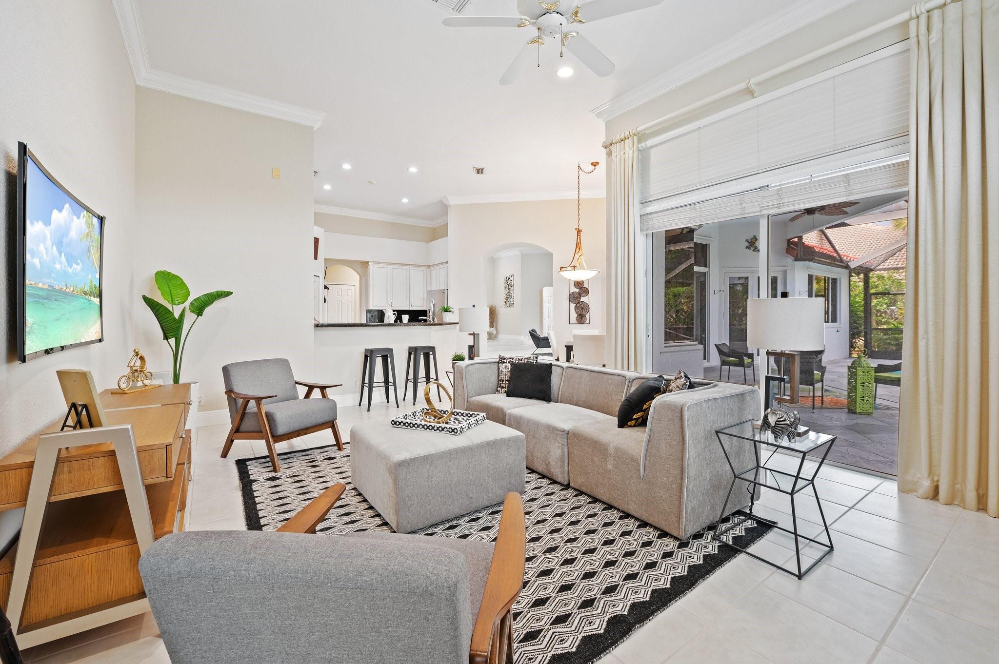 MOVE-IN READY!! LIVE THE COUNTRY CLUB LIFESTYLE! GOLF COURSE POOL HOME MAINTAINED BY ORIGINAL OWNERS, NEW ROOF INSTALLED 2023, UPDATED KITCHEN, GRANITE COUNTERS, 42" WOOD CABINETS, STAINLESS STEEL APPLIANCES WITH SEPARATE BREAKFAST AREA AND SNACK COUNTER. HIGH-VOLUME TRAY CEILINGS, LARGE OPEN LIVING SPACES, CROWN MOLDING, A TRIPLE SPLIT FLOOR PLAN & LARGE SECONDARY BEDROOMS. LUXURIOUS MAIN SUITE & BATH, 2 CUSTOM WALK-IN CLOSETS, FRENCH DOORS TO PATIO. HUGE SCREENED COVERED POOL/PATIO, ACCORDION SHUTTERS, 3 CAR GARAGE WITH STORAGE CABINETS. 5TH BEDROOM CURRENTLY USED AS OFFICE. NEUTRAL TILE AND HIGH-IN LAMINATE FLOORS.