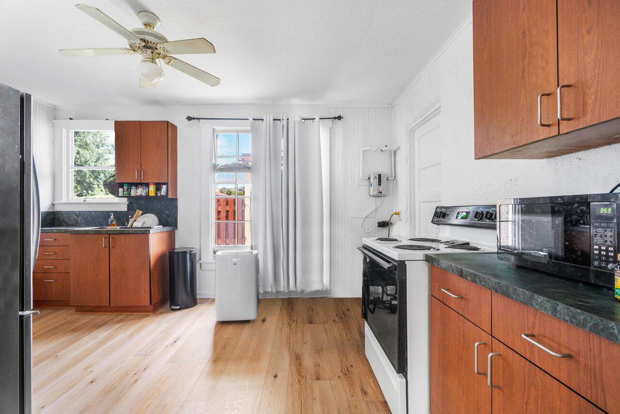 Price Adjustment! Explore this unique multi-family gem in West Palm Beach featuring 3 units total; the main house up front and a detached structure in the back with upper and lower units all 1 bed 1 bath, plus a large workshop space. Pecky Cypress front door on the main house, inside boasts original Dade County pine wood floors, crown moulding, custom wood accents, impact windows, new central A/C w/ Nest thermostat, New tankless water heater, and an inviting upgraded kitchen with Stainless Steel appliances, custom hood vent, and a gas stove. Solar panels for energy savings! 2 units out back are move-in ready, perfect for rental income! Lower unit w/ updated floors and bathroom, upper unit with wood floors this is the perfect income producing investment or multi-gen living. See today!