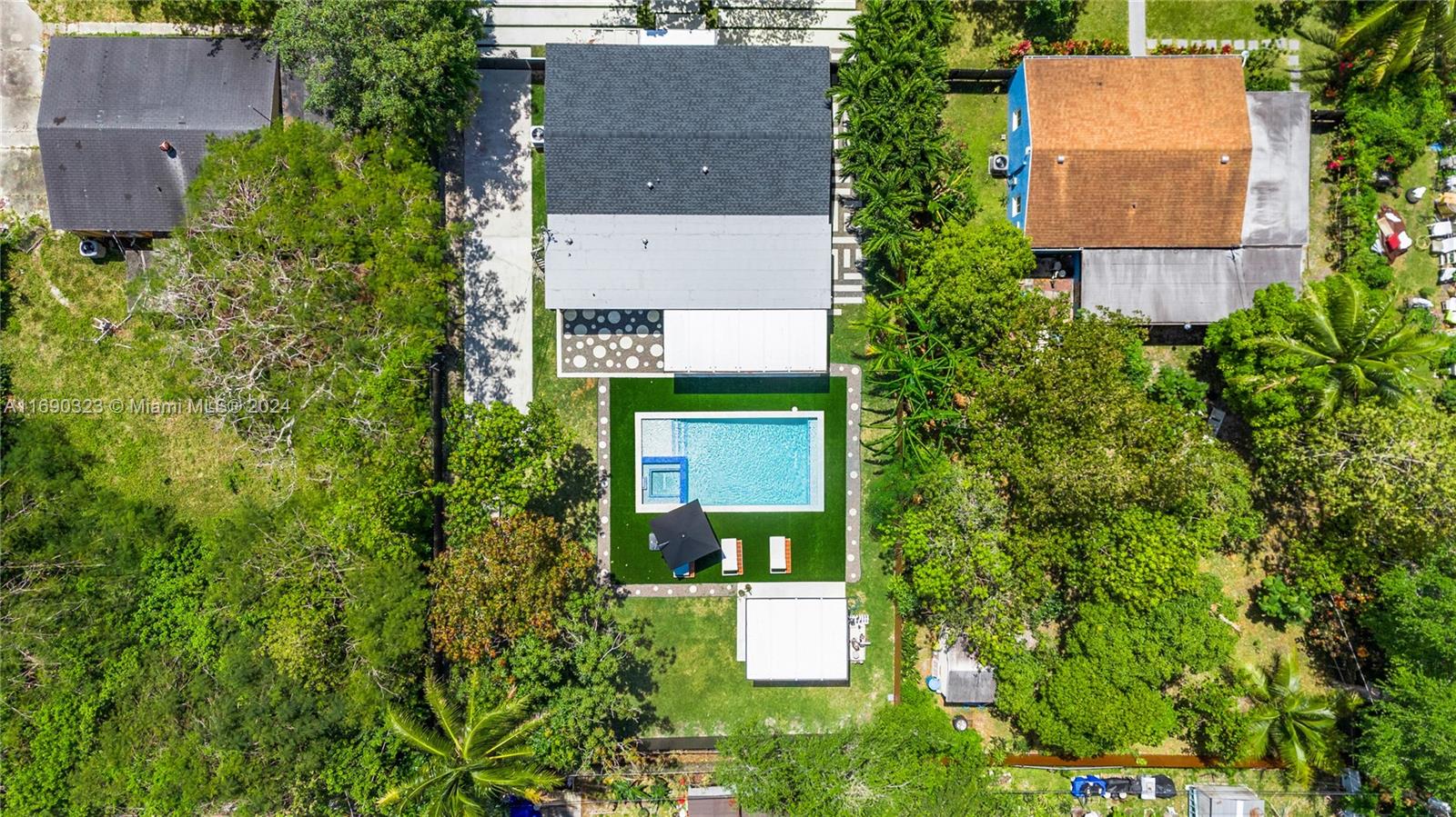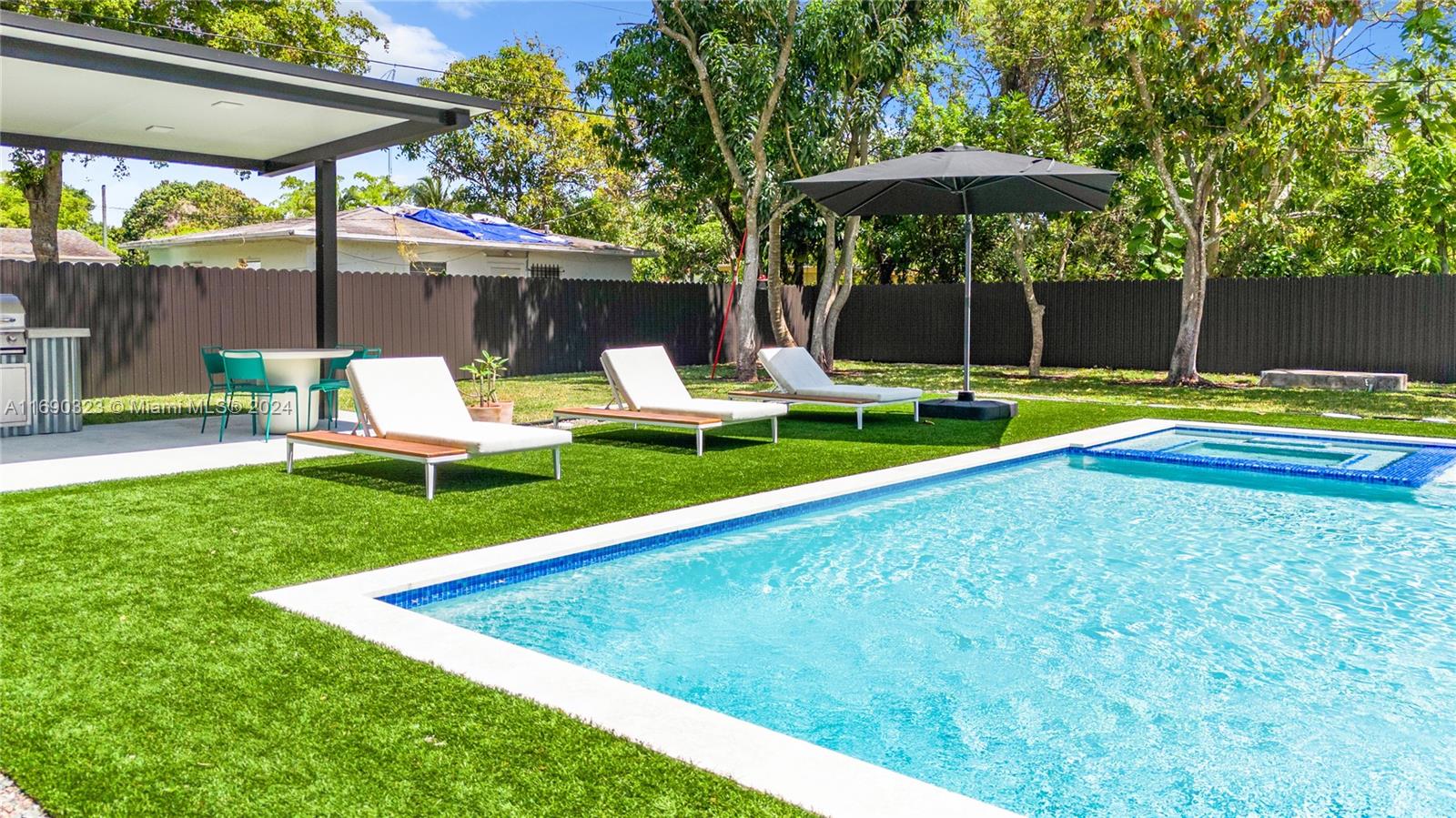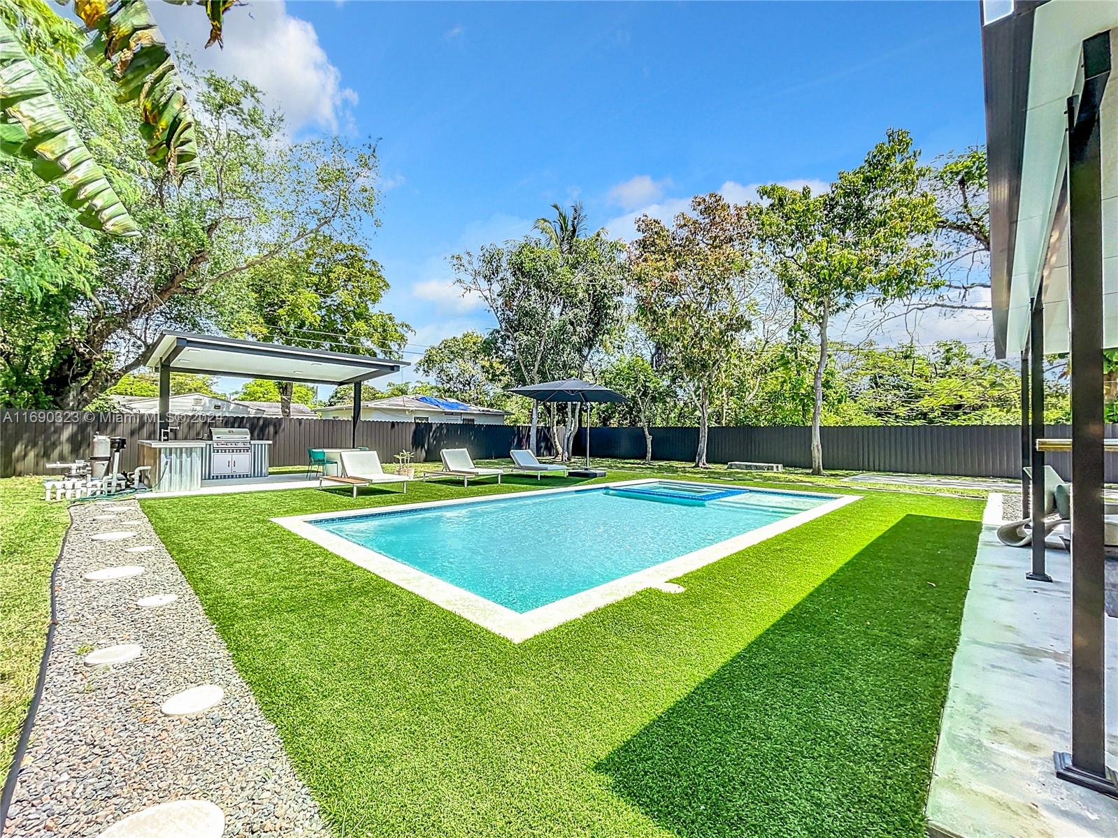 Nestled in a desirable North Miami neighborhood, this beautiful 4-bedroom newly rebuilt in year 2022 & renovated house, boasts an impressive array of features, upgrades and amenities. As you enter, you are greeted by an open floor plan that lends an airy and spacious feel to the living space. No expenses spared!One-of-a-kind kitchen with custom cabinets, Samsung appliances and quartz countertops. The home is equipped with recessed lighting, window treatments, smart home tech, built-in closets and large tile floors.The exterior is equally impressive with an oversized salt-water swimming pool, well-manicured landscape, built-in barbecue area and outdoor gym. Large concrete driveways with enough space to park several cars. Centrally located, minutes from Bal Harbor shops, Mimo and Whole Foods