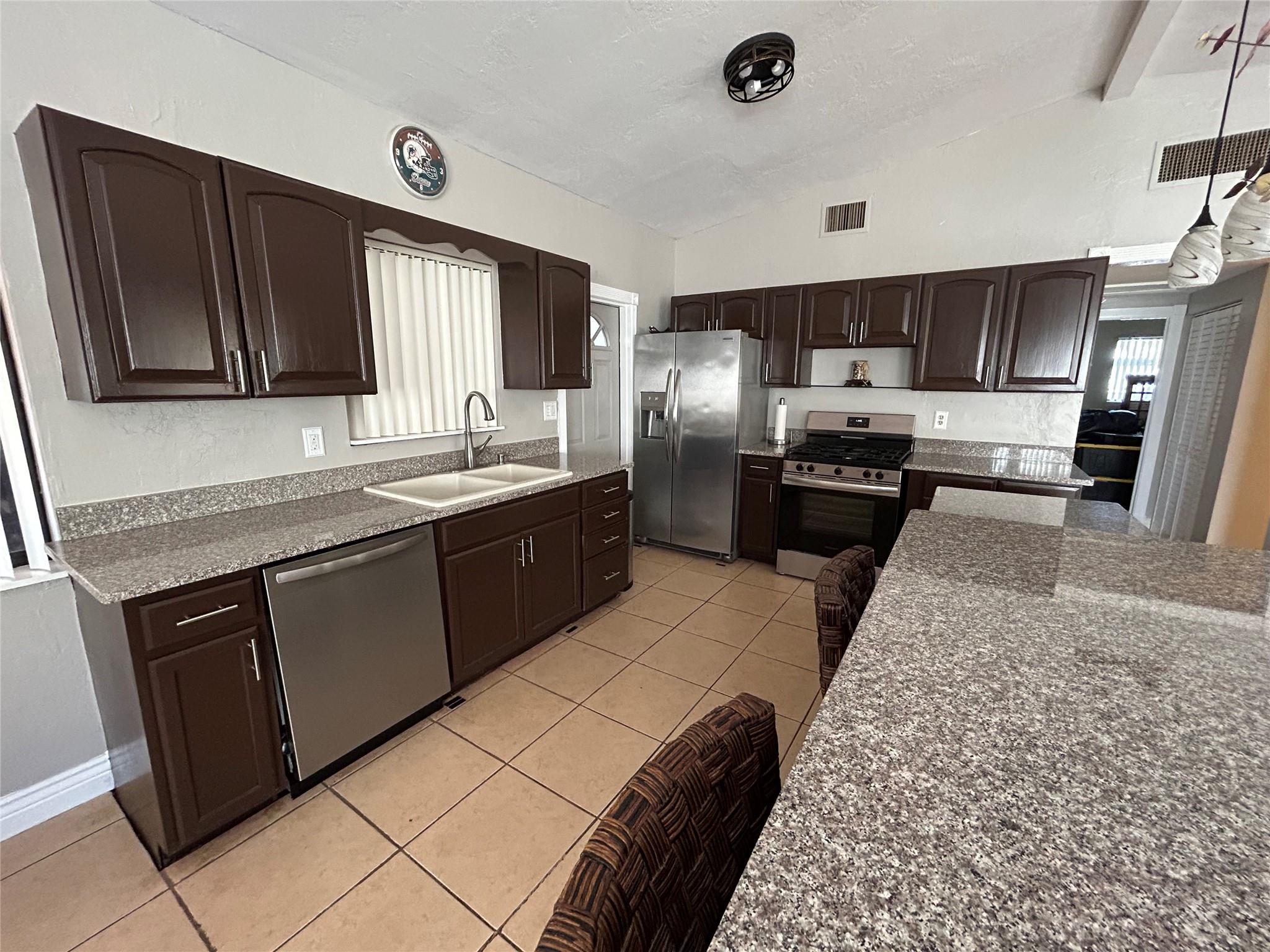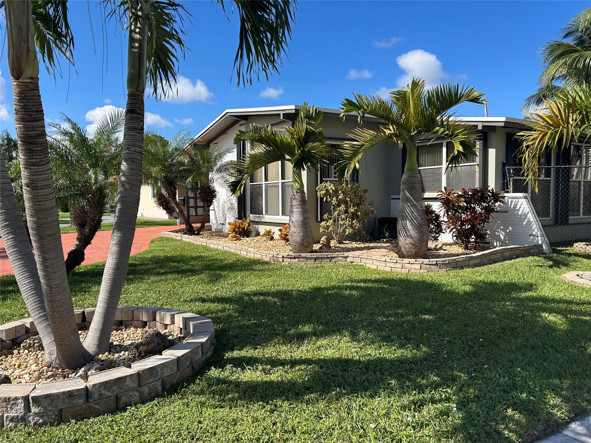 Imagine yourself living in this charming light -filled 2 bedroom 2 bath open concept and vaulted ceiling home , situated East of US1 , 1 mile from the beach and shopping malls . This home is tiled throughout except for pristine carpeting in the large master bedroom with a beautiful remodeled bathroom and a large tiled guest room lodging an adjacent bathroom with a bathtub shower combination . This property offers a brand new roof (2024), new AC (2023) , new gas water heater (2023) , new gas range (2024) , washer , dryer and refrigerator (2021 ) , ample mature palm trees, an enclosed shed , plenty of space for a beautiful pool on a corner lot !! Don't miss out on this great opportunity !!