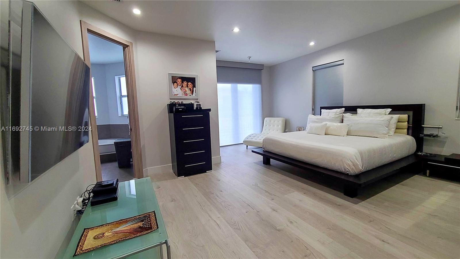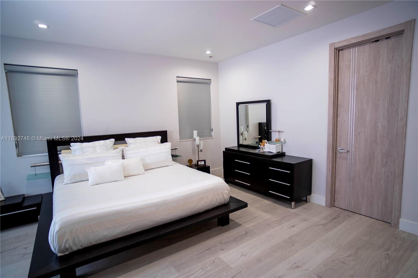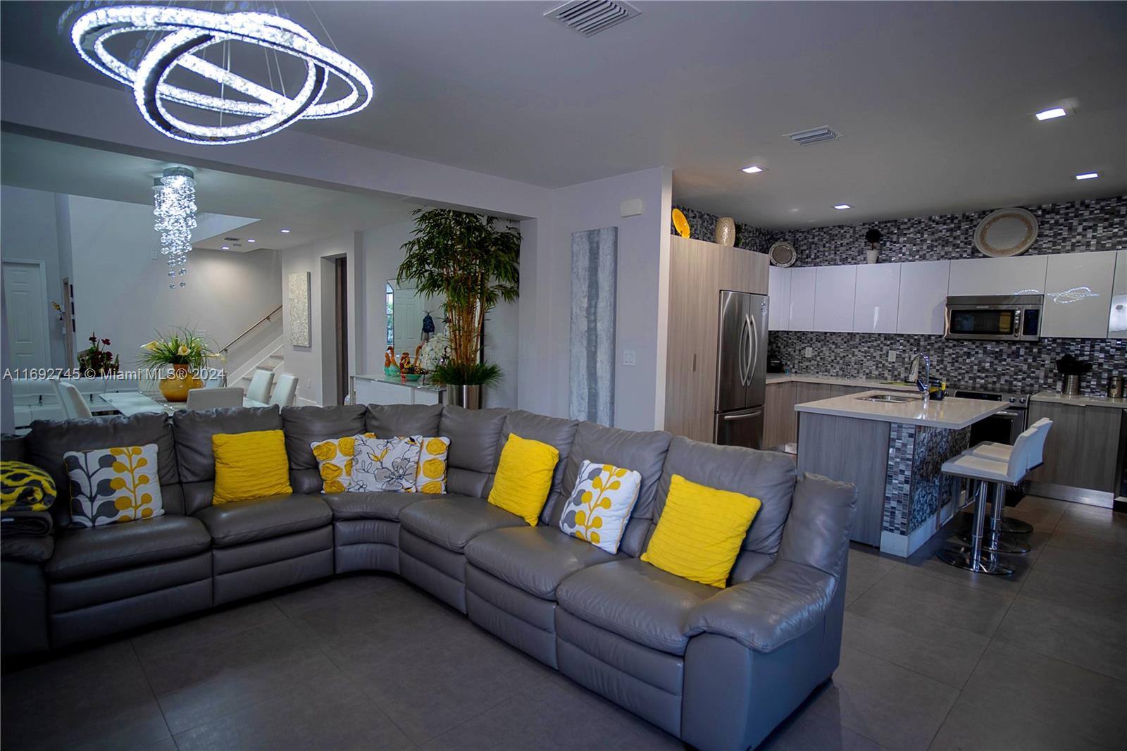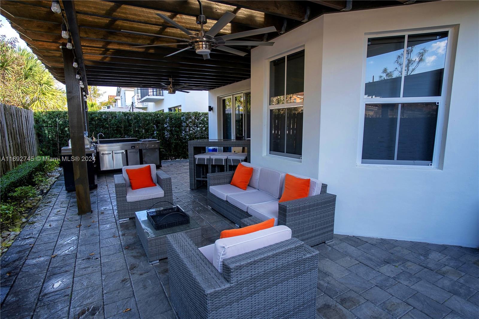 The property description in the image reads: **Dream Home Turnkey** This stunning property features 4 bedrooms and 4 bathrooms, all meticulously updated for modern living. Enjoy the elegance of Spanish porcelain flooring on the first floor and stylish glass staircase railings. The home boasts 8-foot high Italian doors and a beautifully redesigned kitchen. The second floor is enhanced with luxury waterproof vinyl throughout. Step outside to your private patio, complete with a pergola and barbecue area with built-in speakers—perfect for entertaining. Residents also have access to a Clubhouse that includes a gym, pool, and BBQ area, all within a secure, gated community. Please note that furniture is sold separately. For showings, kindly give 24 hours' notice.