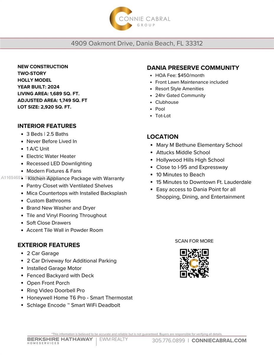 Welcome to Dania Preserve, Dania Beach’s newest gated community! This modern 3-bedroom, 2.5-bathroom home features an open-concept layout with high-end finishes, abundant natural light, and a private fenced backyard ideal for entertaining. Enjoy peace of mind with gated entry and low-maintenance living in a newly developed neighborhood. Located just minutes from I-95, the Turnpike, and Dania Pointe, with access to premier shopping, dining, and entertainment. Only 10 minutes to the beach and 15 minutes to Downtown Fort Lauderdale. This is a rare opportunity to enjoy new construction in Dania Beach with unmatched convenience and lifestyle access throughout Broward County.