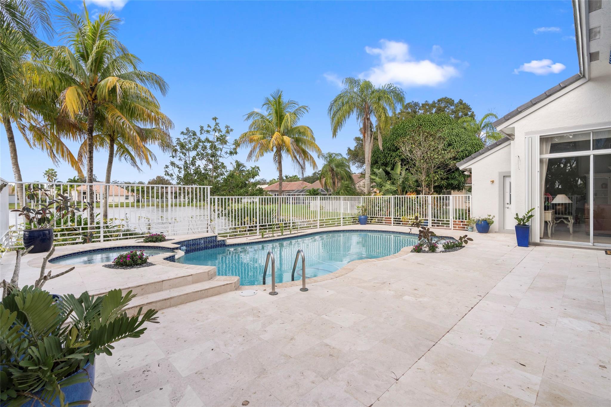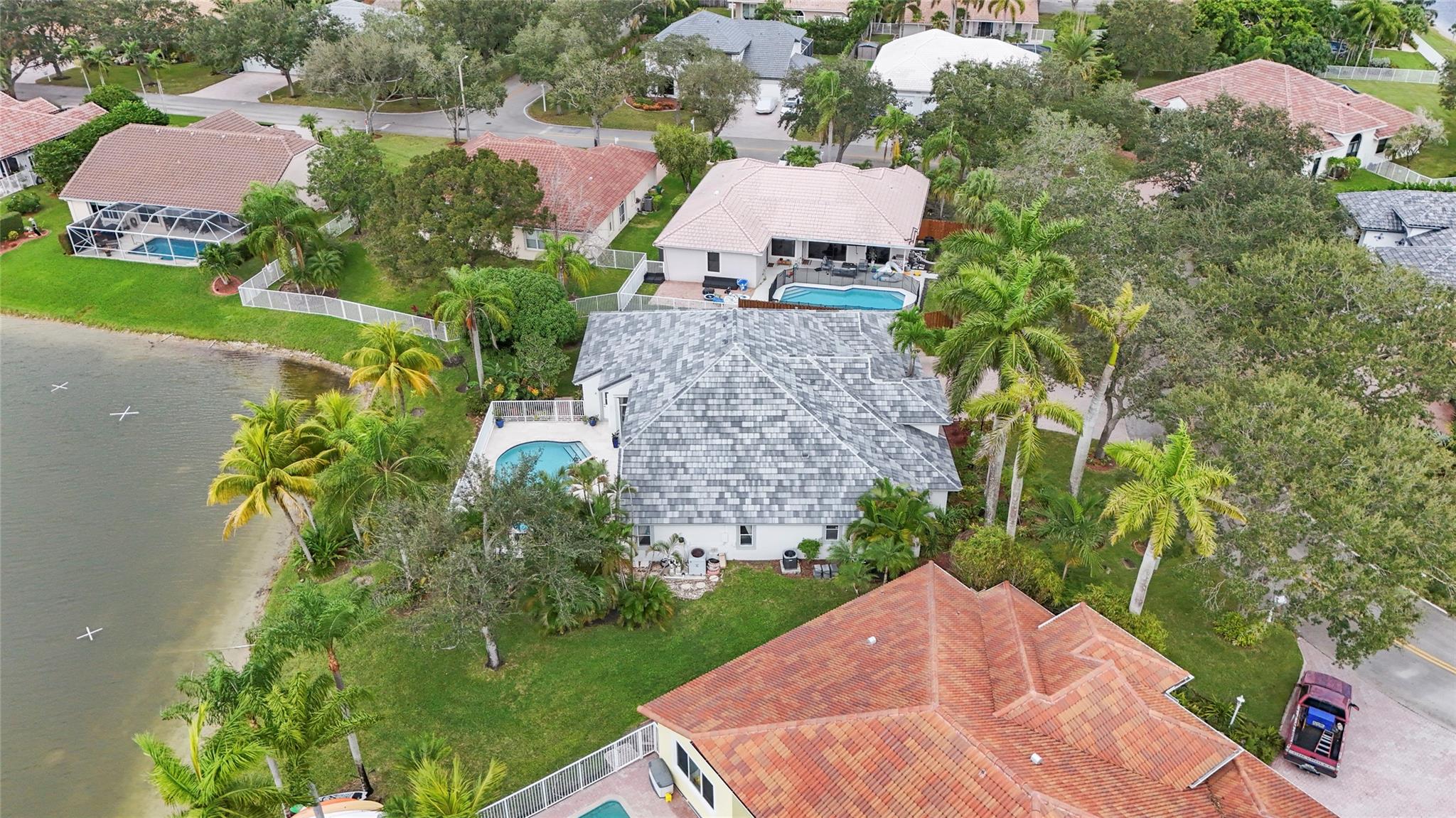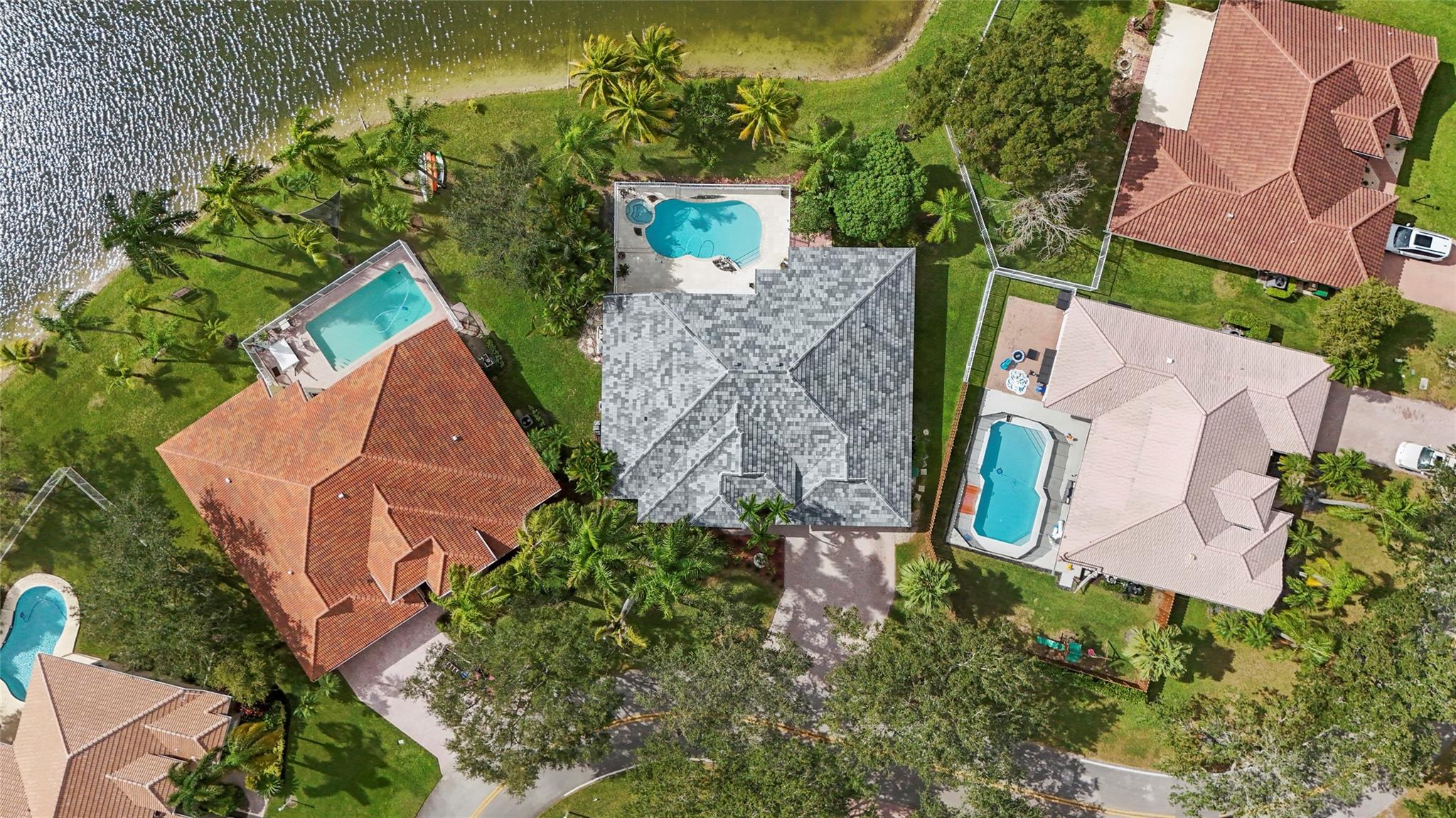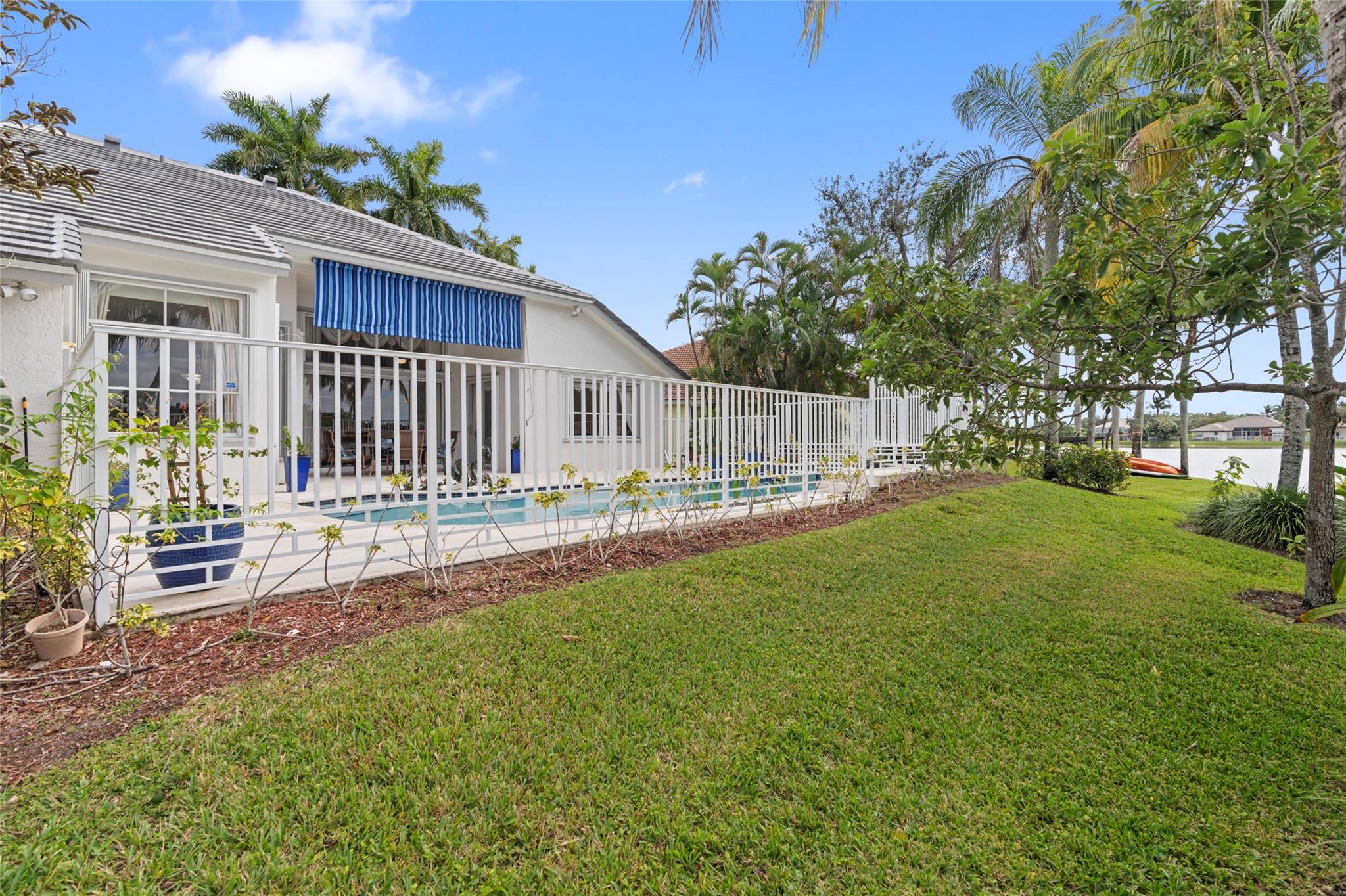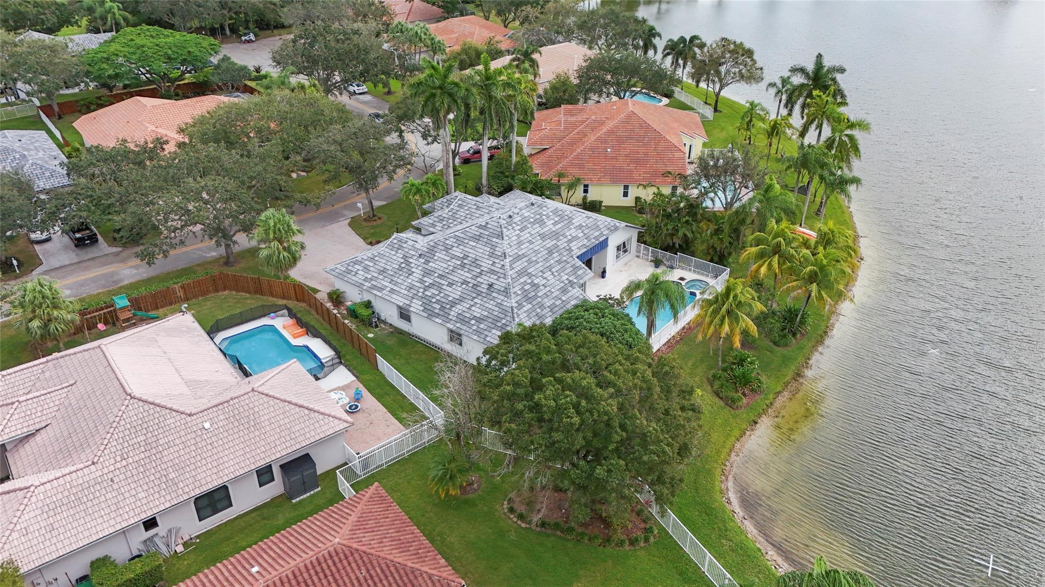 Elegant 5 BR pool home on super wide oversized lot w long lake views. New 2023 roof w 10 yr warranty. Largest 1 story plan built w spacious estate style layout & big lakeside yard. Foyer entry, volume ceilings, marble floors throughout the main living areas, big formal dining & living room, open kitchen w granite counters, elegant & modern white gloss cabinetry w pantry wall, cafe nook overlooks pool & lake. Big family room, perfect for the largest gatherings. Spacious master suite & bath w walk-in closets, 5th BR/den & 1/2 BTH, split bedroom wing, good sized BR# 3-5 & 2 baths. Free form pool w raised spa, sun deck w patio awning, tropical landscaping & fruit trees. Walk to A rated elementary school. Gated community w tennis, playground, all lots are a minimum of 90 ft wide, low HOA dues.