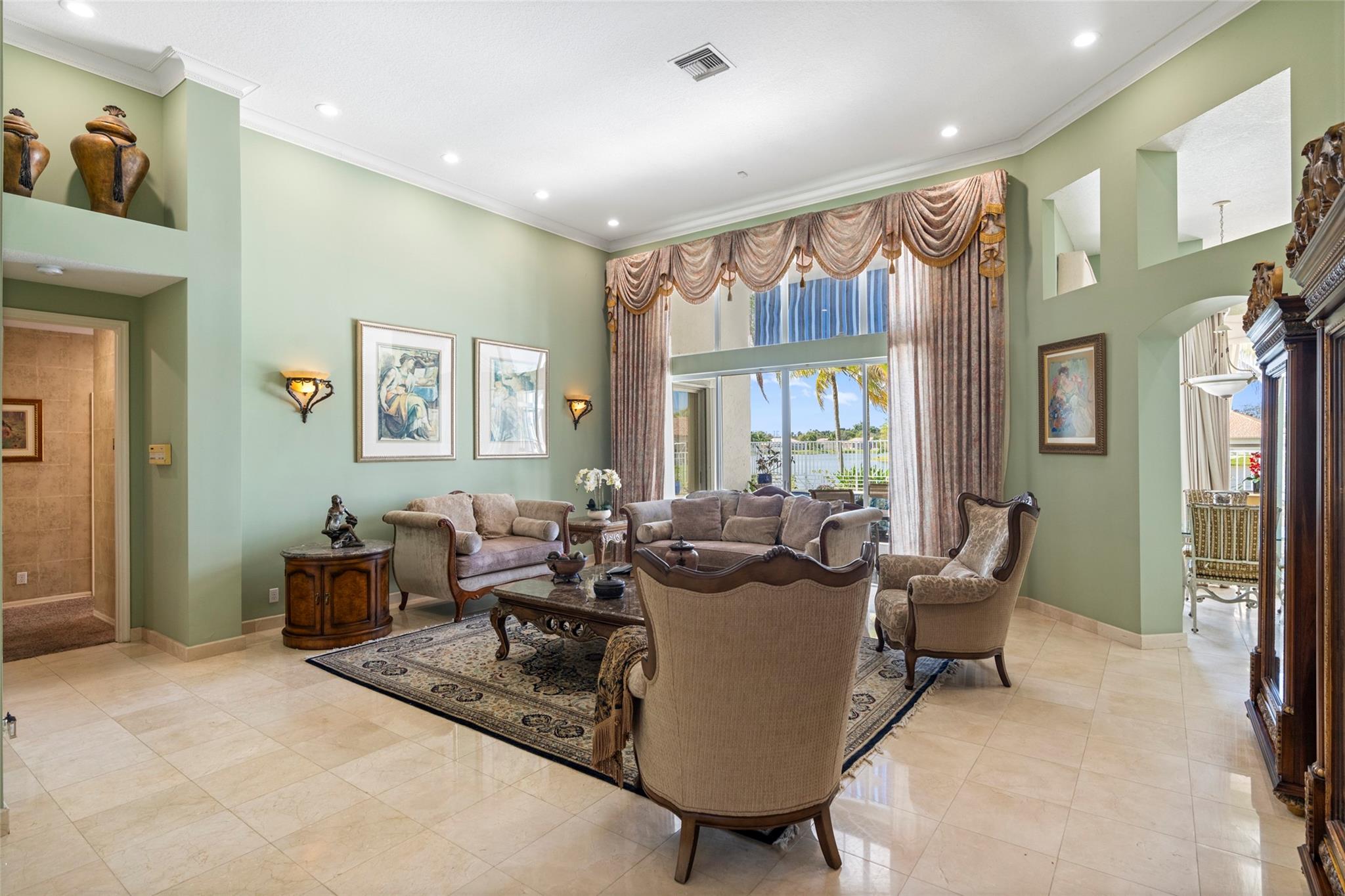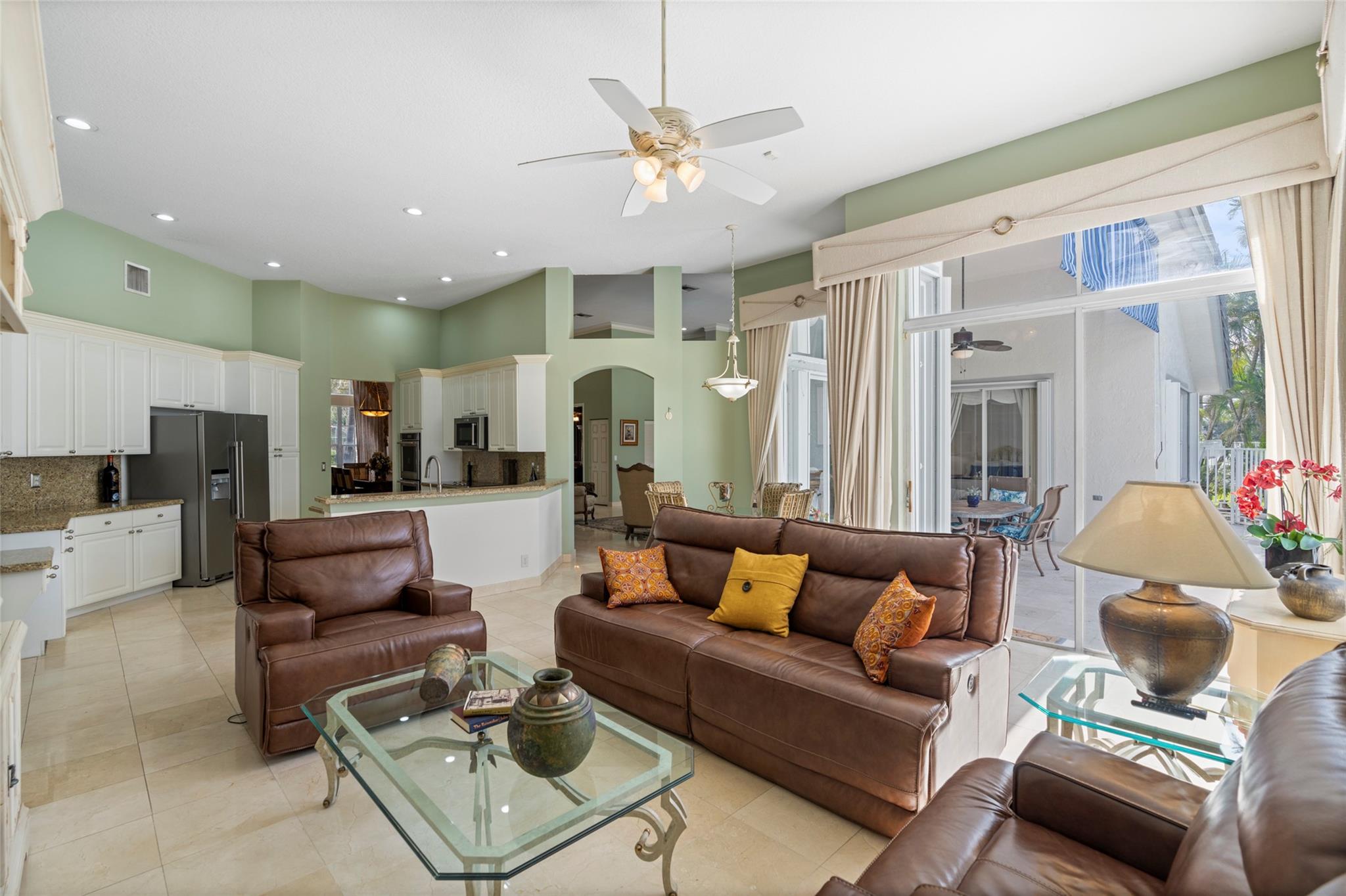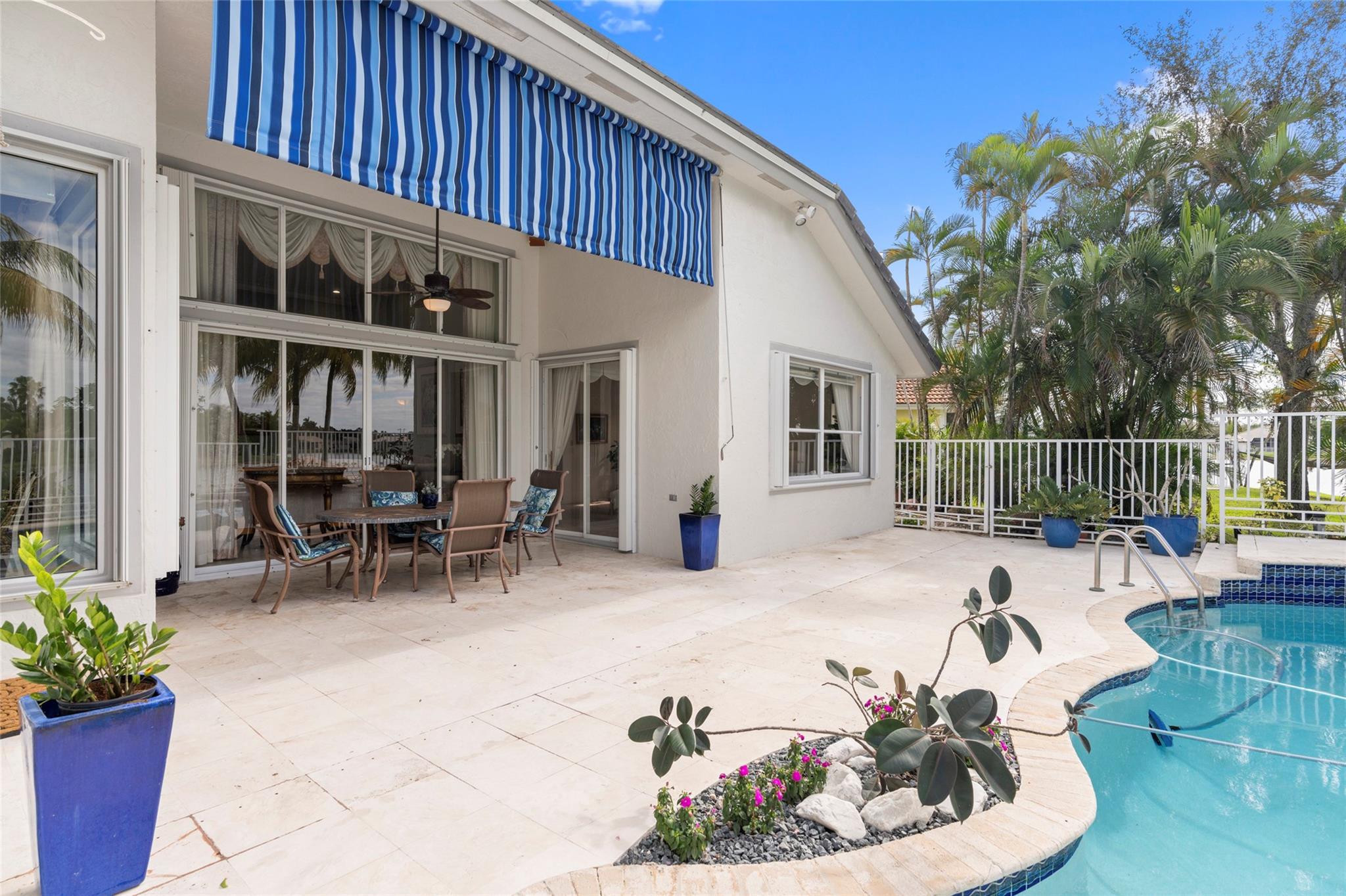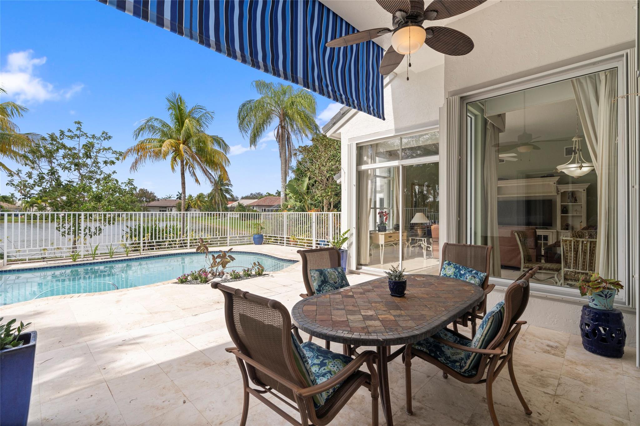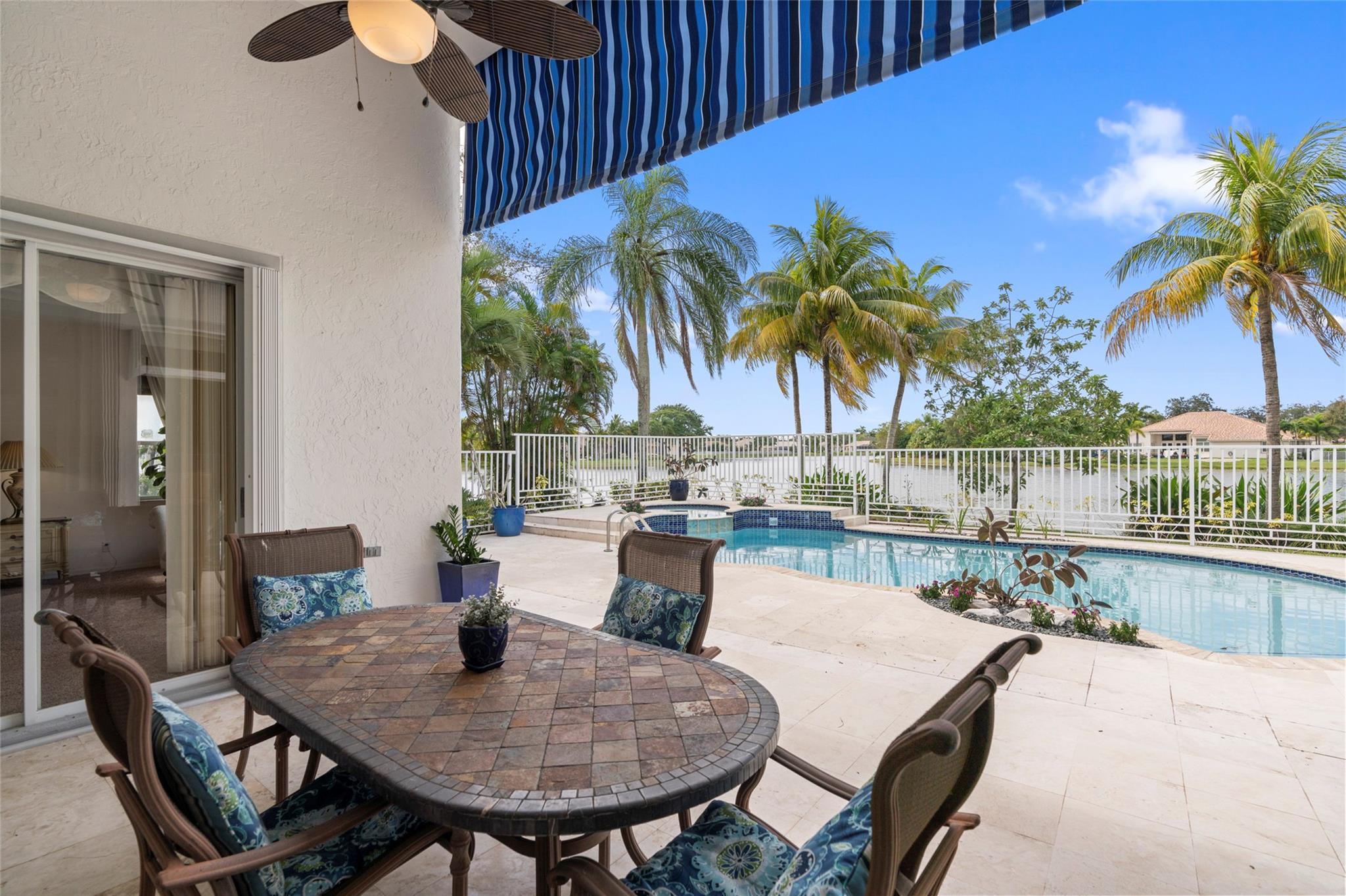 Elegant 5 BR pool home on super wide oversized lot w long lake views. New 2023 roof w 10 yr warranty. Largest 1 story plan built w spacious estate style layout & big lakeside yard. Foyer entry, volume ceilings, marble floors throughout the main living areas, big formal dining & living room, open kitchen w granite counters, elegant & modern white gloss cabinetry w pantry wall, cafe nook overlooks pool & lake. Big family room, perfect for the largest gatherings. Spacious master suite & bath w walk-in closets, 5th BR/den & 1/2 BTH, split bedroom wing, good sized BR# 3-5 & 2 baths. Free form pool w raised spa, sun deck w patio awning, tropical landscaping & fruit trees. Walk to A rated elementary school. Gated community w tennis, playground, all lots are a minimum of 90 ft wide, low HOA dues.