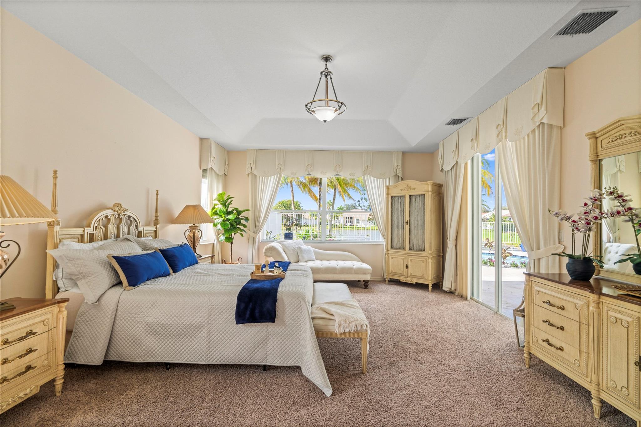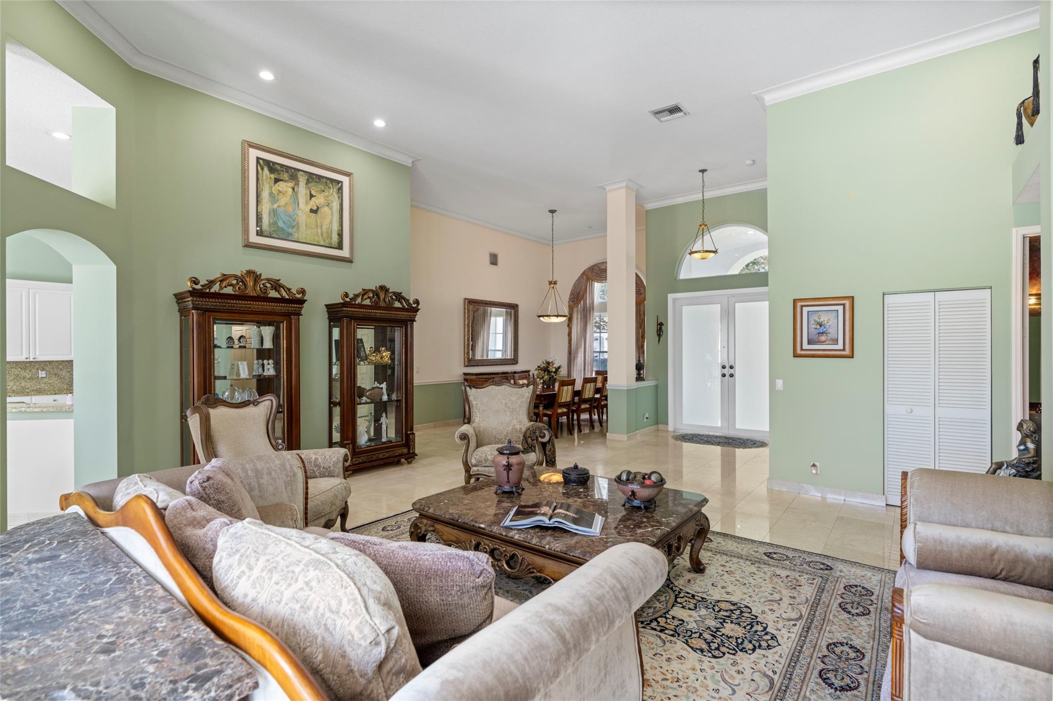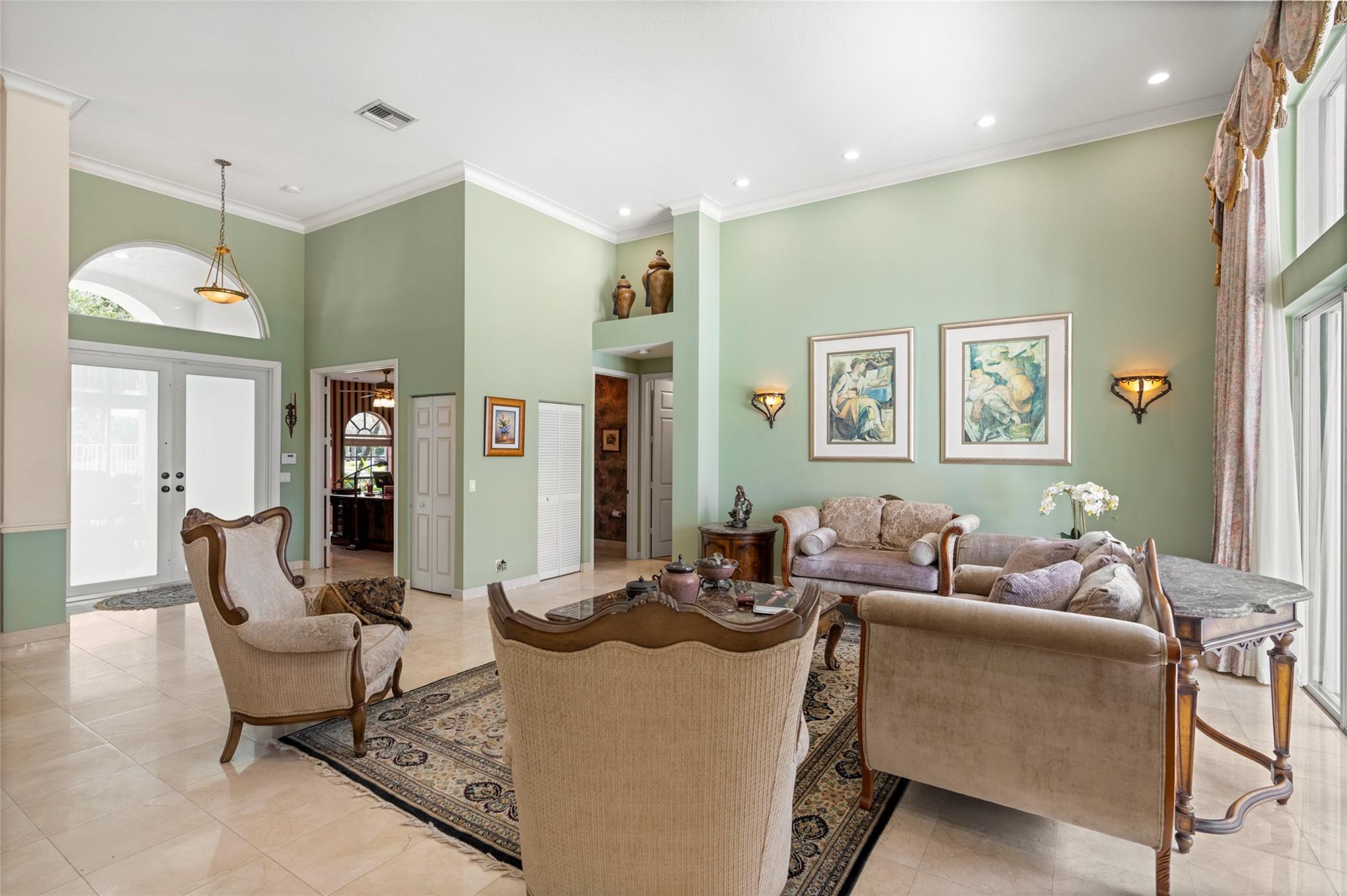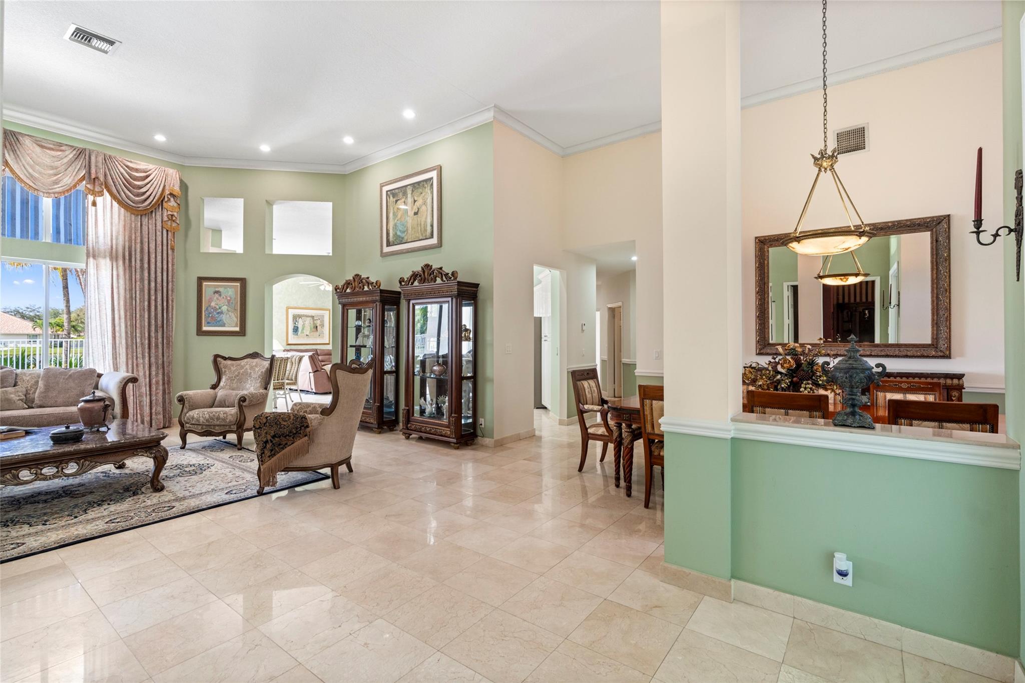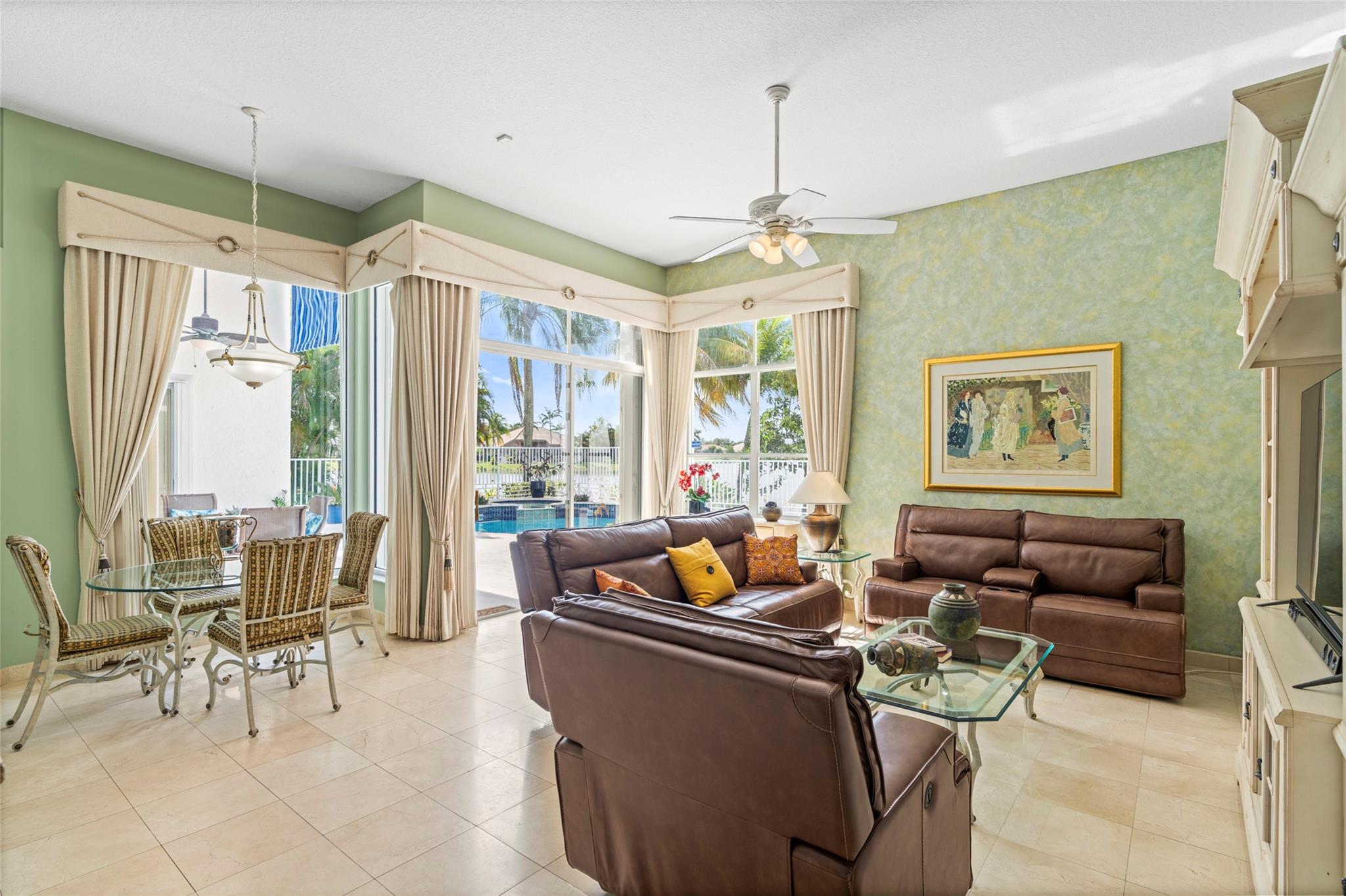 Elegant 5 BR pool home on super wide oversized lot w long lake views. New 2023 roof w 10 yr warranty. Largest 1 story plan built w spacious estate style layout & big lakeside yard. Foyer entry, volume ceilings, marble floors throughout the main living areas, big formal dining & living room, open kitchen w granite counters, elegant & modern white gloss cabinetry w pantry wall, cafe nook overlooks pool & lake. Big family room, perfect for the largest gatherings. Spacious master suite & bath w walk-in closets, 5th BR/den & 1/2 BTH, split bedroom wing, good sized BR# 3-5 & 2 baths. Free form pool w raised spa, sun deck w patio awning, tropical landscaping & fruit trees. Walk to A rated elementary school. Gated community w tennis, playground, all lots are a minimum of 90 ft wide, low HOA dues.
