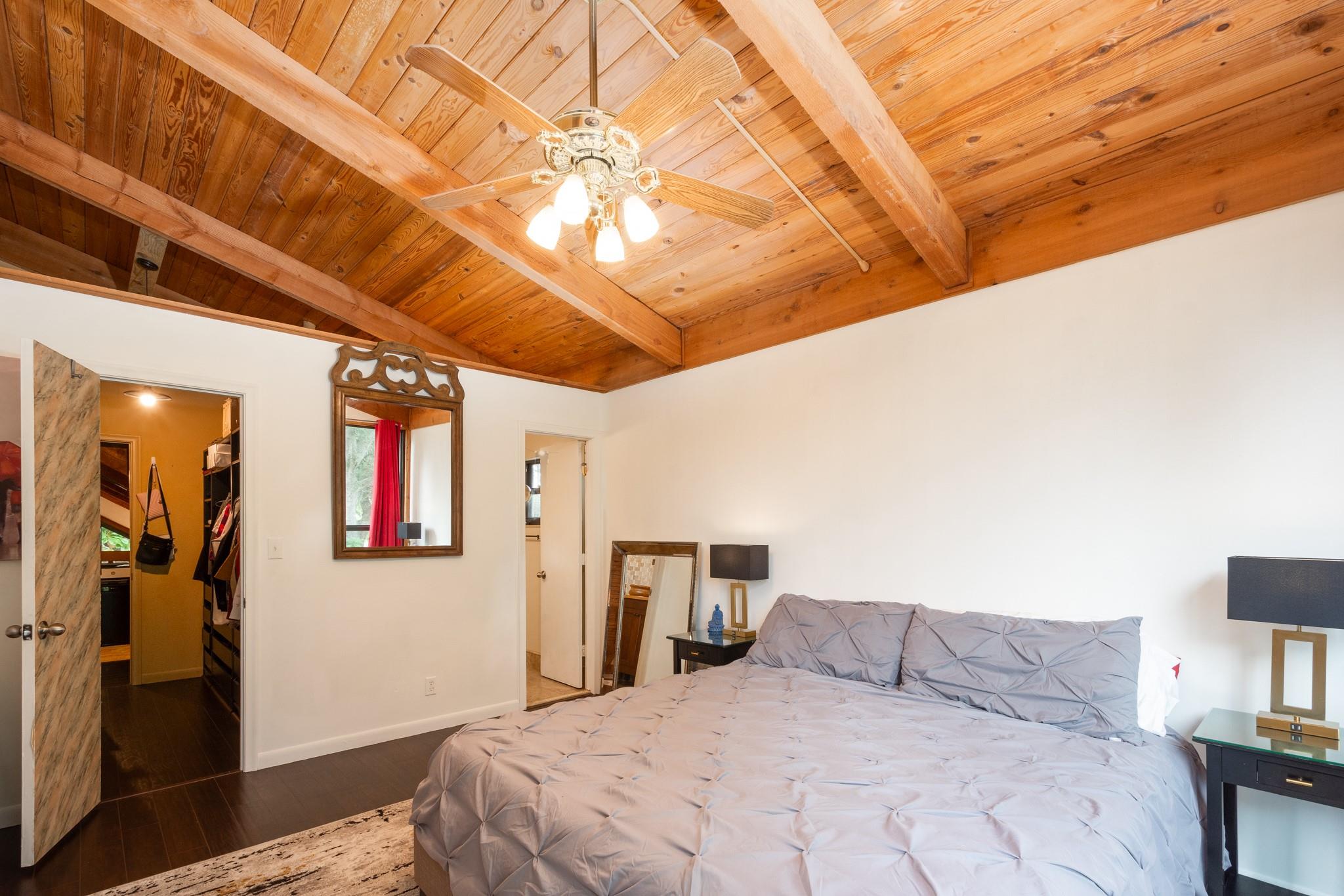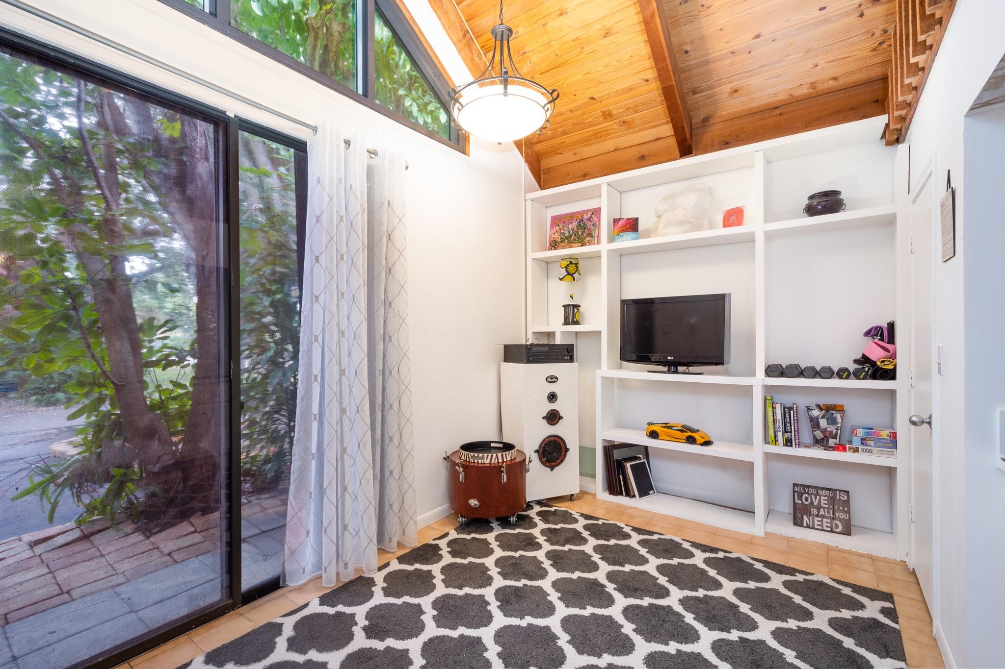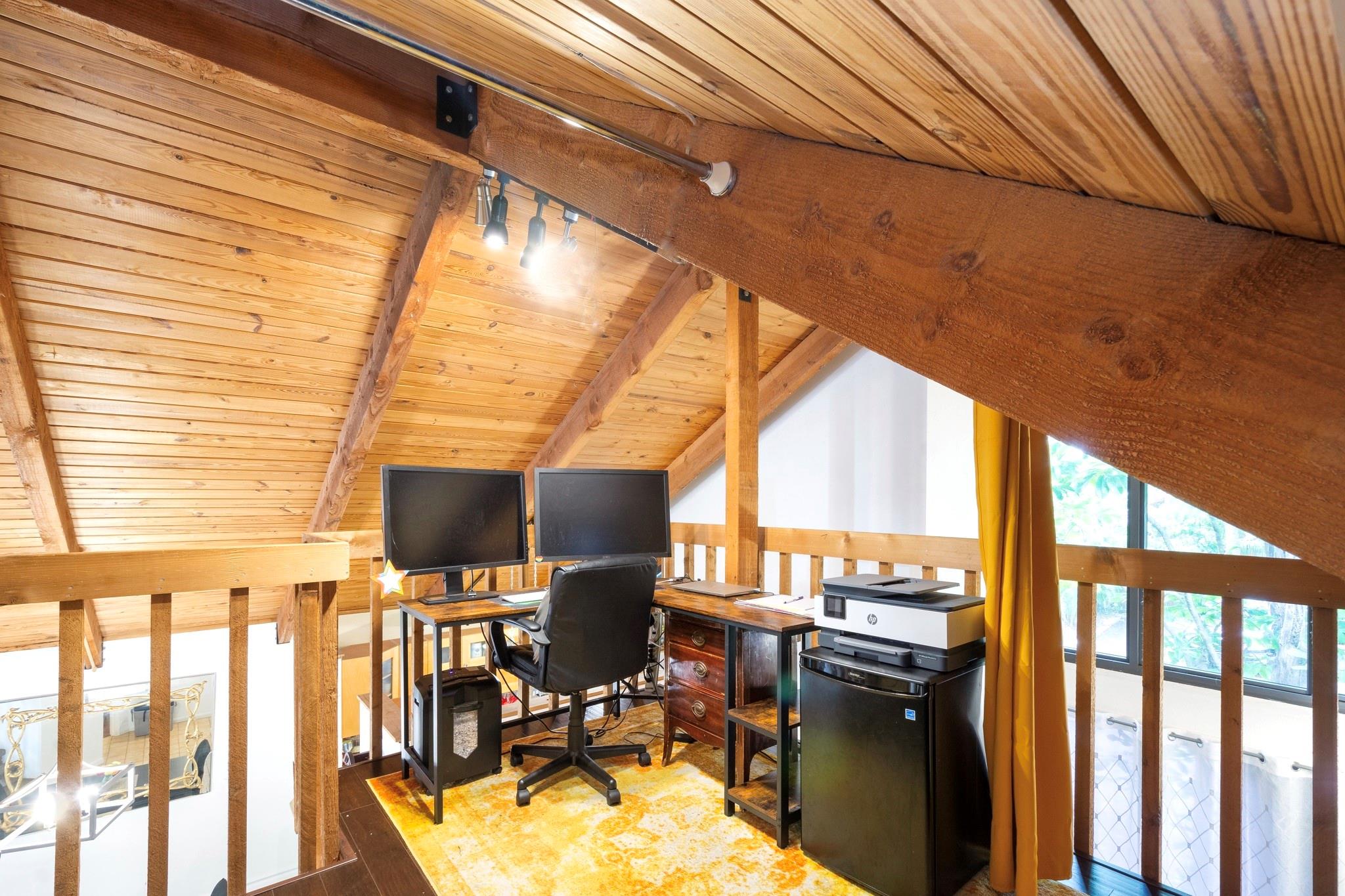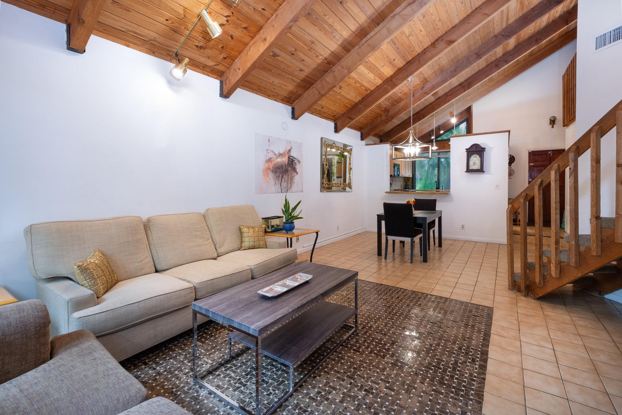 Discover this highly sought-after, two-story home in the desirable Lofts of Palm-Aire Village. Situated on a corner, this 3 bedroom 2 bathroom loft home offers vaulted ceilings with exposed beams and a tongue & groove ceiling, a spacious master suite with walk-in closet and en-suite bath, and a flexible loft space perfect for an artist's studio or office. The updated kitchen features granite countertops, and hi-end cabinets and appliances including a new washer/dryer. New impact windows/shutters throughout, newer A/C, electrical, & sprinkler system. Property has a private fenced yard with fruit trees, a patio & shed, and two designated parking spaces. Community amenities include a heated pool, tennis and handball courts, picnic areas, and dog parks and HOA fee is a low $100/mo!