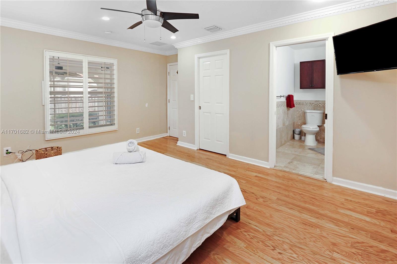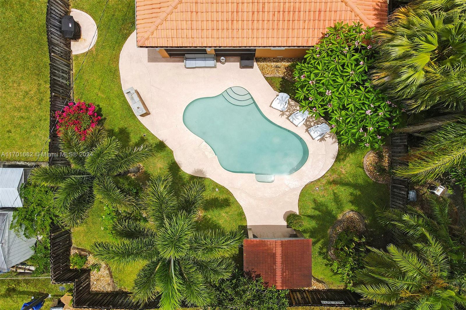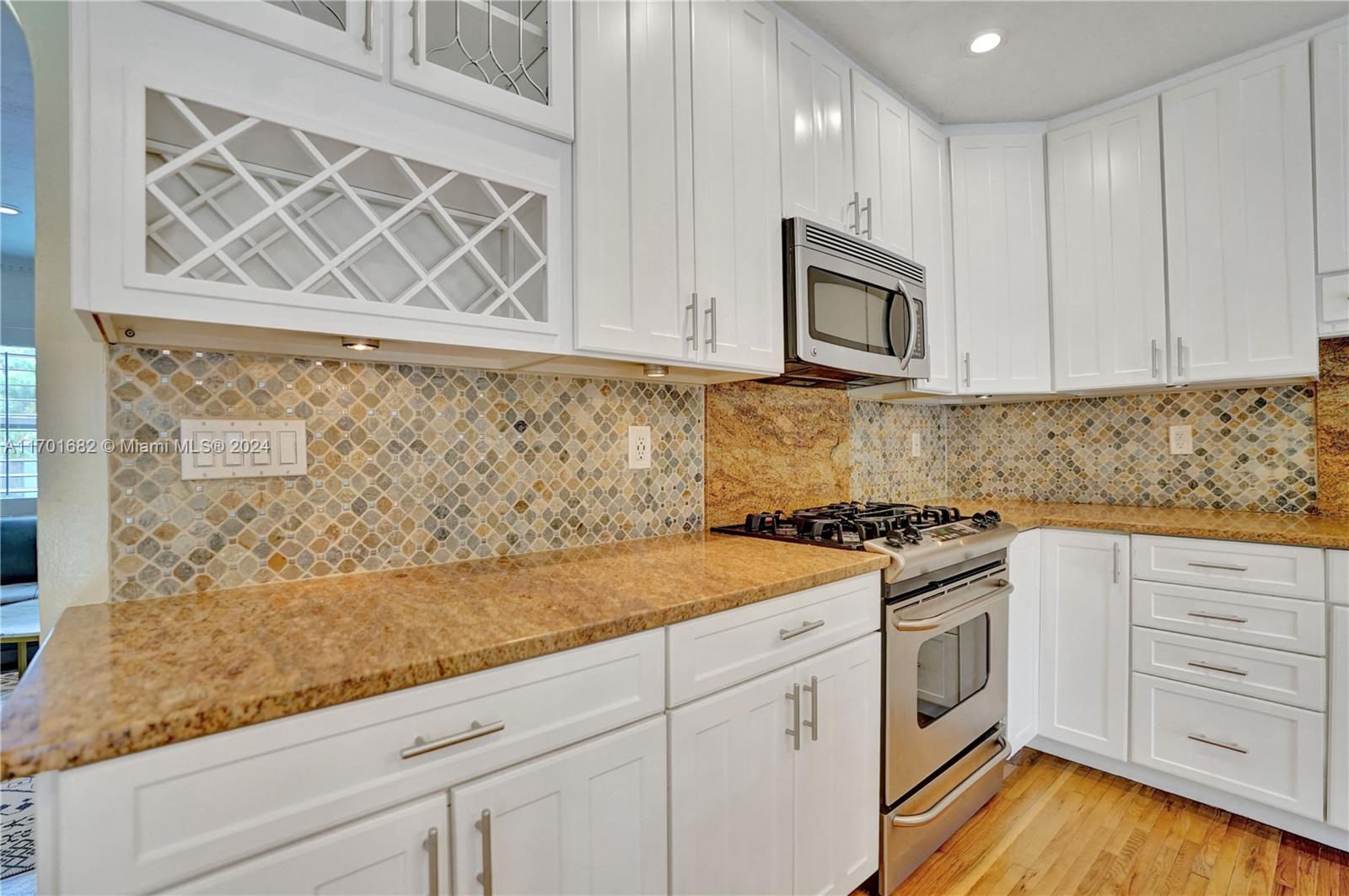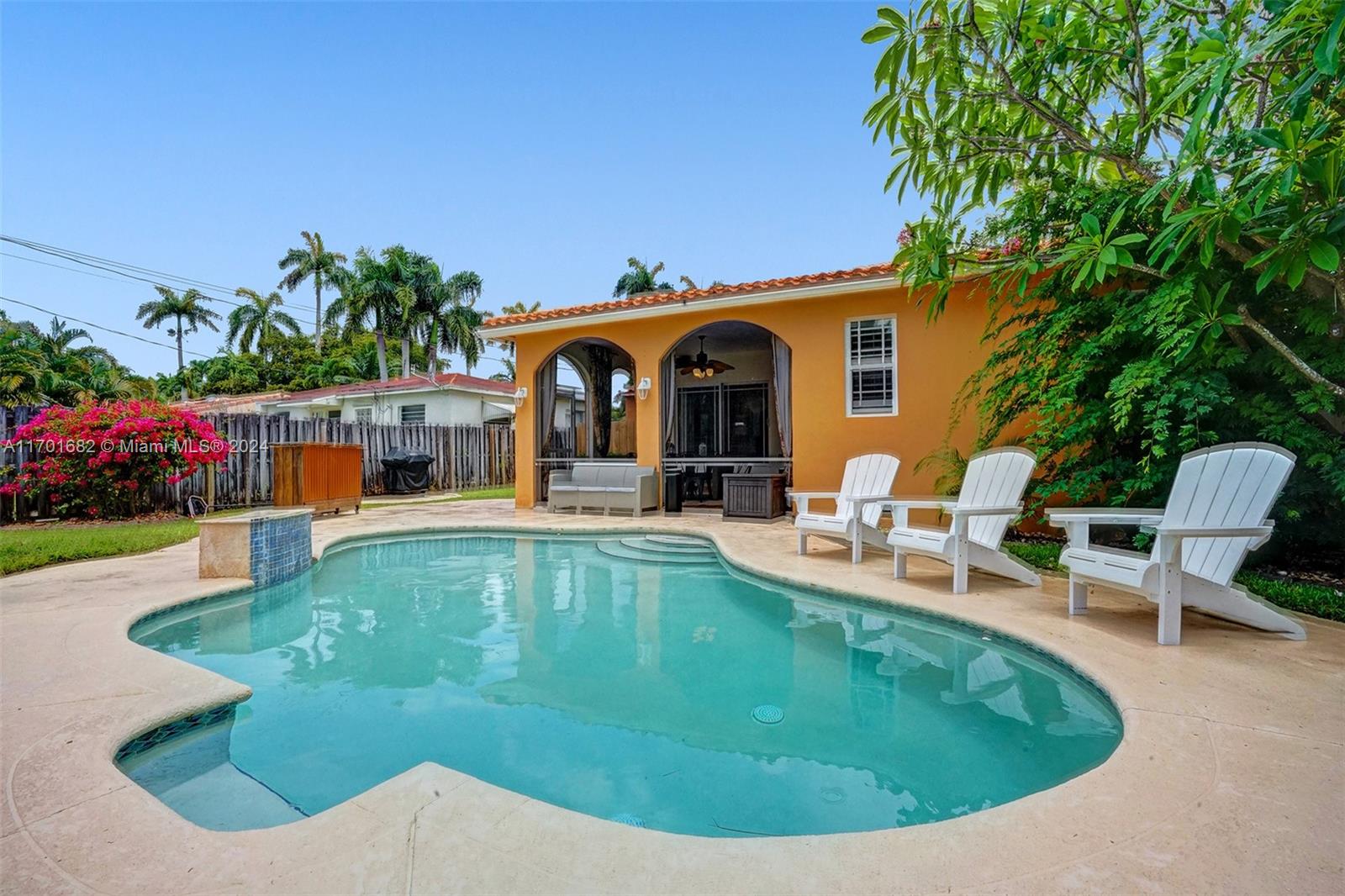 This spacious, 3-bed, 2-bath home offers a split floor plan and a one-car garage. Enjoy a heated pool, impact windows, and a stylish kitchen featuring S/S appliances, a mosaic tile backsplash, and granite countertops. Original crown molding adds charm to the living, dining, and kitchen areas, while the main bedroom includes a large walk-in closet with custom shelving. The primary bath features a porcelain-tiled shower with a mosaic accent and a glass door. Unwind in the Florida room or under the covered patio with elegant arches, ideal for entertaining. Additional highlights include a gazebo, circular driveway, tankless gas water heater, and plantation shutters in select bedrooms. One bathroom includes a shower/tub combo. Located Just minutes from beaches, downtown, golf, and more.