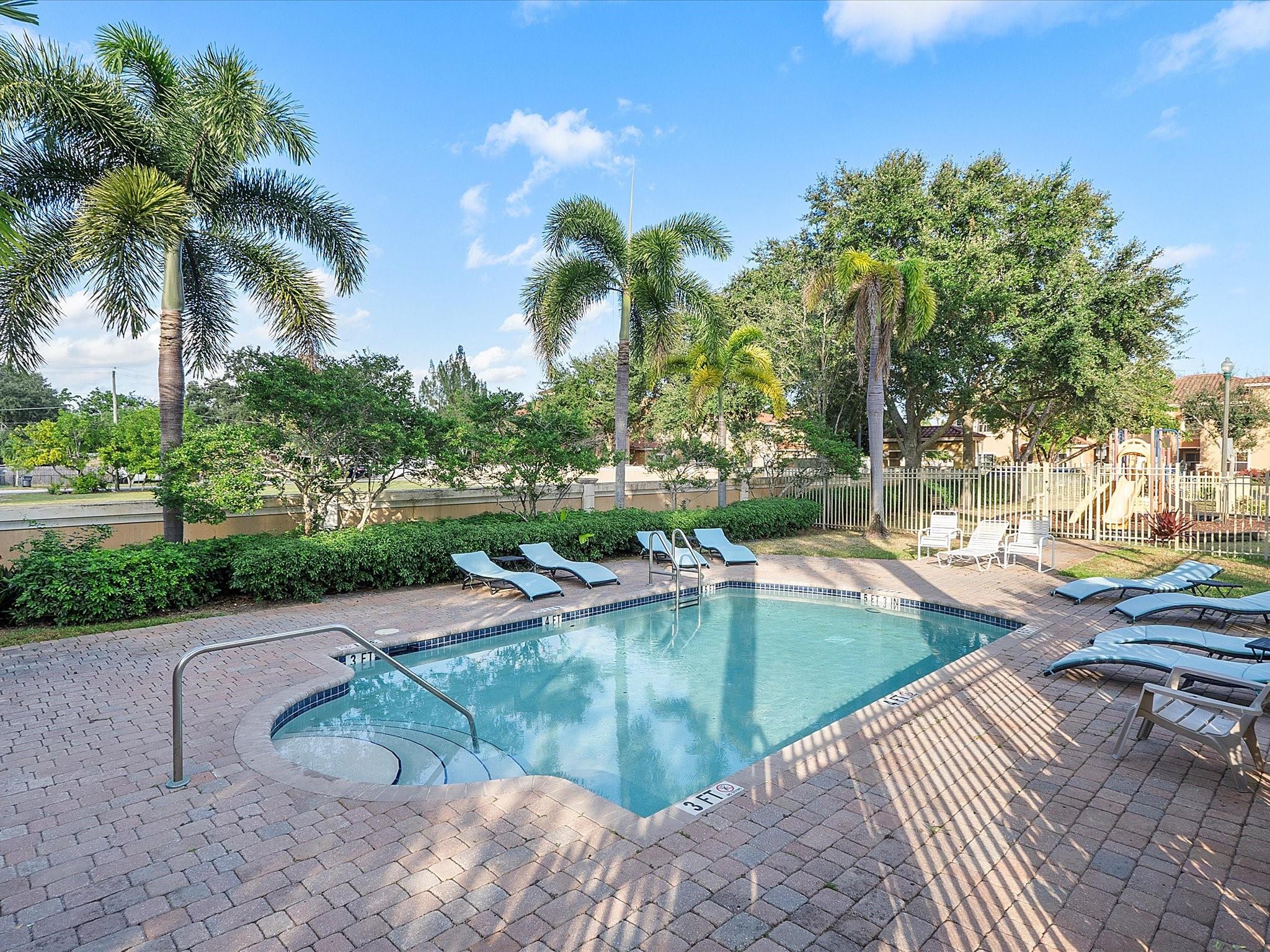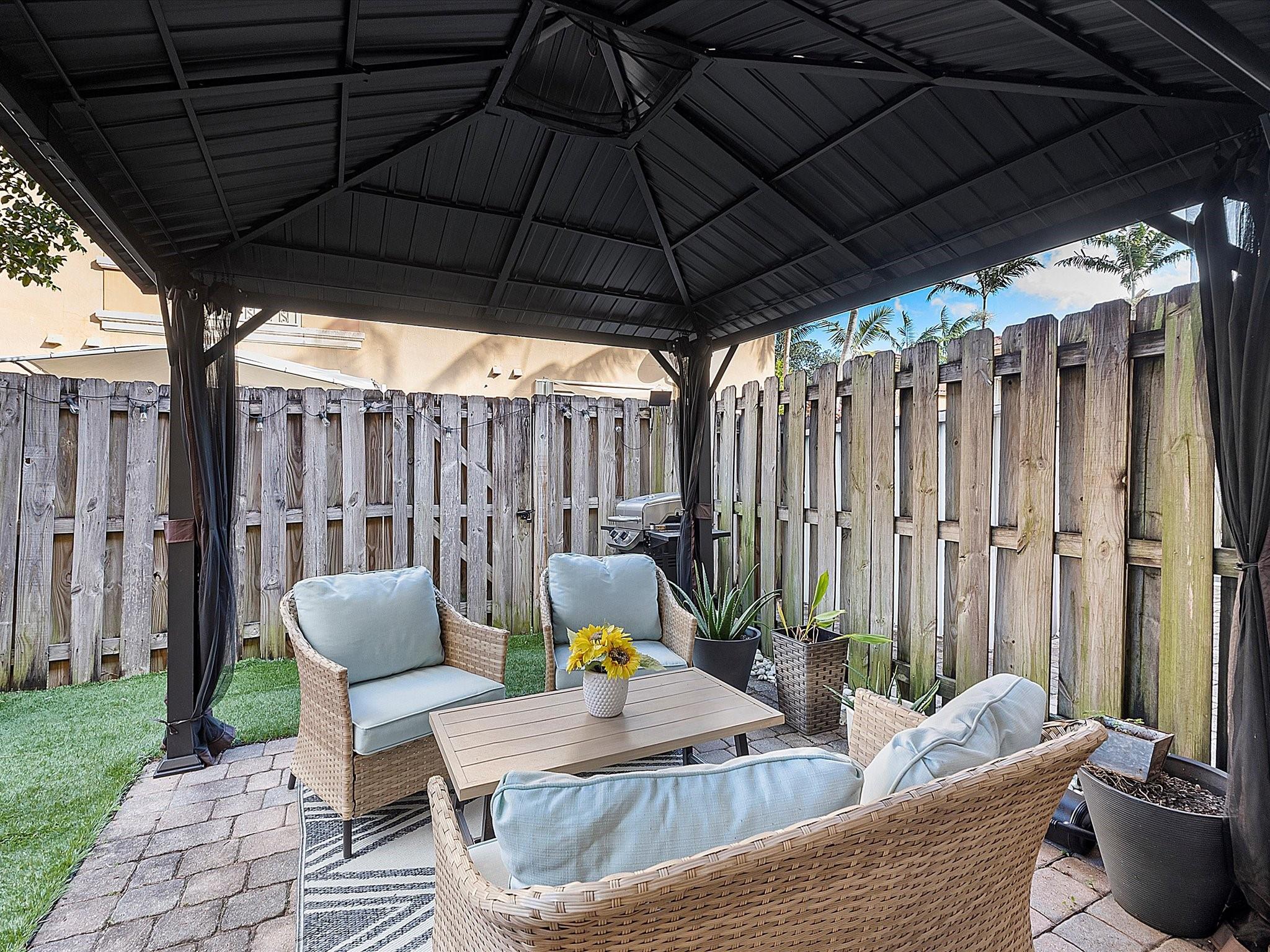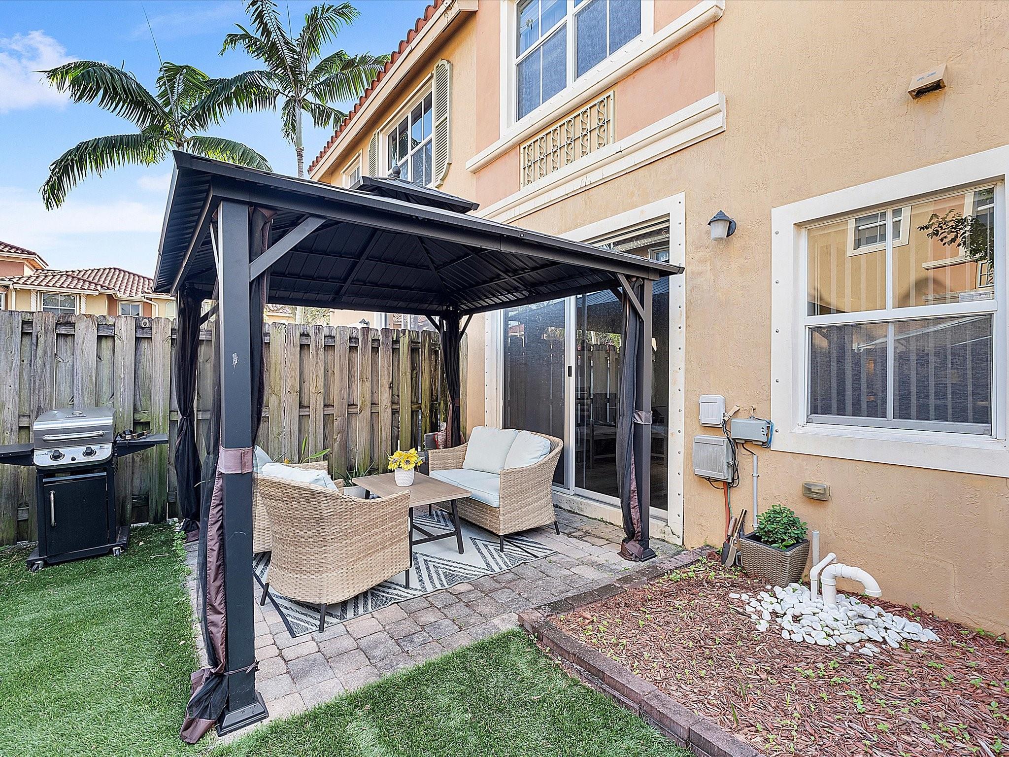 Spacious move-in ready 3 bedroom 2 1/2 bath townhouse in the highly sought-after Siena Community of Hollywood. It features porcelain tile flooring, a spacious 1st floor with 2 living spaces & 1/2 bath, an expansive laundry/utility room, a private courtyard entrance, a fenced garden, and a pavered patio with a high-end metal gazebo. The sunny kitchen offers ample storage, stainless steel appliances, and is open to the dining area. All bedrooms are upstairs where the Primary Suite has a double vanity ensuite and walk-in closet. This well-maintained community has one of the lowest maintenance fees you'll find and is close to schools, parks, shopping, dining & more.
