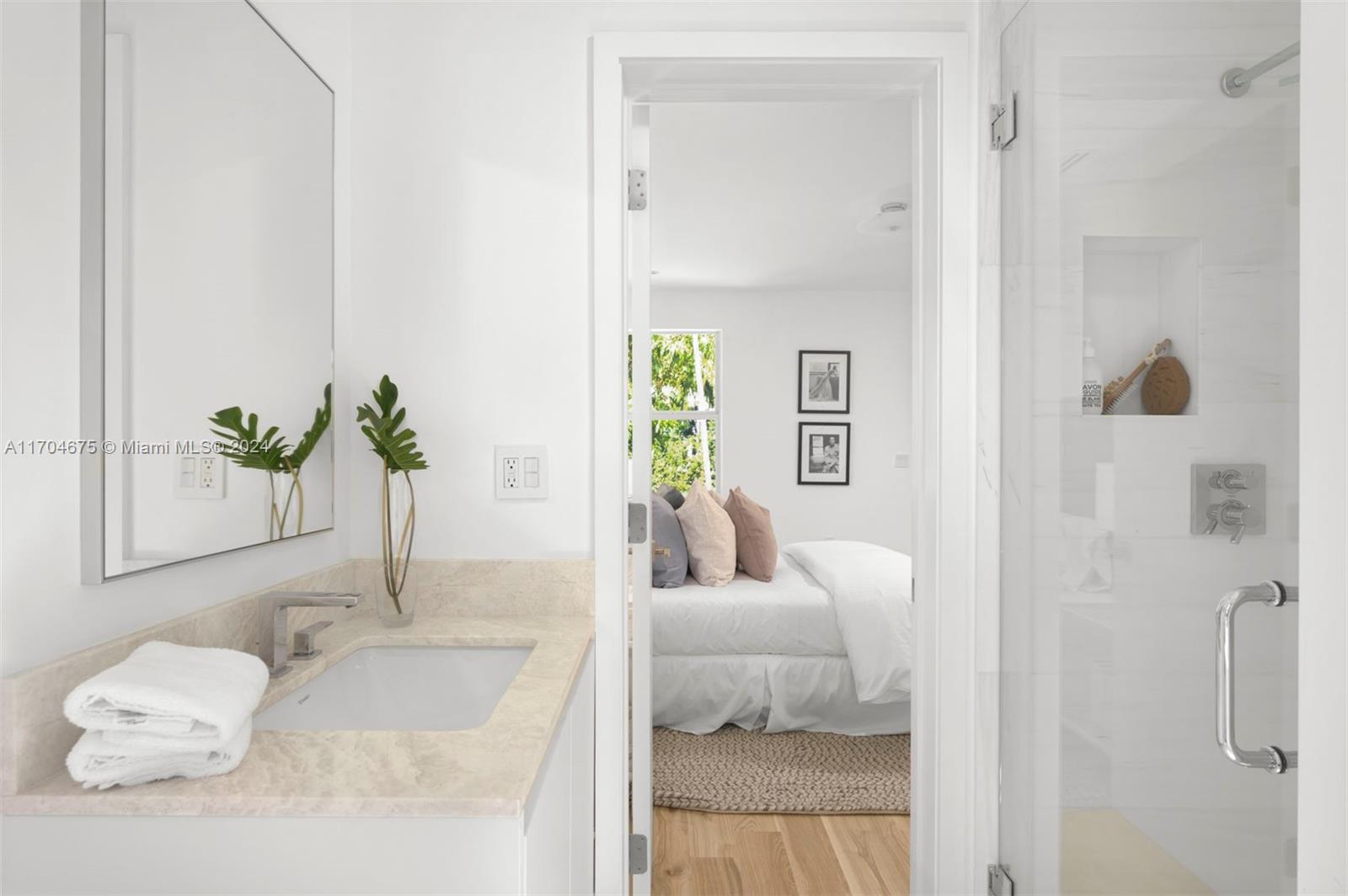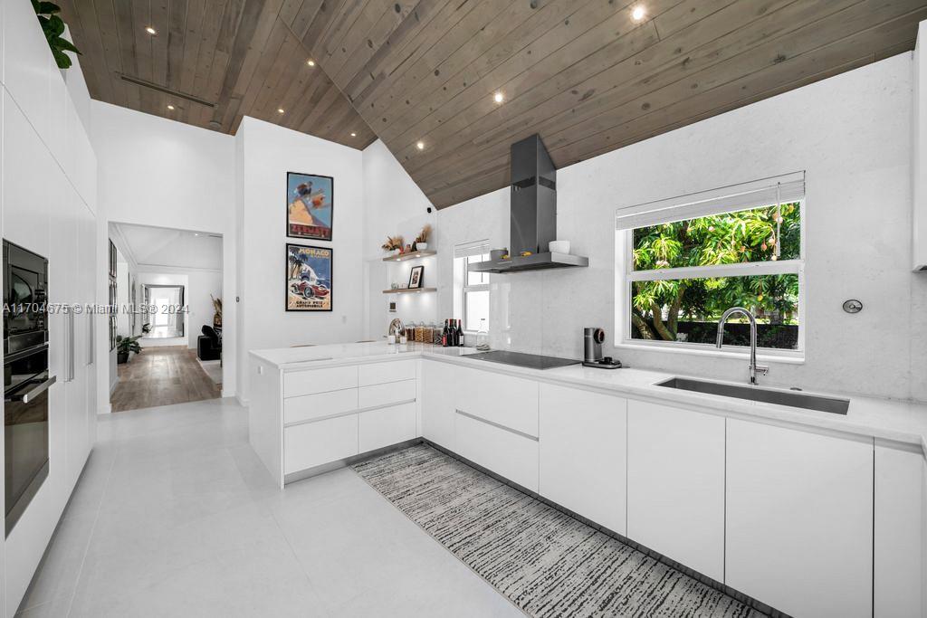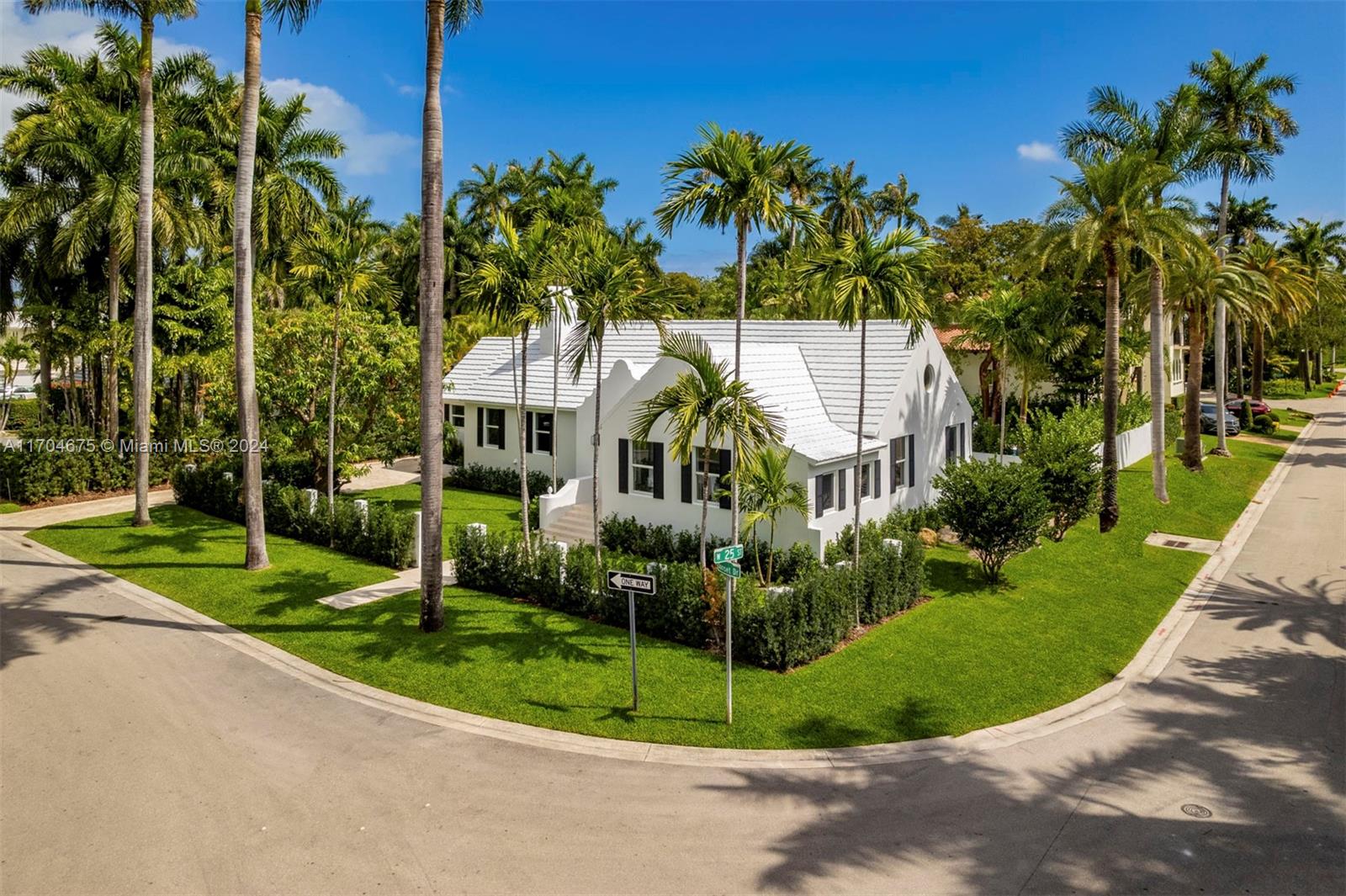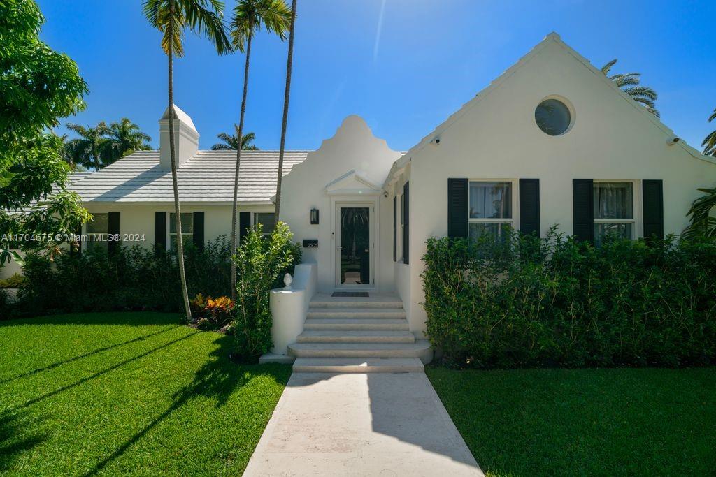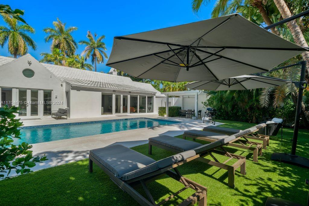 Experience coastal luxury in this fully renovated 4BR/4.5BA home on Sunset Island II. Nestled on a coveted corner lot directly across from a tranquil, palm-lined park, this turnkey residence welcomes you w/ soaring ceilings & sweeping views of the lush backyard, complete w/ an oversized sparkling pool. Natural light floods the home through hurricane-impact glass walls & doors, highlighting the spacious great room w/ a marble-clad fireplace & exposed wood beams that flow through the open floorplan. The custom-designed eat-in kitchen feature marble countertops & high-end Miele and Subzero appliances. The serene primary suite offering a spa-inspired bathroom w/ a large walk-in closet, dual-headed shower, dual sinks, a vanity area & French door that lead to the private pool & backyard paradise