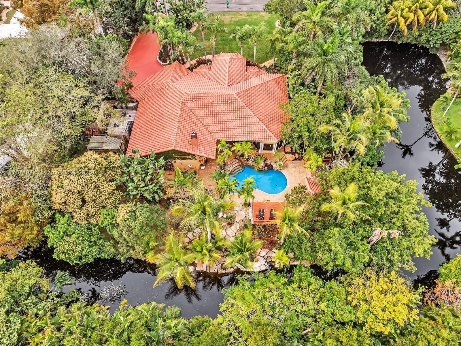 Nestled on a tropical waterfront .84 acre lot, this stunning custom-built Mediterranean-style home uniquely blends elegance & comfort. The thoughtfully designed floor plan includes 3 Bedrooms + Large Office, 2.5 Baths, and volume ceilings throughout. The private outdoor oasis features a sparkling freeform pool, outdoor shower, tiki bar, built-in BBQ area, expansive deck with a dock and hot tub overlooking the canal, & lush landscaping with fruit trees & exotic plants. Inside, the gourmet kitchen boasts Thermador appliances, custom wood cabinets & a spacious butler pantry. Relax by the wood-burning fireplace or host gatherings at the wet bar. With its balance of indoor & outdoor living, this private retreat is designed for unforgettable memories. NO HOA. NEW ROOF 2022. TWO NEW ACs.