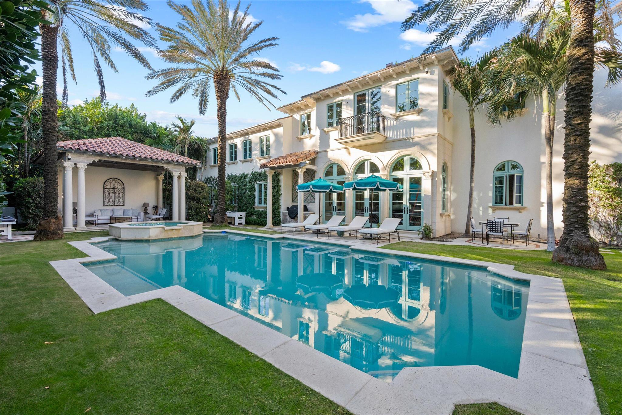 This luxurious Mediterranean oceanfront seven-bedroom estate has been beautifully renovated and is set on over half an acre offering stunning water views with a wealth of amenities for effortless coastal living. Curated by AD 100 designer Daniel Romualdez for gracious entertaining, it features an ocean-view living room with a gas fireplace, a club room with a full bar, a paneled oceanfront library, a day oceanfront living room, a formal dining room, a wood beamed entertainment room, and a gourmet chef's eat-in kitchen with a marble island, high end appliances, and a butler's pantry. Beachside enjoyment is elevated with covered loggias overlooking both the ocean and the pool, an expansive heated pool with a built-in spa, a cabana with a bath, and a shaded patio for poolside dining.