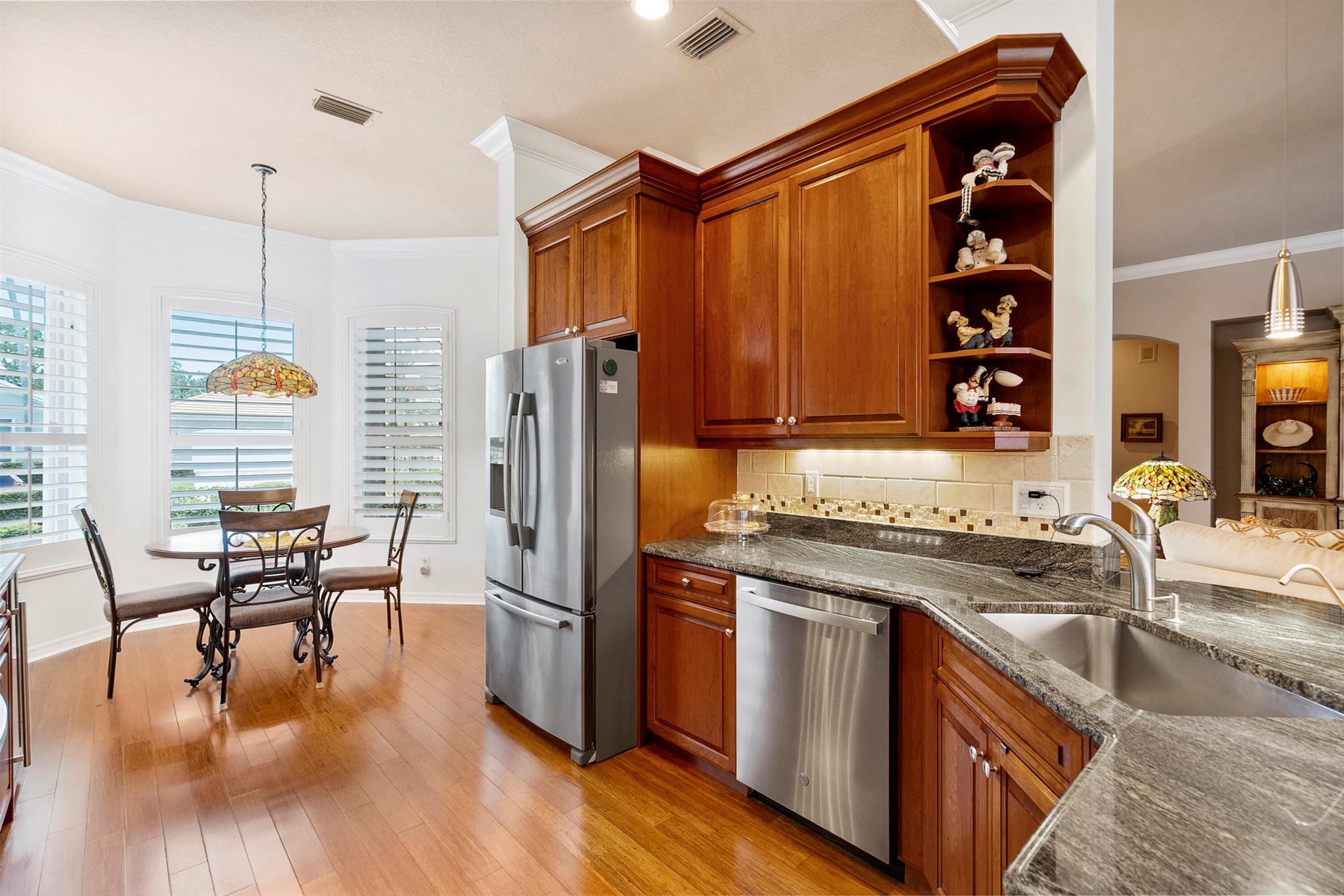 3BR, 2BH Pool home with larger Deck & Lake Views! 2-car garage home offers an open floor plan designed for easy living and entertaining. The freshly painted quality kitchen feature 42 in Cabinets with pull out drawers stunning bamboo wood floors, while crown molding adds a touch of elegance to every room. walk-in closets, providing ample storage space, and the spacious laundry room ensures convenience. Step outside to your own private oasis with a heated pool/ jacuzzi overlooking one of the many picturesque lakes in this gated community. The large deck is perfect for relaxing in the sun or hosting barbecues with friends and family. Internet and cable included. Lawn care and trimming included. Home painted every six years. Live Maintenance free lifestyle. MOTIVATED TO SELL.