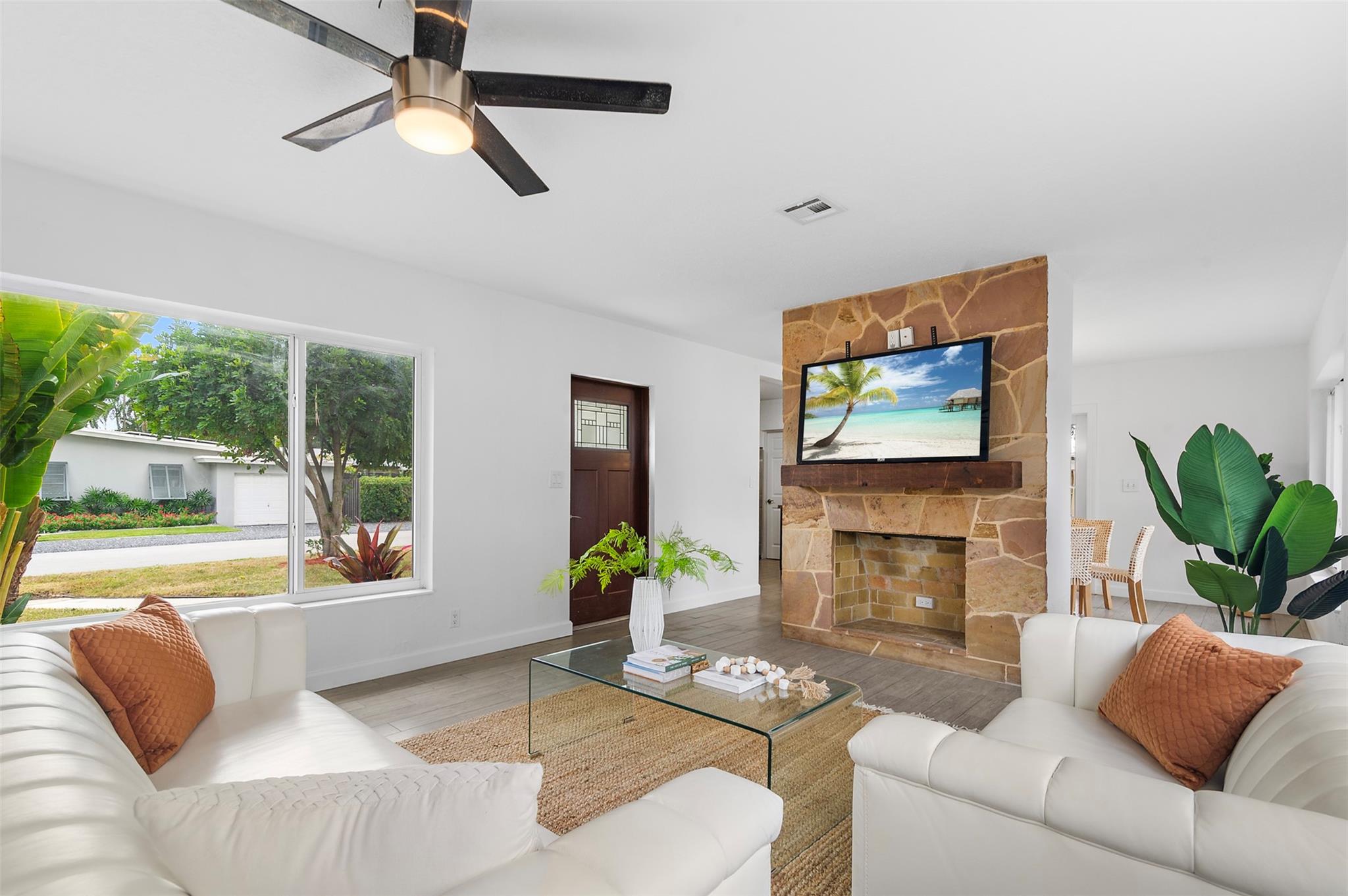 Welcome to this charming 2 bedroom, 2 bathroom home in desirable Lake Ridge positioned on a corner lot providing additional privacy and tranquility. This home perfectly blends comfort, style, and functionality, this beautiful residence is a must-see. Key features include, impact windows and doors, updated kitchen with stainless steel appliances, brick fireplace elegantly dividing living and dining rooms and spacious laundry room with ample storage. Fenced-in backyard oasis with deck, perfect for outdoor entertaining. Lake Ridge is the perfect suburb of Ft. Lauderdale located 1.5 Miles from Ocean and Las Olas, Walking distance to Gateway theater, shopping and restaurants and 1/2 mile to Galleria Mall, Holiday Park and Dog Park. No HOA/Restrictions. See attachments for insurance inspections
