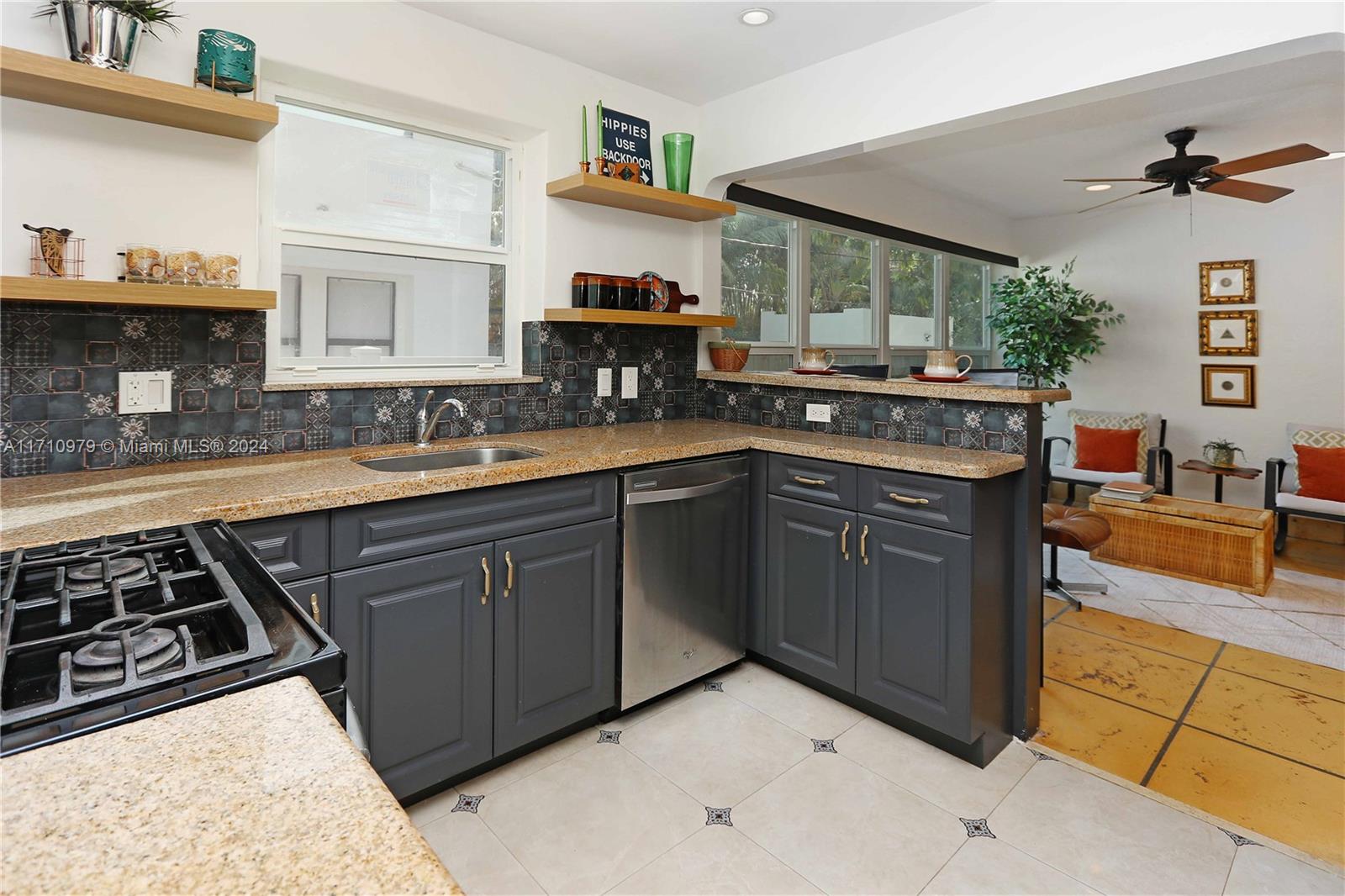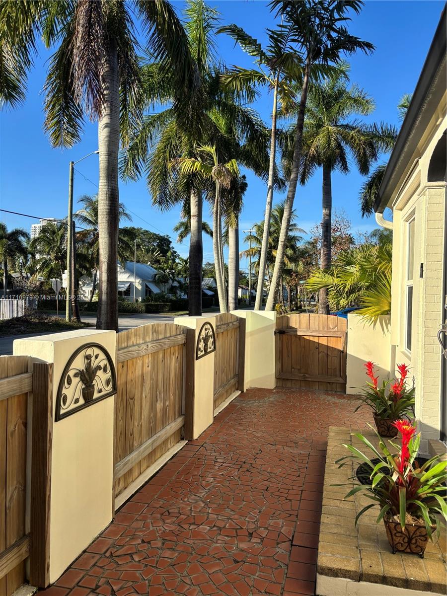 Classic 1940s Hollywood Lakes home exudes original charm, arched front door, gated courtyard, hardwood floors, 24”cement-tiled sun room & crown molding. Front room also features new fireplace & custom pocket sliding doors that completely define/elevate the space. Two spacious king BRs offer room & storage to spare w/4 walk-in closets & a hallway pantry, all w/custom organizers. Primary BR also includes private BA. Updated kitchen features SS appliances, gas stove, new fridge, open shelving & granite counters w/bar seating. A private home office conveniently located between kitchen & L/R. Entire interior was freshly painted 2024, new hurricane windows/doors in 2022. Yard is newly fenced & features a brick patio w/string lighting. One-car garage with W/D & freezer, roof warranty of 7 yrs.