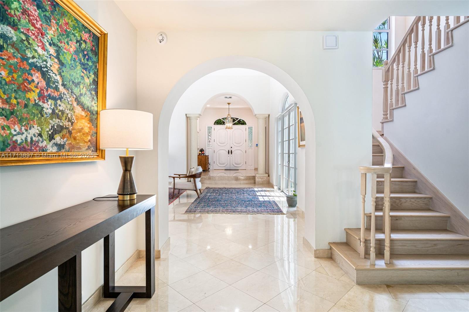 On upscale Asturia Avenue just one block south of the Granada Golf Course and the Coral Gables Country Club is this tastefully updated home with a graceful flow & sensible design. Dramatic volume ceilings and glowing natural light billow through french doors and guide you through an open grand living room, formal dining, inviting kitchen w/ dual ovens, oversized wine fridge, & ample eat-in island space. This floor plan highlights a generous primary bedroom on the 1st floor plus an additional junior primary upstairs. The lushly landscaped backyard has been thoughtfully purposed with a putting green, splash pool, abundant space for dining, entertaining, and relaxing in the fresh air. Complete impact glass, service quarters w/ private entrance, & plenty of storage, this home is a dream!