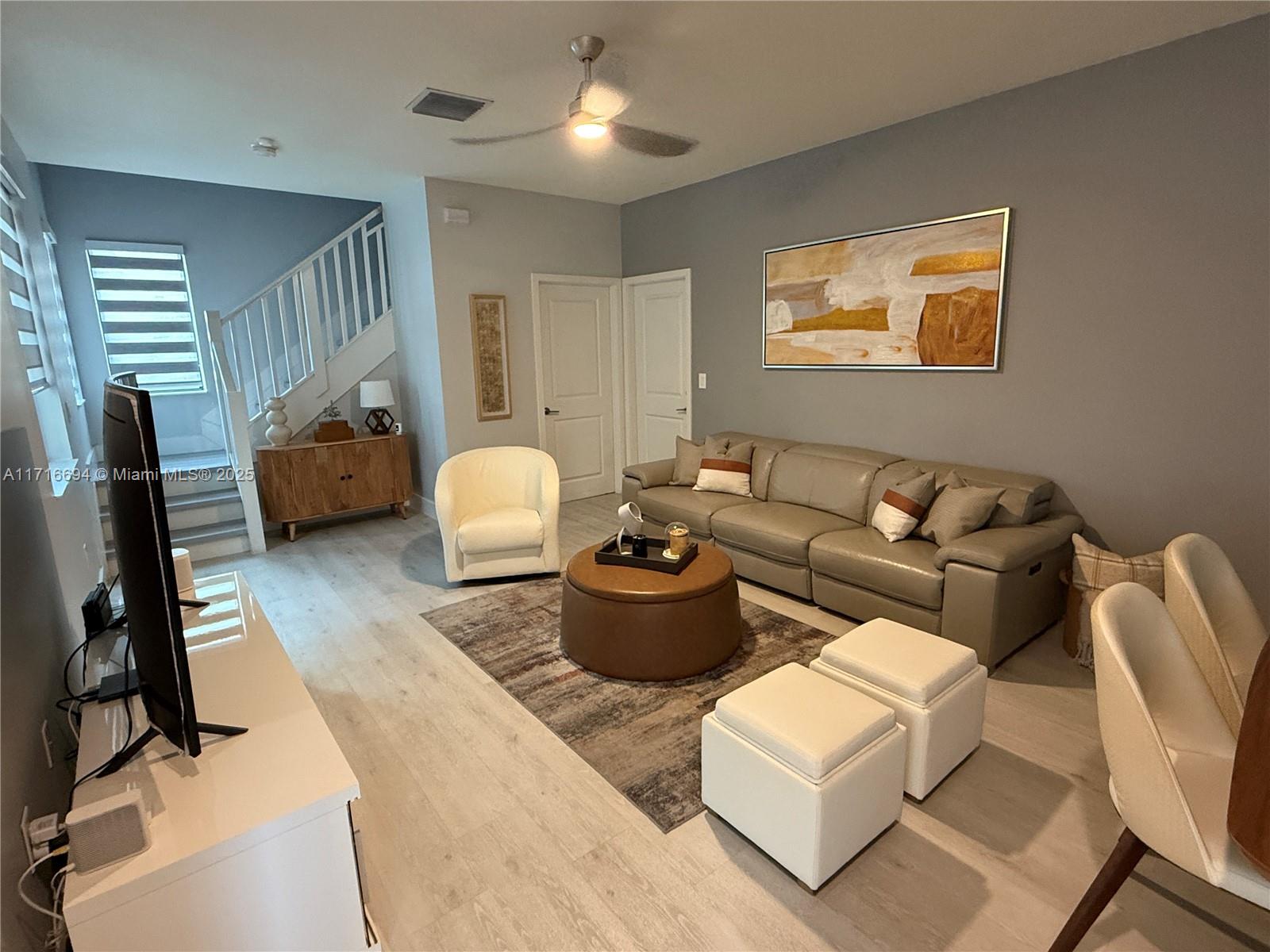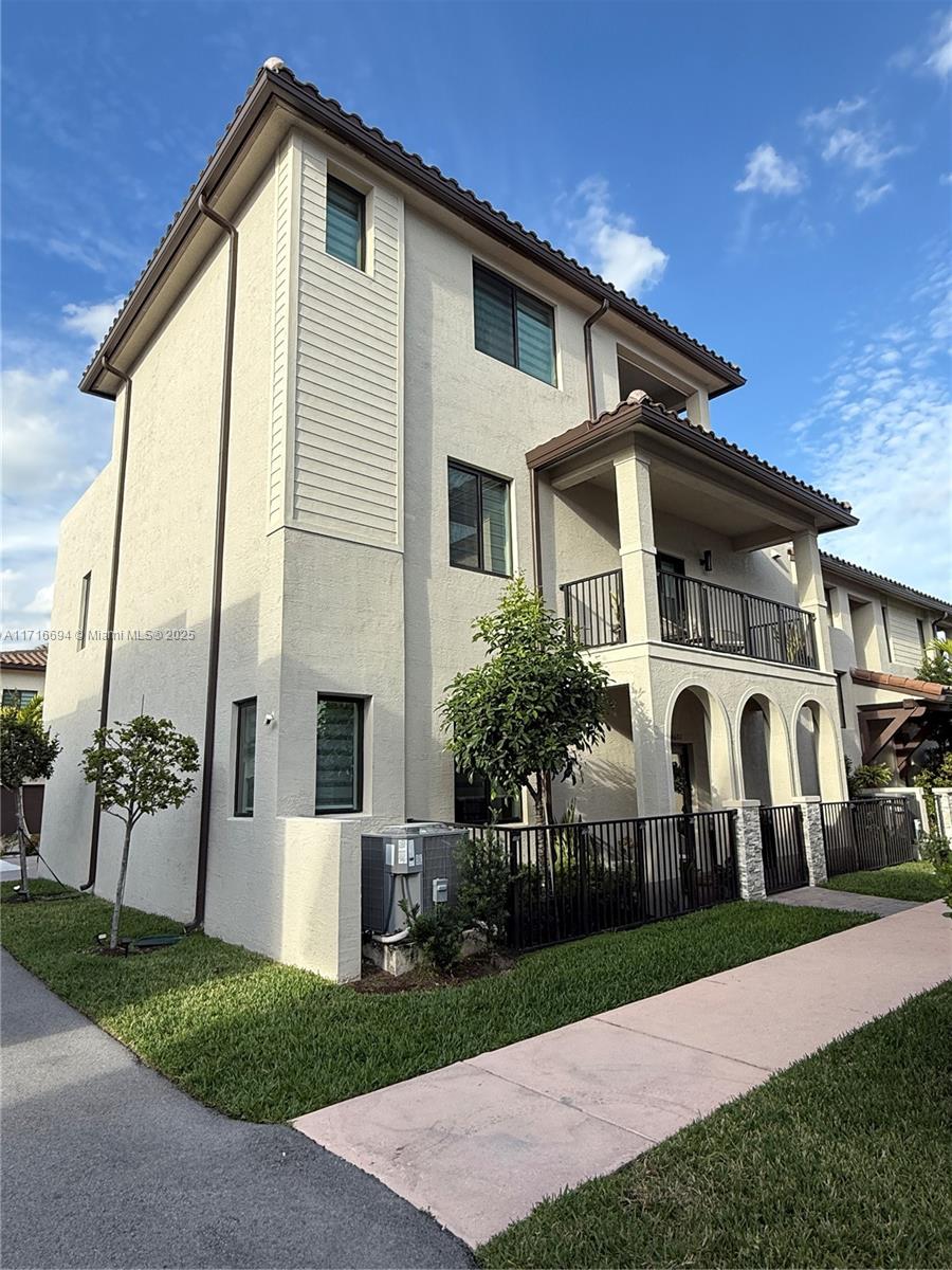 Upgraded luxury 3 story corner townhouse with two roof top terraces. Views of the Paseo Urbana and downtown Doral Skyline. All new vinyl plank floor covering throughout living area on first and second floor with ceramic tiles on third floor and bathrooms. 3 full bedrooms with custom closets, 2 full bathrooms and two 1/2 bathrooms. Laundry area and pantry with custom built ins. Outdoor covered summer kitchen in 3rd floor terrace as well as a second open terrace. Custom floor covering in two car garage with custom storage shelfs. Wired for electric car charging. Smart home with both front door and garage door accessed from app as well as central AC, lights and security system.