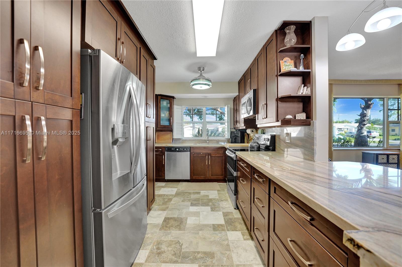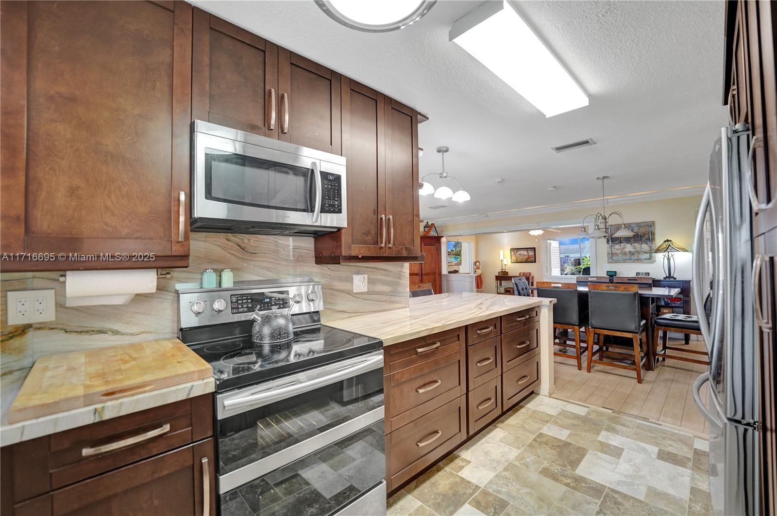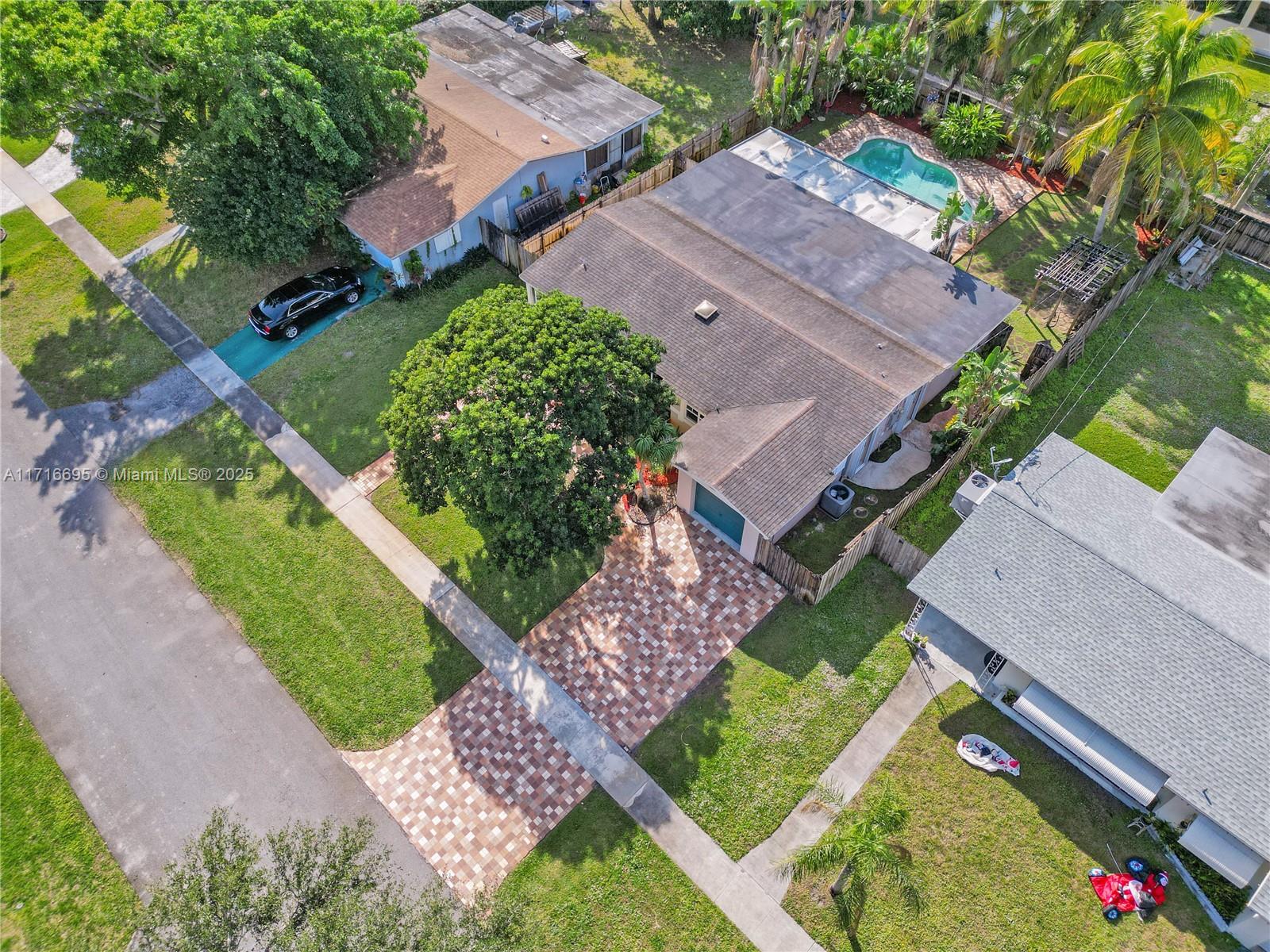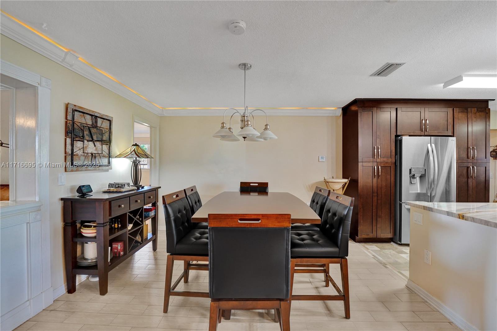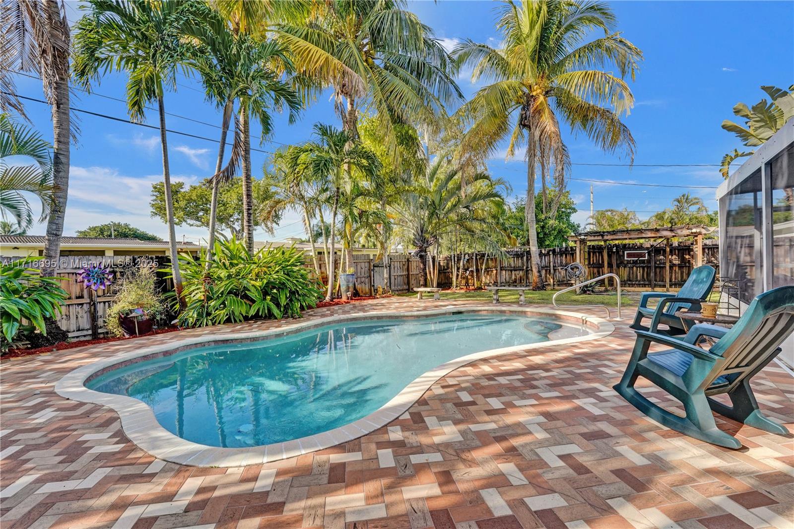 This 3 BR 2 Bath home features a kitchen with quartz countertops/ backsplash, and custom cabinets. The home also has custom tile floors. Throughout the home, there is crown molding with lighting in the living room, dining room, den, and two of the bedrooms. The windows and doorways have custom molding, and plantation shutters. The living room, dining room, den, and one bedroom have faux wood ceramic floors. The bathrooms are remodeled, including a soaking tub & large shower with four body sprays in the primary bathroom. Walk-in closets with built-ins. The large screened-in porch and the pergola in the yard by the pool will provide ample outdoor living space, and the tropical landscaping throughout the fenced-in yard creates a lush, private environment. Close to the beach,shopping,airport