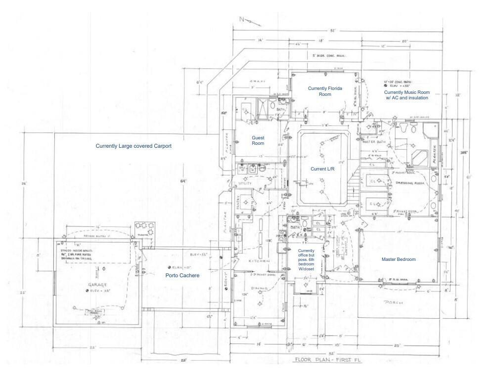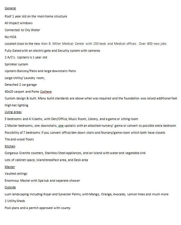 : Awesome opportunity for a Large Family, Small Business, or AirBnB. This custom built 5 bedrooms, 4 1/2 baths home, Den/Office, Library, Florida room, Music room, game room/nursery, and with possibilities for 7 bedrooms or additional offices. Move-in ready. Highlights are Impact Windows, 1+ acre, centrally located to major shopping, entertainment, dining, airport, and amazing Beaches. Coming in 2025, will be the Alan B. Miller Medical Center with 150 beds, Medical offices, and 800+ jobs and less than 2 miles away. No HOA, so it could be great for a Business or AirBnB and Pet friendly. Home is connected to City water, is fully gated w/security system, and has a 2 Car garage with a huge car port. Main roof is @ 1 year old, Stainless appliances, granite counters and so much more. See documen