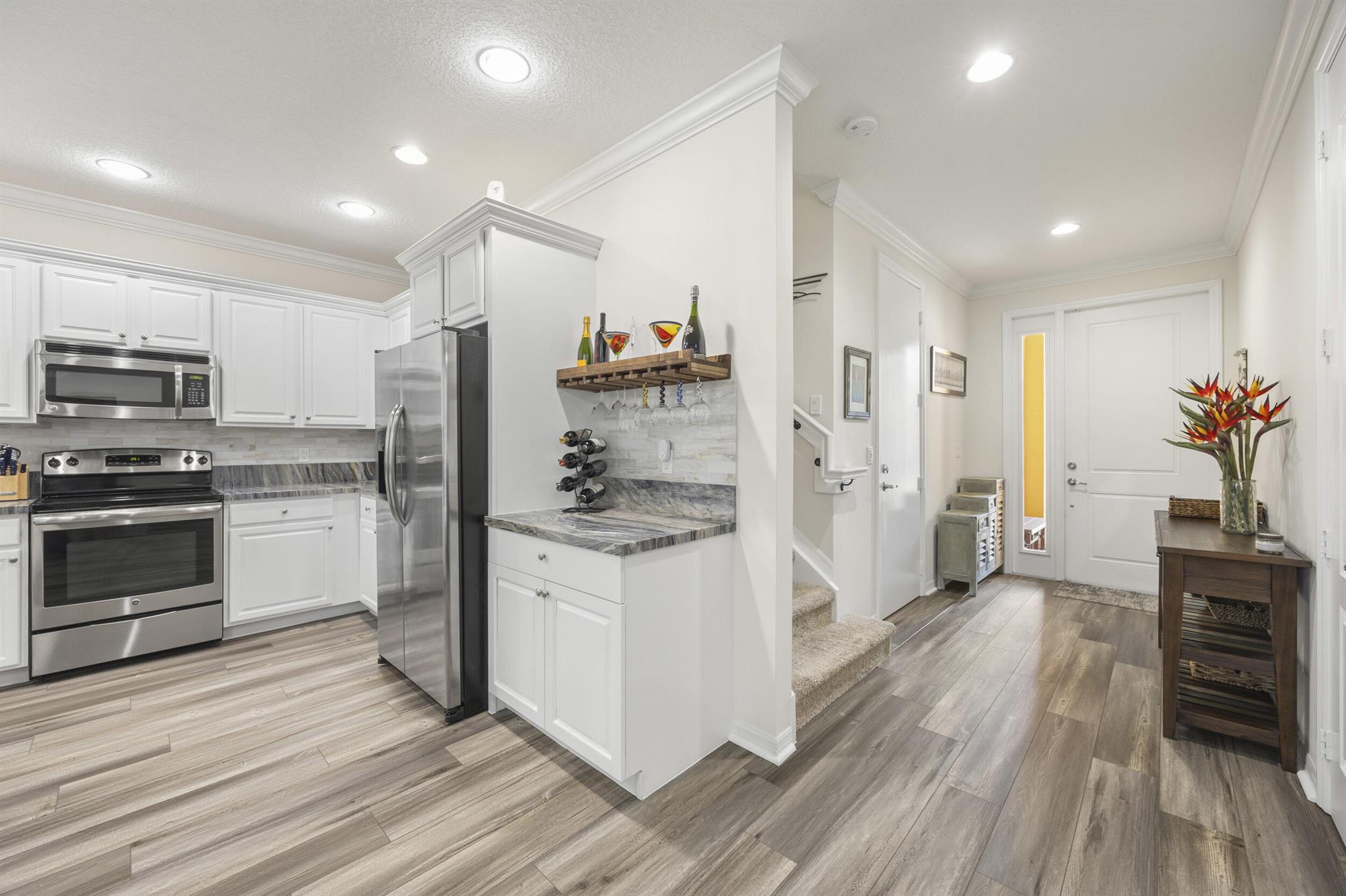 Investment opportunity. Listing with tenant and signed lease.Imagine waking up each day to a peaceful lake and fountain right outside your window. This 3-bedroom, 2.5-bath townhome has been fully updated, from the brand-new floors to the sleek quartzite countertops in the kitchen. Downstairs, you'll find a fresh powder room and open living area that feels welcoming the second you step inside. Plantation shutters lend a classic touch throughout, giving you control over light and privacy in every room.Upstairs, the master bedroom offers plenty of space and a large walk-in closet, perfect for keeping everything organized. The master bathroom is your perfect oasis whether you want to soak in the tub or take a hot shower after a long day