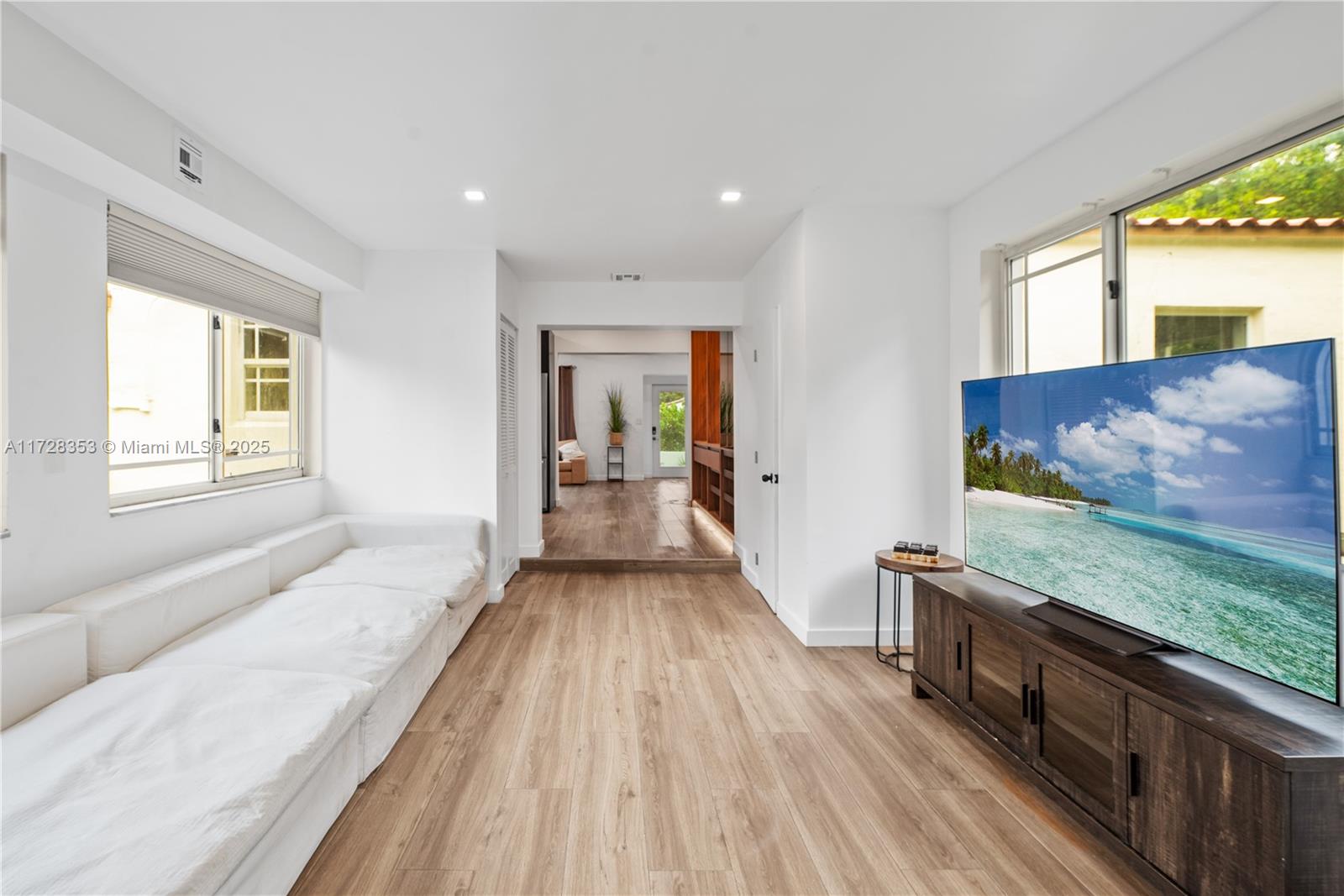 Discover modern elegance in this 3-bedroom, 2.5-bath Miami Shores home. The living room features vaulted ceilings, exposed wooden beams, a white brick fireplace, and abundant natural light. The open-concept kitchen shines with dark cabinetry, a butcher-block countertop, stainless steel appliances, and a custom wine display. Spacious bedrooms include custom closets, and the bathrooms offer stylish finishes and functionality. With a seamless blend of charm and sophistication, this home is perfect for both relaxing and entertaining in a prime location.