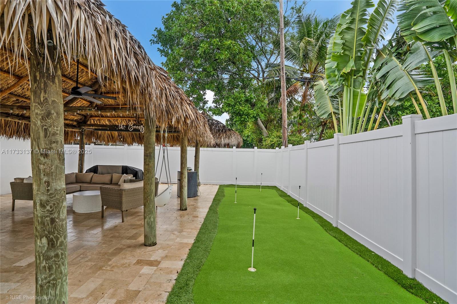 Just minutes from the shimmering shoreline, this charming larger than average 2-bedroom, 2-bathroom home offers the perfect blend of comfort and coastal living. Step inside to discover a spacious and inviting floor plan, with a versatile Den ideal for an office or nursery. Outside, you'll find a beautifully updated backyard, featuring pristine travertine pavers and a lush mango tree — perfect for enjoying Florida's year-round sunshine. The newly rethatched tiki hut (2024) offers the ultimate setting for a laid-back evening with friends. Additional highlights include a brand-new roof (2022), AC system (2022), and impact windows, ensuring peace of mind in every season. Plus, the putting green adds a touch of fun for golf enthusiasts or those simply looking to unwind.