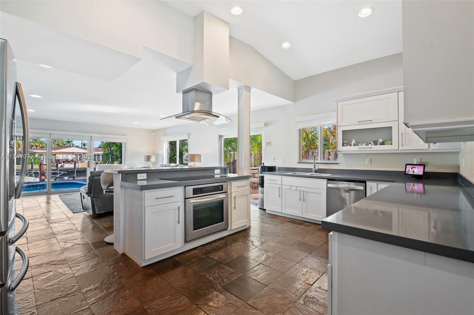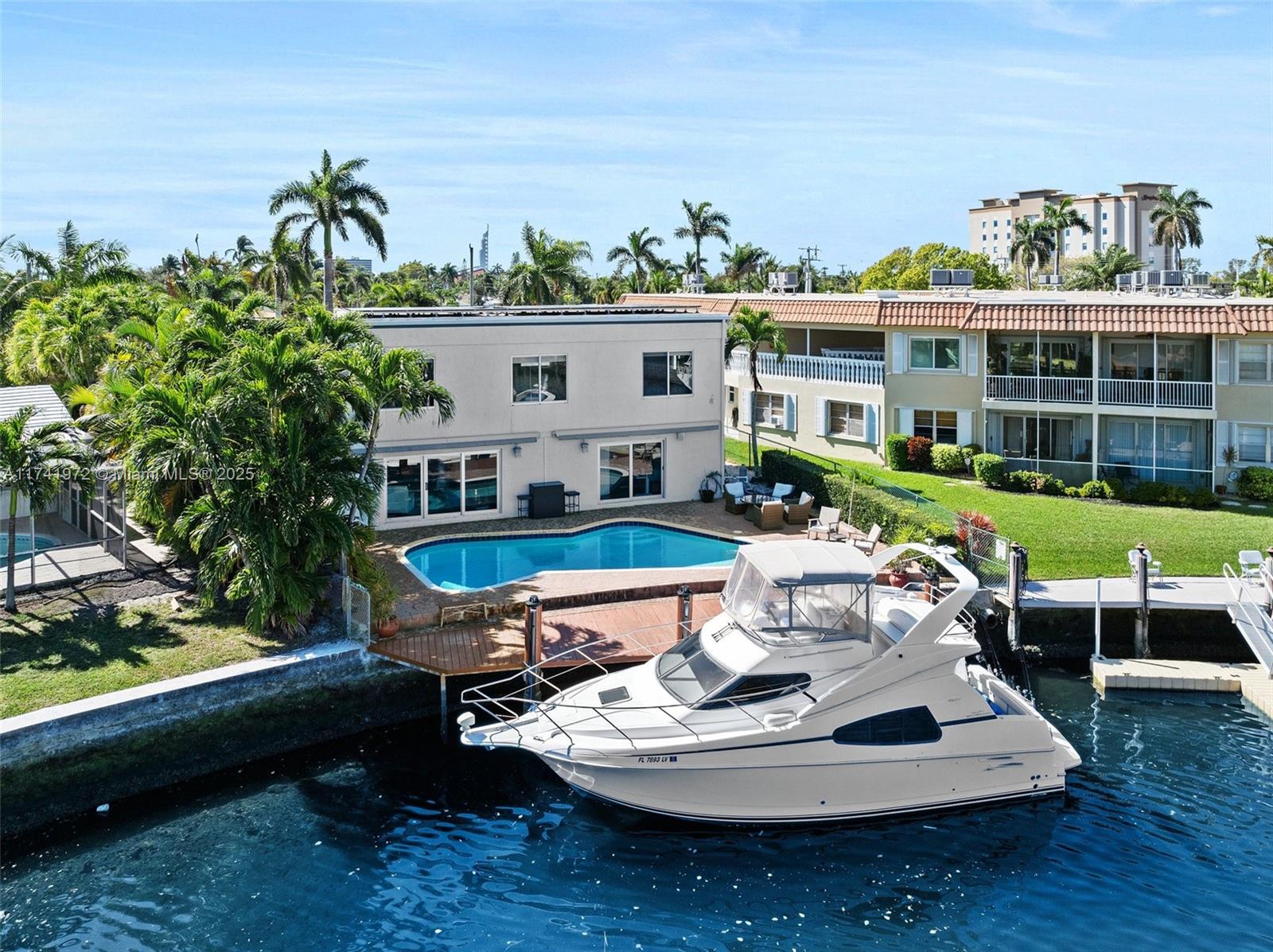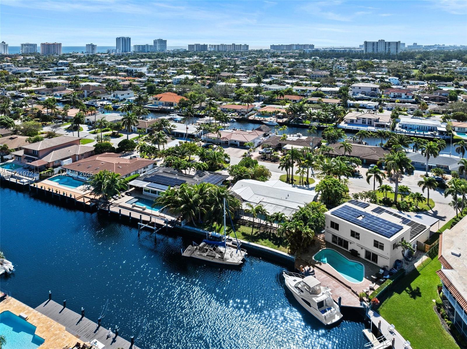 Discover coastal luxury in this spectacular waterfront oasis in Santa Barbara Shores! Boating enthusiasts will appreciate the 50-ft dock with ocean access and no fixed bridges, heated pool and beautiful water views. This 4 BR/3BA features 3,058 sq. ft. open and functional living space with master suite and one bedroom on the first floor and two additional bedrooms and versatile loft upstairs. Gourmet kitchen features wood cabinetry, quartz countertops, and stainless-steel appliances. Embrace modern efficiency with a 2021 roof, solar panels, impact windows/doors and Tesla charging station. Located just minutes from shopping, dining, and less than 10 minutes from the beach. Experience the best of South Florida living in this turnkey waterfront retreat, where luxury meets functionality!