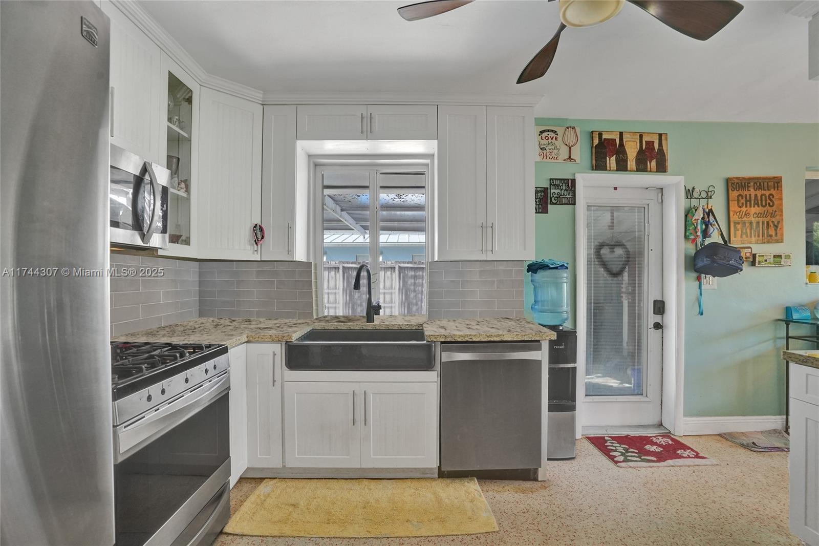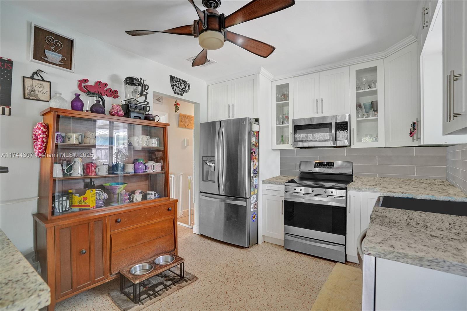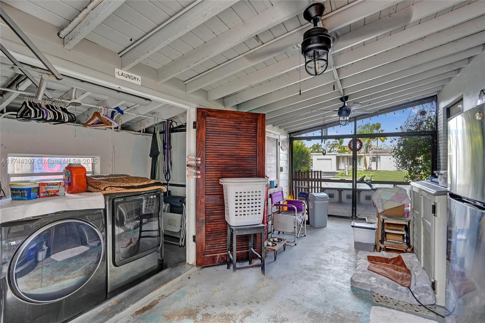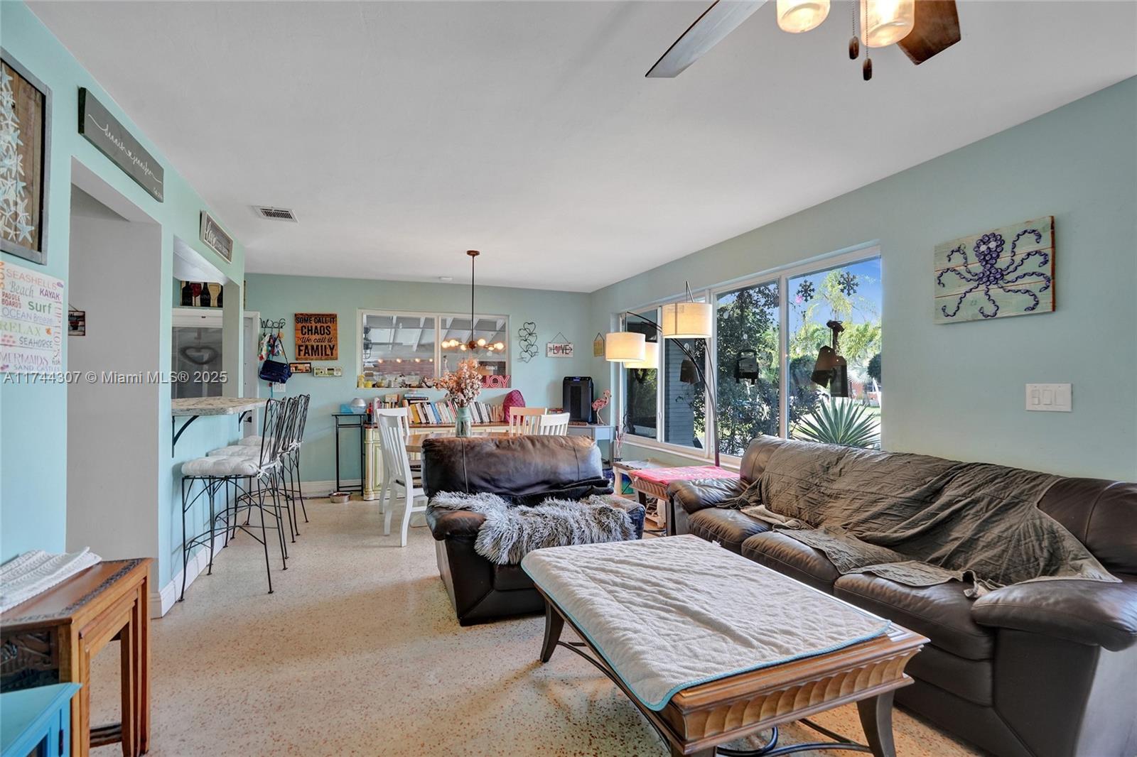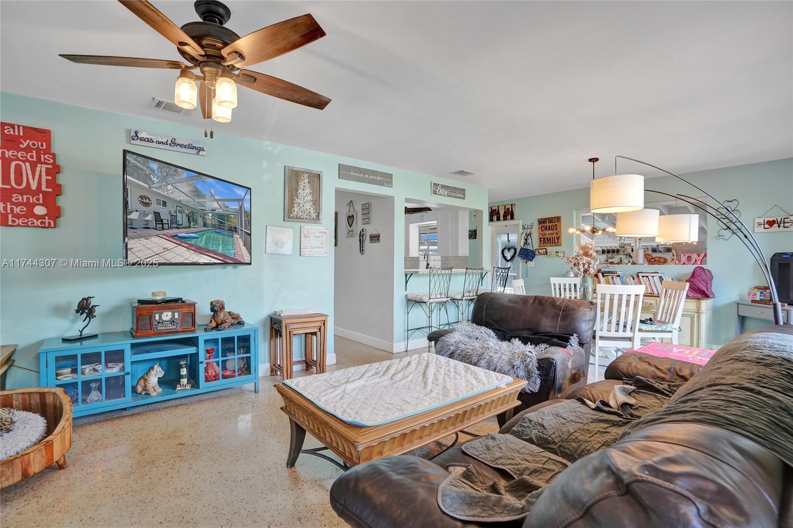 Step inside this beautifully updated 4 bedrooms, 2 bath home in sought after Riverland Village! Featuring terrazzo floors throughout, home offers a spacious living/dining area plus a extra family room. The updated kitchen boasts granite countertops, subway tile backsplash, white cabinets, & a gas range. Both bathrooms have been tastefully updated, w/the primary suite featuring a Cabana bath. Tons of storage throughout, including multiple closets, two well-maintained sheds, & extra storage in the carport area. Outside, enjoy a screened-in pool, a large fenced yard w/a mango tree, & an outdoor laundry area. Additional features include a 1-car carport, 2020 AC & heat pump, 2017 roof, a tankless gas water heater & gas dryer, with all-natural gas.