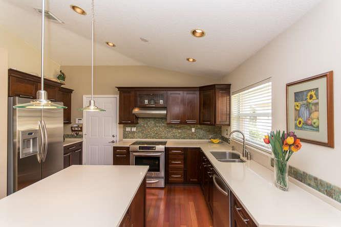 Completely renovated to perfection! Immaculate! Over 40K in Upgrades! High-end Finishes (Slate, Onyx, Quartz, Granite, Stonework). Gorgeous kitchen with white quartz counter tops, Onyx Back Splash, Kitchen Aid Stainless Steel Appliances, Brown Maple Hardw ood Cabinets & Wine cooler. Foyer entryway with Beautiful Slate Tile Flooring. Cherry Hard Wood Flooring in Main Areas, Counter top in Laundry room, Accordion Shutters, Fenced Corner Yard.
