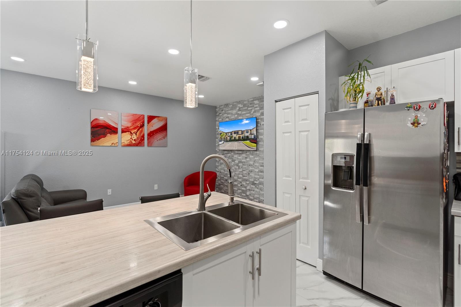 This is the ONE!! Come fall in love with this STUNNING turn key townhome in the beautiful Resort Style community of Aquabella in Hialeah Gardens. As you enter , you can't help but notice the HUGE 32 inch MARBLE FLOORS that flow through the entire downstairs. Fresh paint and newer fixtures Impact windows and doors on first floor. The kitchen has been updated and this unit has 2 family room areas and separate dining. The patio has an extended Aluminum roof that is impact resistant for extra entertaining space and lovely pavers too. Going upstairs you will notice the modern floors in all bedroom. The bathroom are gorgeous with marble floors, Glass enclosed showers and updated vanities. Blackout shading on all windows too! The Ac has a UV light for cleaner air! Come see this Beauty TODAY