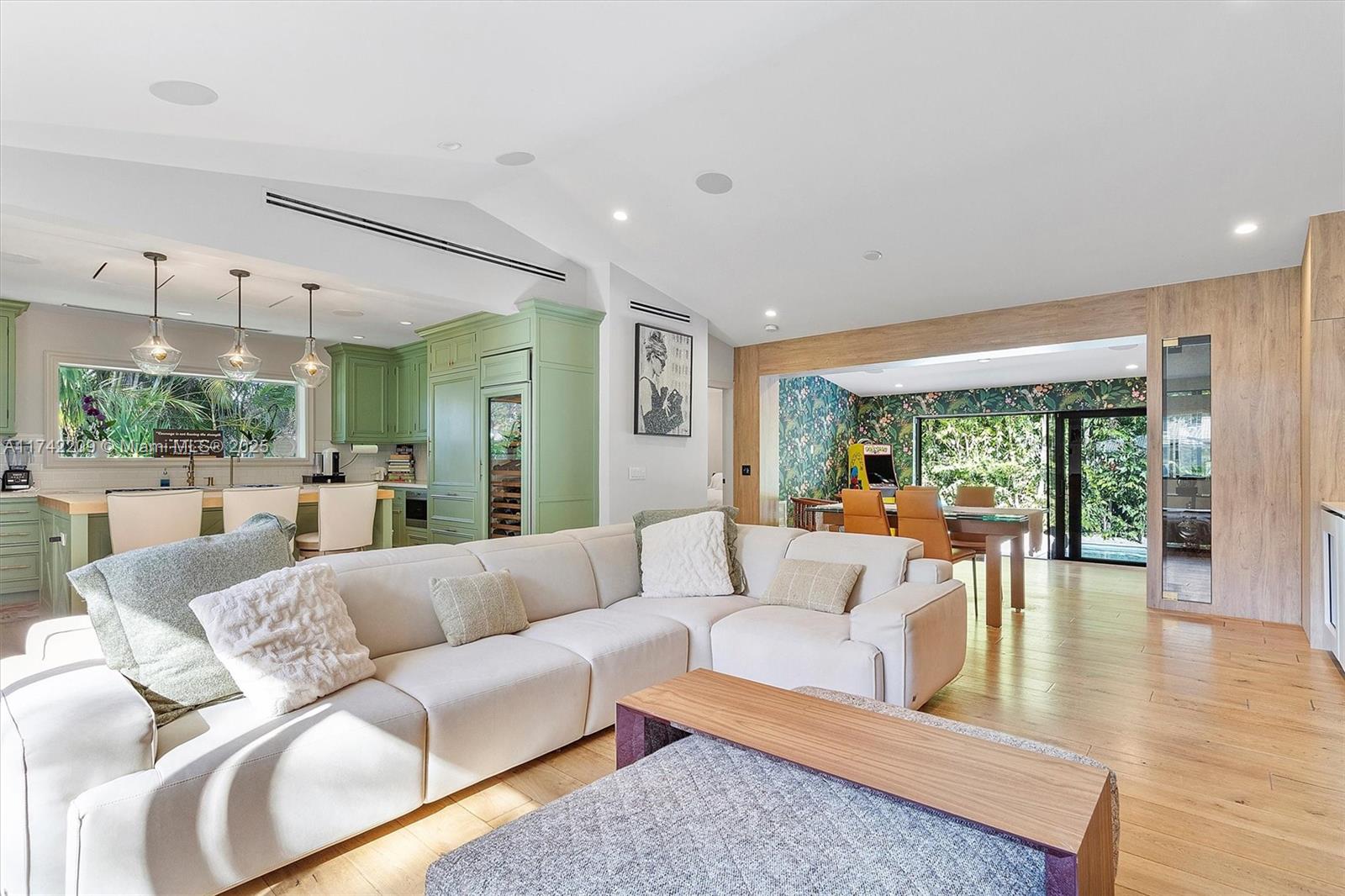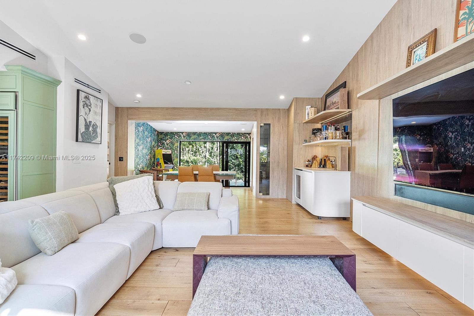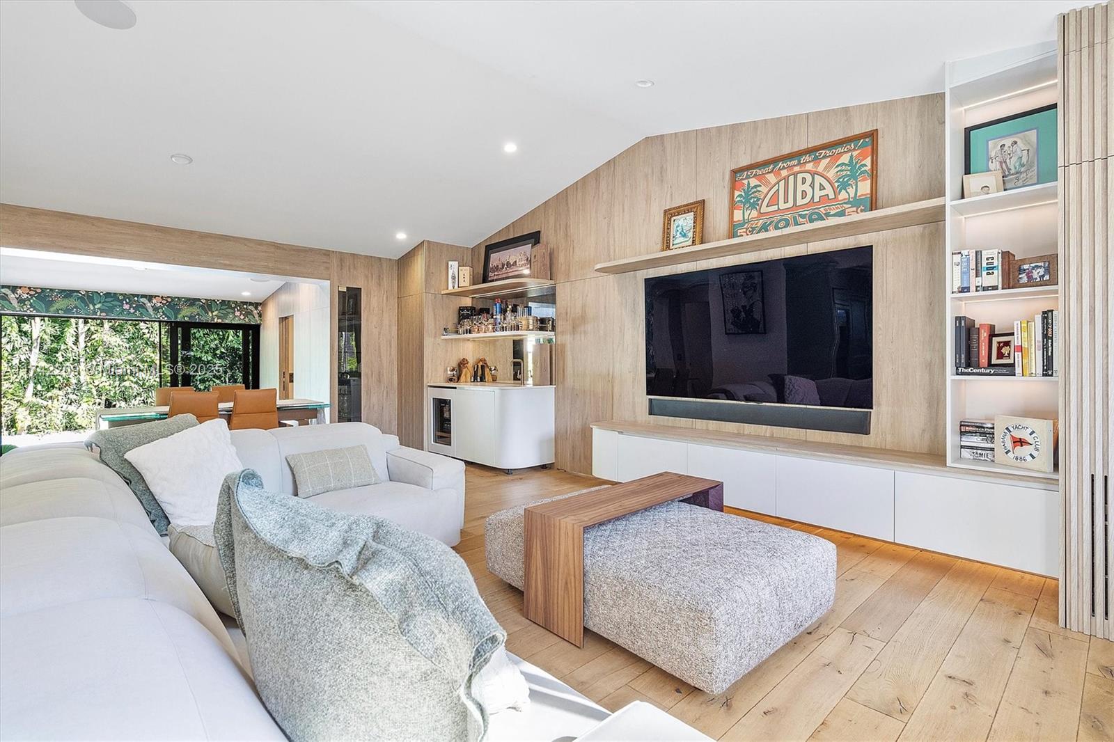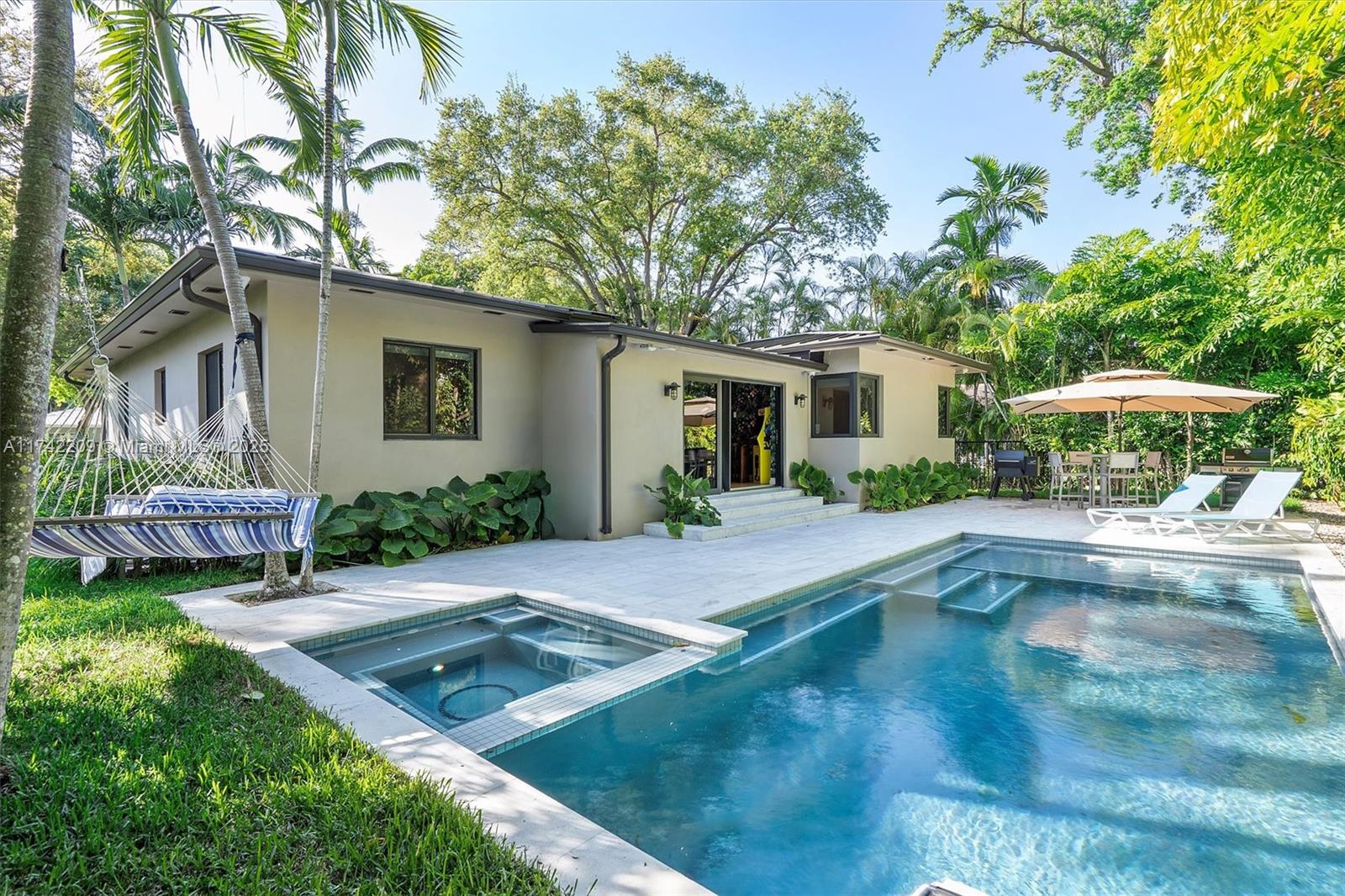 Welcome to a hidden paradise in Miami Shores! An absolutely stunning, newly upgraded home. Step inside to discover beautiful Florida pine wood floors throughout and soaring pitched ceilings that create an airy, open feel. A sleek wood-paneled wall adds a touch of sophistication and conceals hidden access to two of the bedrooms and a bathroom. The spacious primary suite boasts a gorgeous soaking tub set against a large picture window, inviting you to relax while overlooking lush greenery. Steam shower in second bath! Designed for comfort and convenience, this smart home is fully equipped with cutting-edge technology. Outside, your private oasis awaits— a brand-new pool w/heater + chiller, and hot tub, surrounded by pristine white tile, with outdoor lighting and sound system.