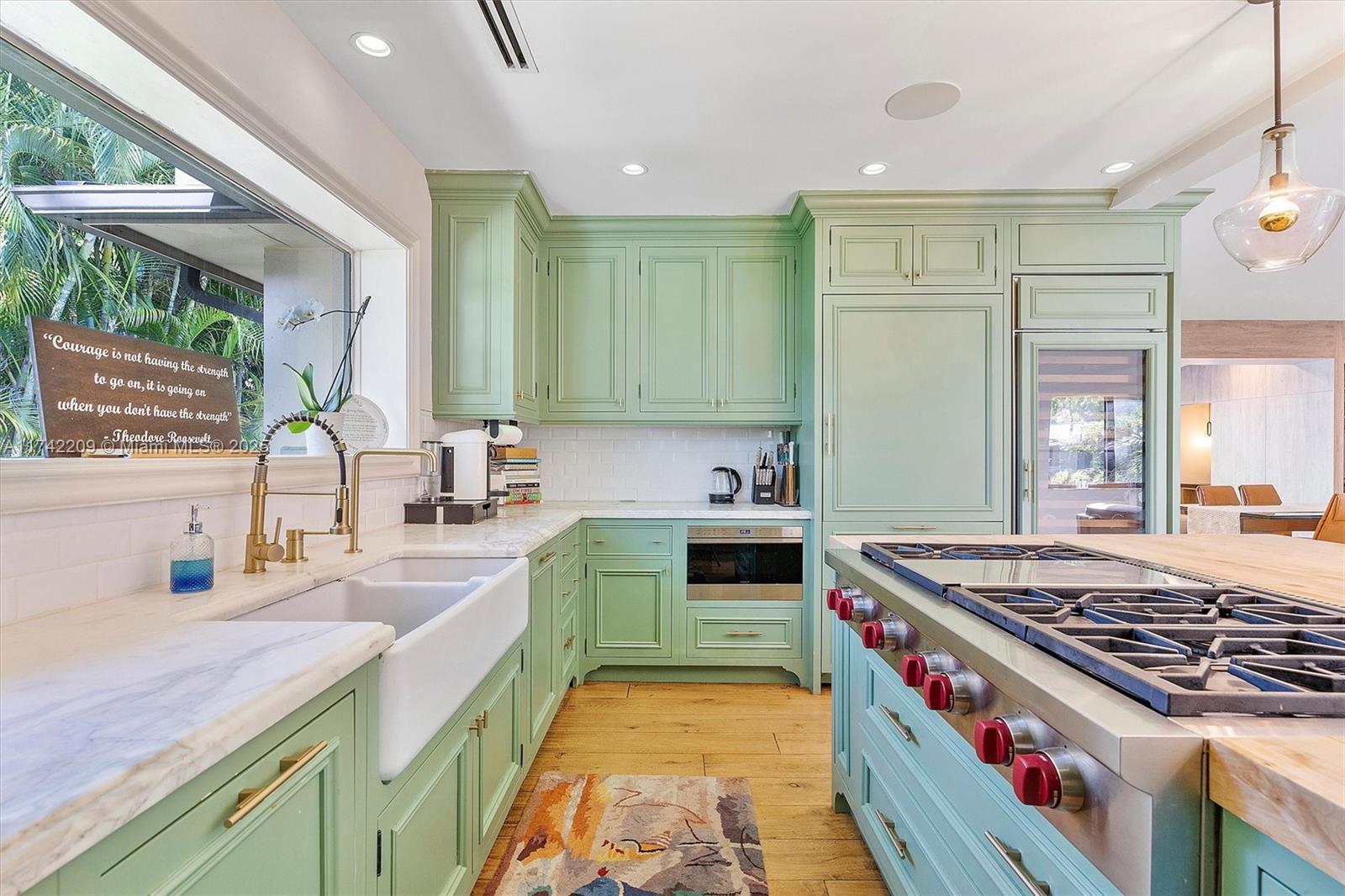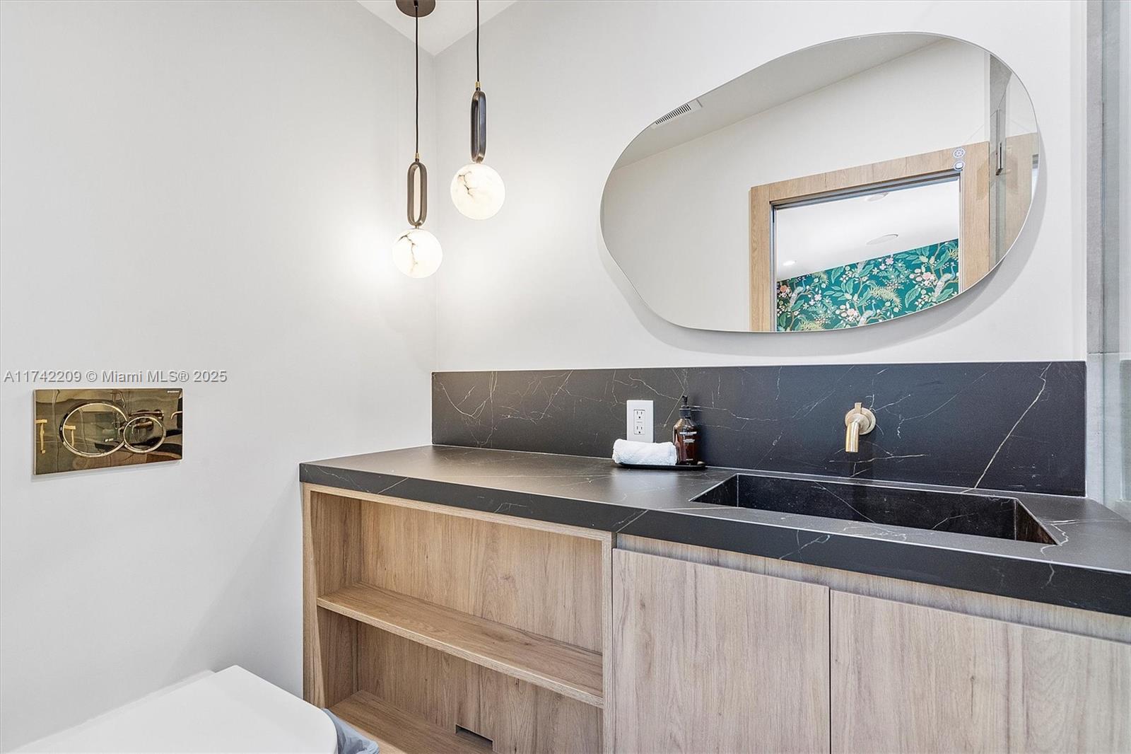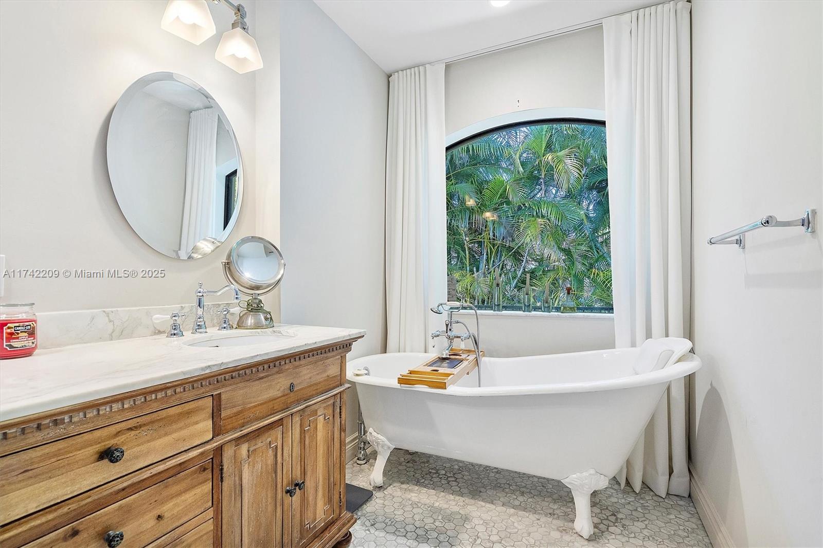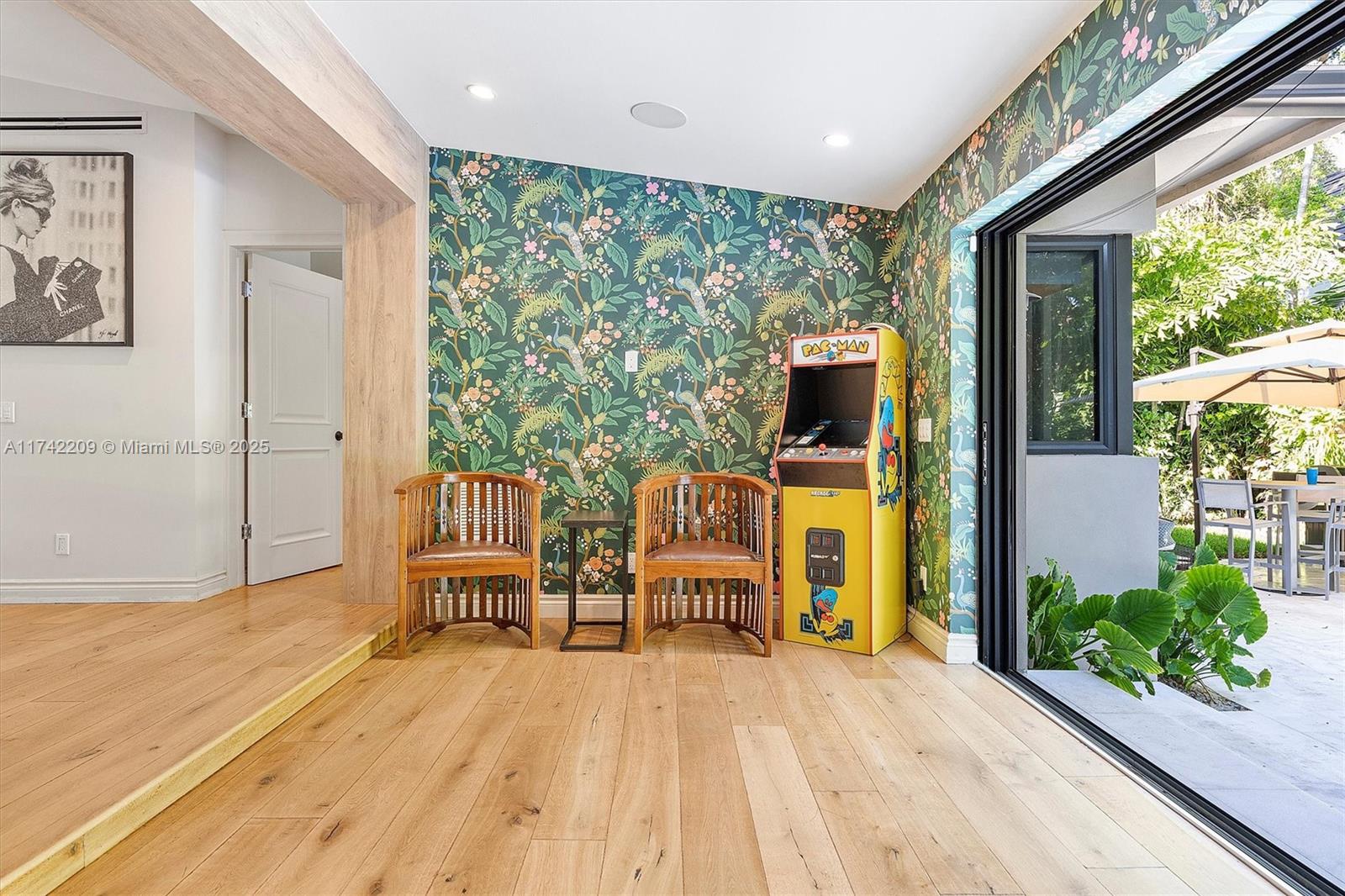 Welcome to a hidden paradise in Miami Shores! An absolutely stunning, newly upgraded home. Step inside to discover beautiful Florida pine wood floors throughout and soaring pitched ceilings that create an airy, open feel. A sleek wood-paneled wall adds a touch of sophistication and conceals hidden access to two of the bedrooms and a bathroom. The spacious primary suite boasts a gorgeous soaking tub set against a large picture window, inviting you to relax while overlooking lush greenery. Steam shower in second bath! Designed for comfort and convenience, this smart home is fully equipped with cutting-edge technology. Outside, your private oasis awaits— a brand-new pool w/heater + chiller, and hot tub, surrounded by pristine white tile, with outdoor lighting and sound system.