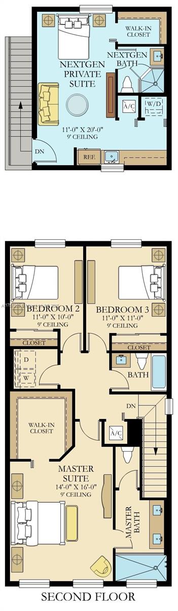 Sought-after townhome with 3 bedrooms and 2.5 baths, 2-car garage, plus a NextGen suite with private access. This townhome is equipped with the most up-to-date technology, which includes wi-fi and key-less entry. The first floor offers a great room, family room and powder room. There's a large patio off the family room for barbecues and family gatherings. The kitchen is equipped with a deluxe stainless steel appliance package and quartz countertops. The 2nd floor features the master suite with large walk-in closet and master bathroom with dual sinks, glass enclosed shower and private toilet room. The washer and dryer are also located on the 2nd floor. The NextGen suite is fully equipped for independent living with kitchenette, washer and dryer, walk-in closet and full bathroom.