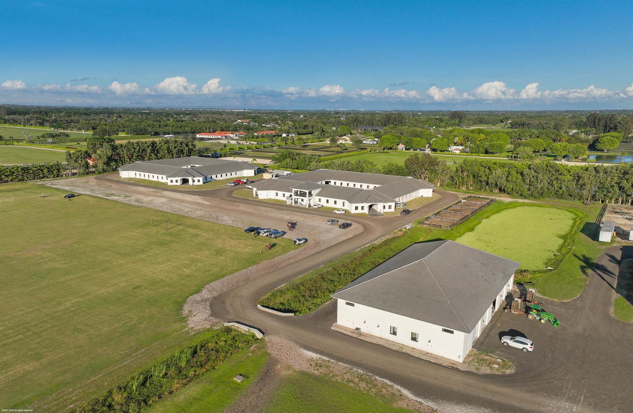 Reduced $7,500,000. One-of-a-kind opportunity to own a 46.96 acre equestrian facility in a prime Wellington location on a paved road and with no homeowner's association. The property boasts 4 stables, totaling175 stalls, full size polo field with exercise track, a second stick & ball practice field, maintenance garage and two staff houses. Two new show barns were built in 2024, one with 52 stalls & the other with 59, it also features a 2nd floor viewing room with balcony overlooking the polo fields. The original courtyard-barn holds 48 horses and the over flow barn has 16 stalls. The staff houses each have 4BR & 4Bths. The property is comprised of multiple parcels which could lend itself to future subdivision. This farm has unlimited potential for all equestrian disciplines. A must see!