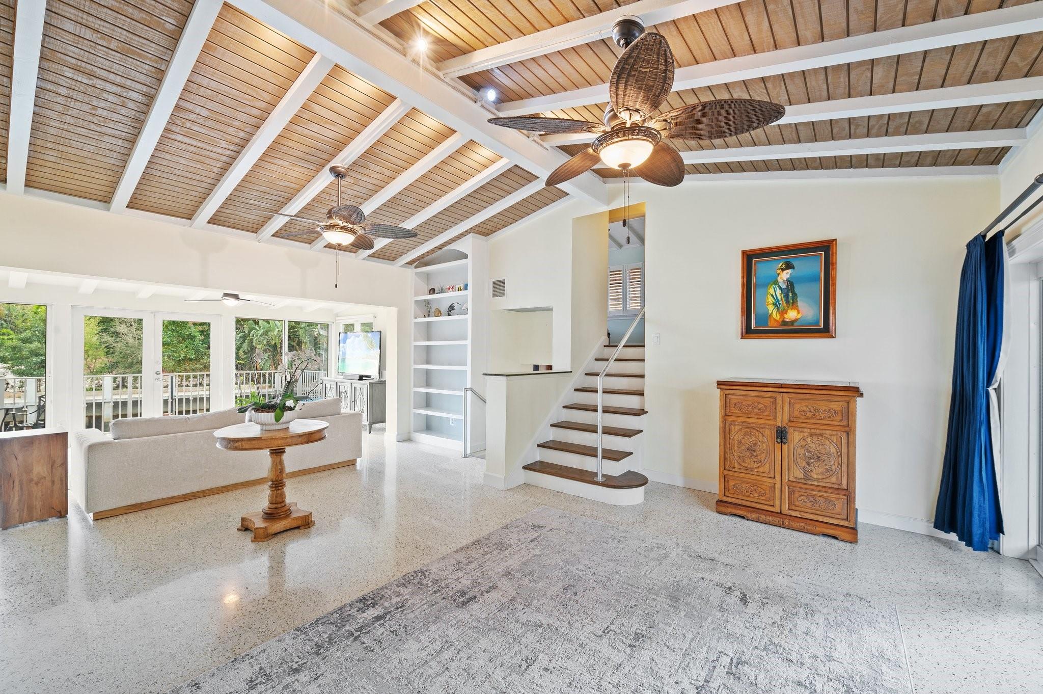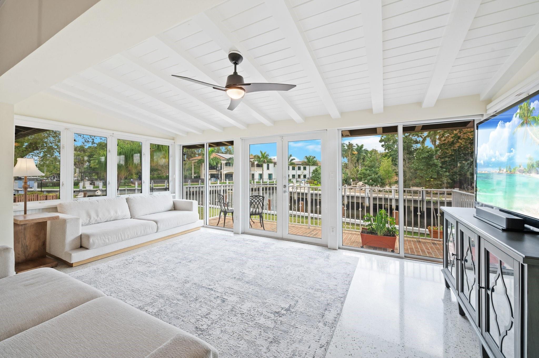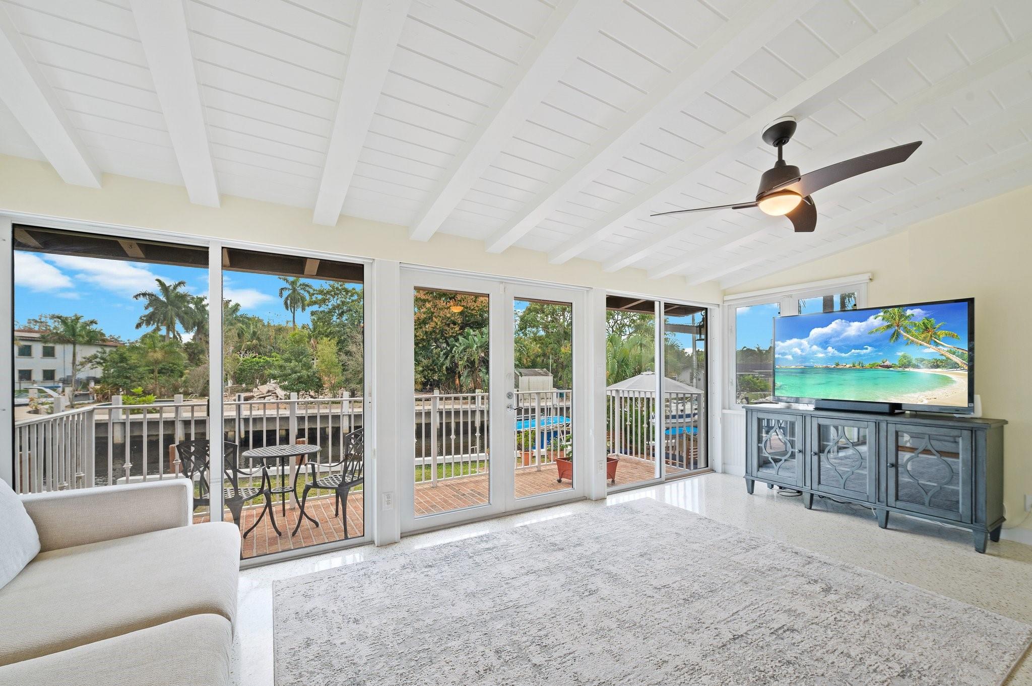 Waterfront home in Gill Isles! This 4BD/3BA tri-level home sits on a magnificent point lot with 155 ft of deepwater frontage offering direct ocean access with no fixed bridges and a convenient turnaround basin at your dock. Protect your yachts at this part of the river known as the Hurricane Hole. Built with solid CBS construction, this home boasts original terrazzo and oak floors, a stunning kitchen with gas stove and stainless appliances, updated baths, and expansive living spaces. The unique tri-level design provides separate yet connected living areas, maximizing waterfront views and natural light. Nestled along a quiet part of the New River, yet minutes from marinas, the airport, highways, downtown, and the beach. Enjoy the perfect blend of privacy, character, and modern convenience!