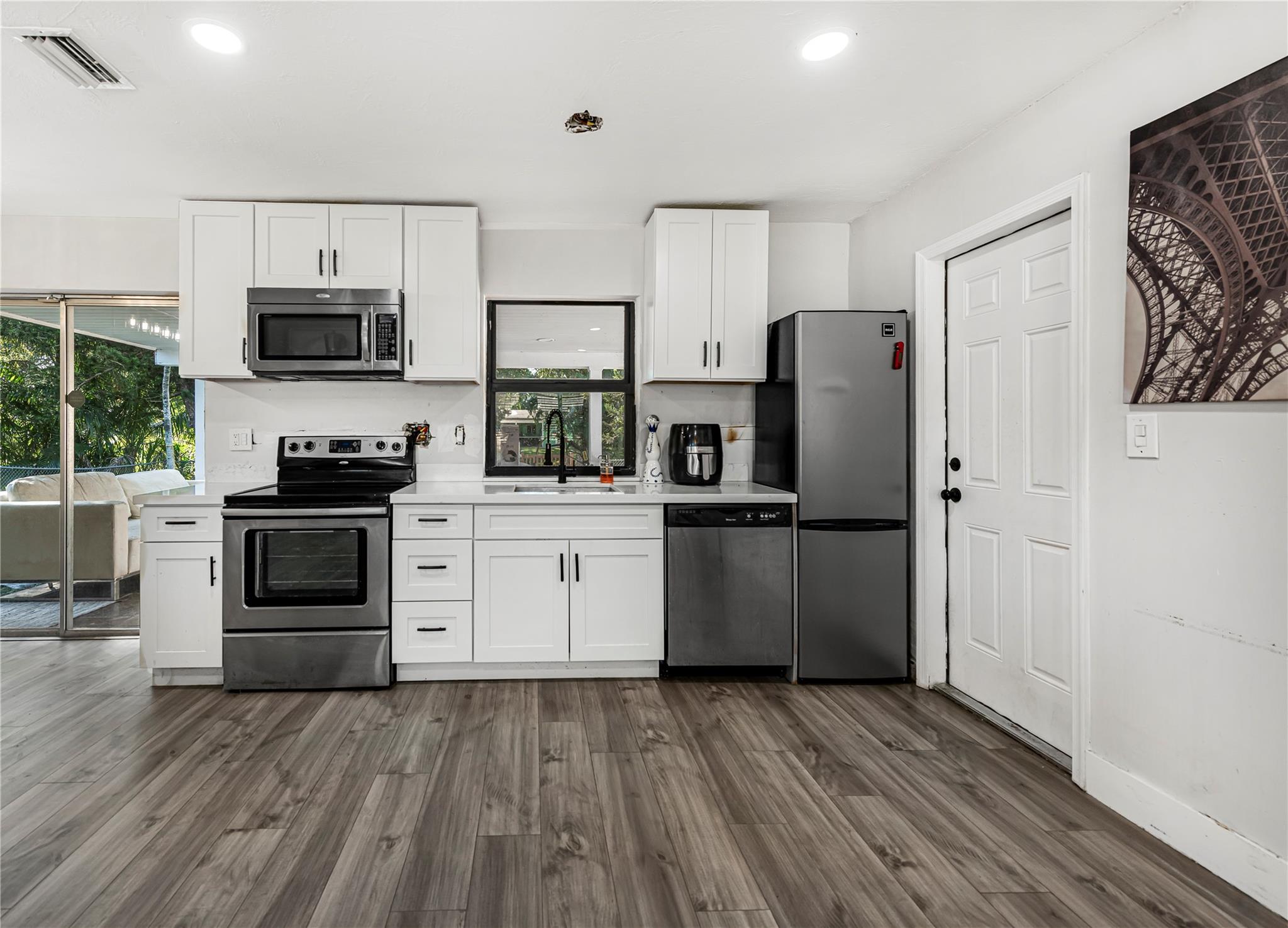 TURN KEY HOME ready for you! Charming and fully remodeled 2 bedroom, one bath home with open living concept and modern upgrades throughout. This beautifully updated home features newer roof, impact windows, fresh paint, new baseboards, stylish new floor, sleek recessed lighting. The kitchen boasts brand new cabinets and fridge while the renovated bathroom offers a contemporary feel. Enjoy waterfront living with direct cancel access and a brand new dock - perfect for boating fishing or relaxing by the water. Move in ready and waiting for you.