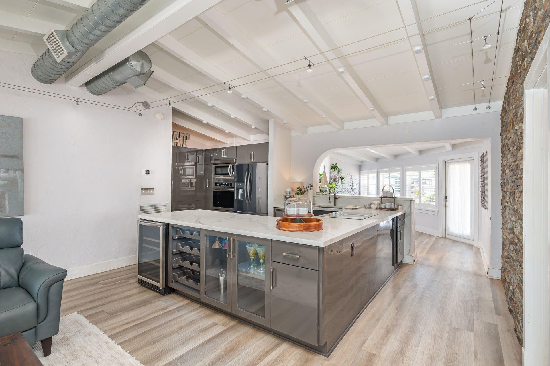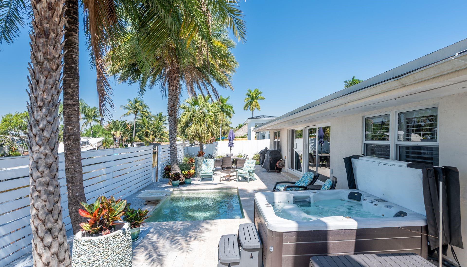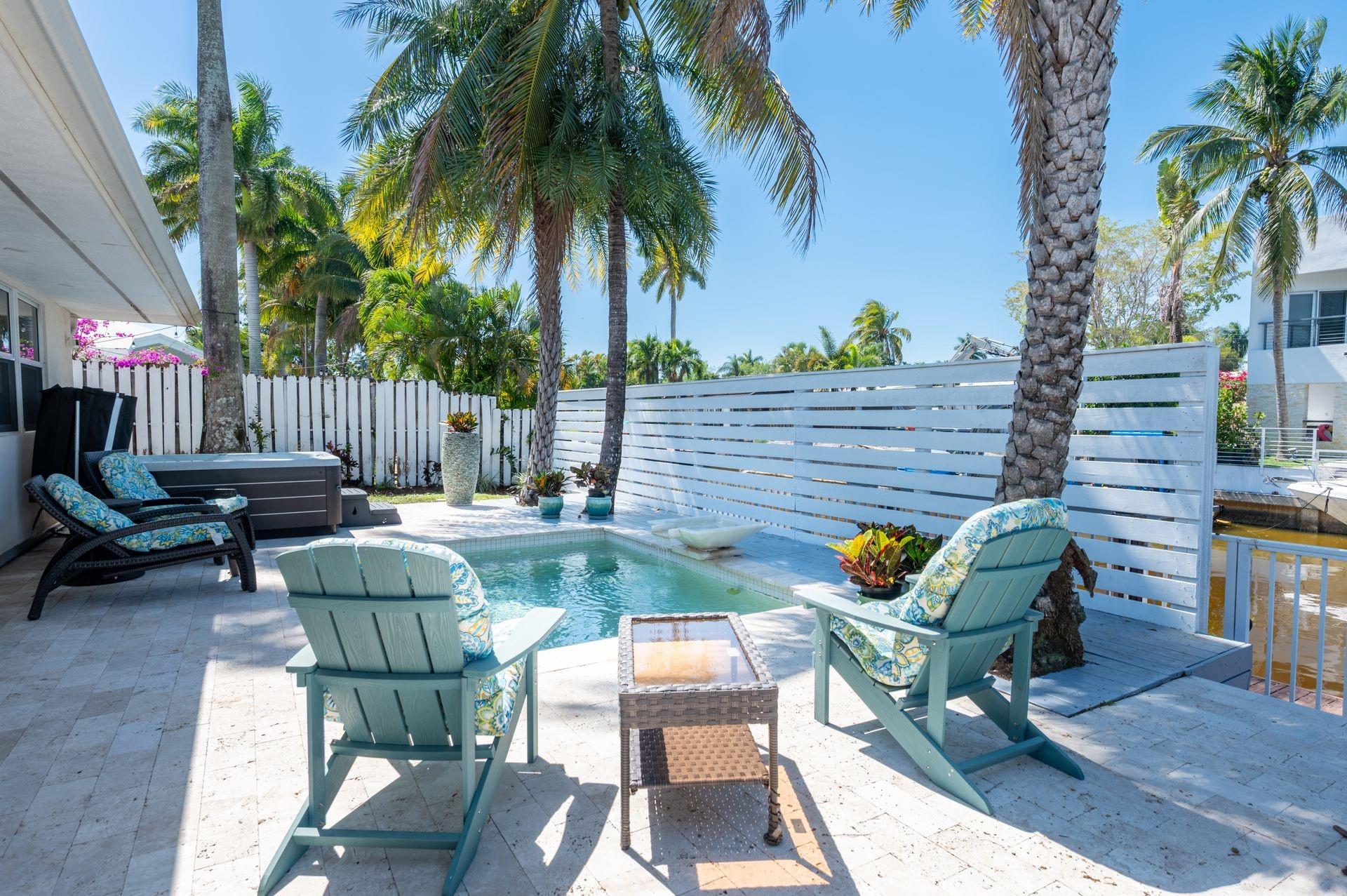 This Fort Lauderdale Isles renovated waterfront property boasts 65 feet of prime water frontage, a private dock, deep water & no fixed bridges—just 45 minutes to the Intracoastal. The 3 bed 2 bath, plus office* home features modern finishes, an open floor plan, and a seamless indoor-outdoor flow, perfect for entertaining on the large deck or relaxing by the cocktail pool & jacuzzi. The chef's kitchen has a double oven, stainless appliances, wine frig, plenty of storage, multiple pantries. The Florida Room is absolutely adorable. With newer A/Cs and a roof just five years old, this home is move-in ready. It's ideal for boating enthusiasts seeking luxury waterfront living in a highly desirable Fort Lauderdale neighborhood. * Office, add a closet, you have a 4th bedroom. Home sold furnished.