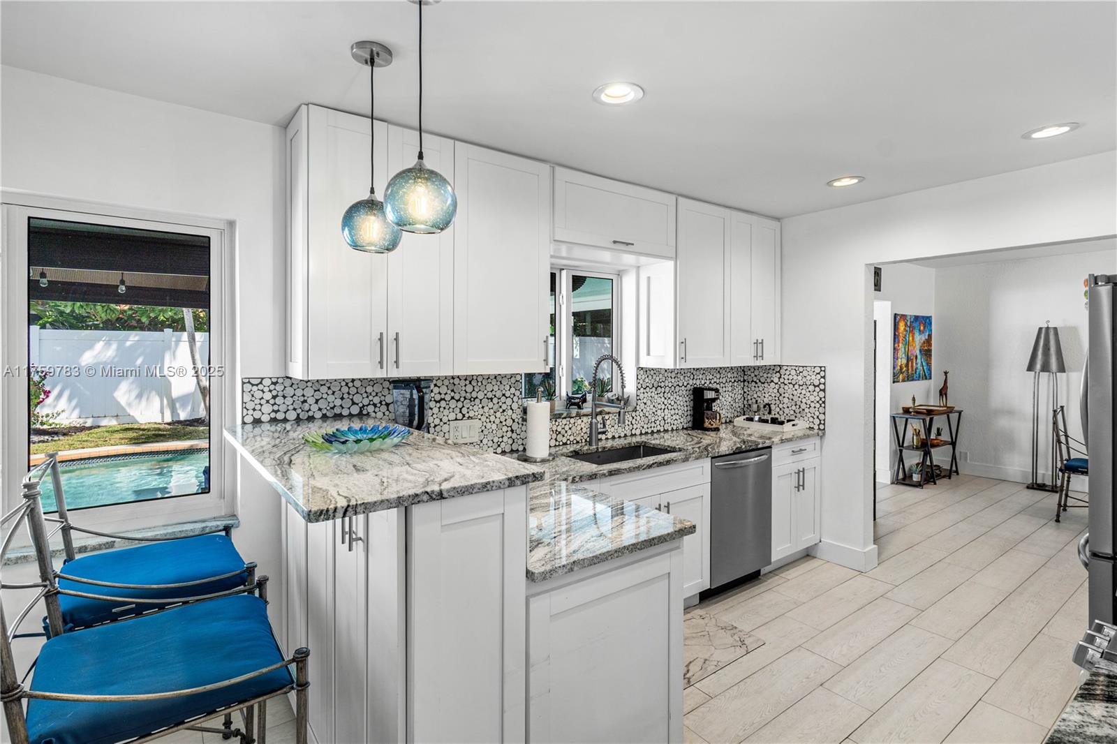 Beautifully remodeled pool home in sought-after Knoll Ridge. Light and bright with a modern open floor plan. Split bedroom design with a huge 18x21 primary bedroom plus adjoining office/nursery/home gym. French doors leading to the back patio and pool. En-suite bath with large spa tub/shower and dual sinks. Recently installed plank style tile floors throughout. Privacy and security are assured with double electronic gates and impact windows and doors all around. Metal roof (2014), A/C (2018), Water lines completely re-piped in 2007, new garage door 2021. Sewer line replaced with PVC in 2024. Chicago brick walkway leads from the circular driveway to the front door. Backyard is completely fenced with a brick paved entertainment area separate from the pool. Close to everything. No HOA.