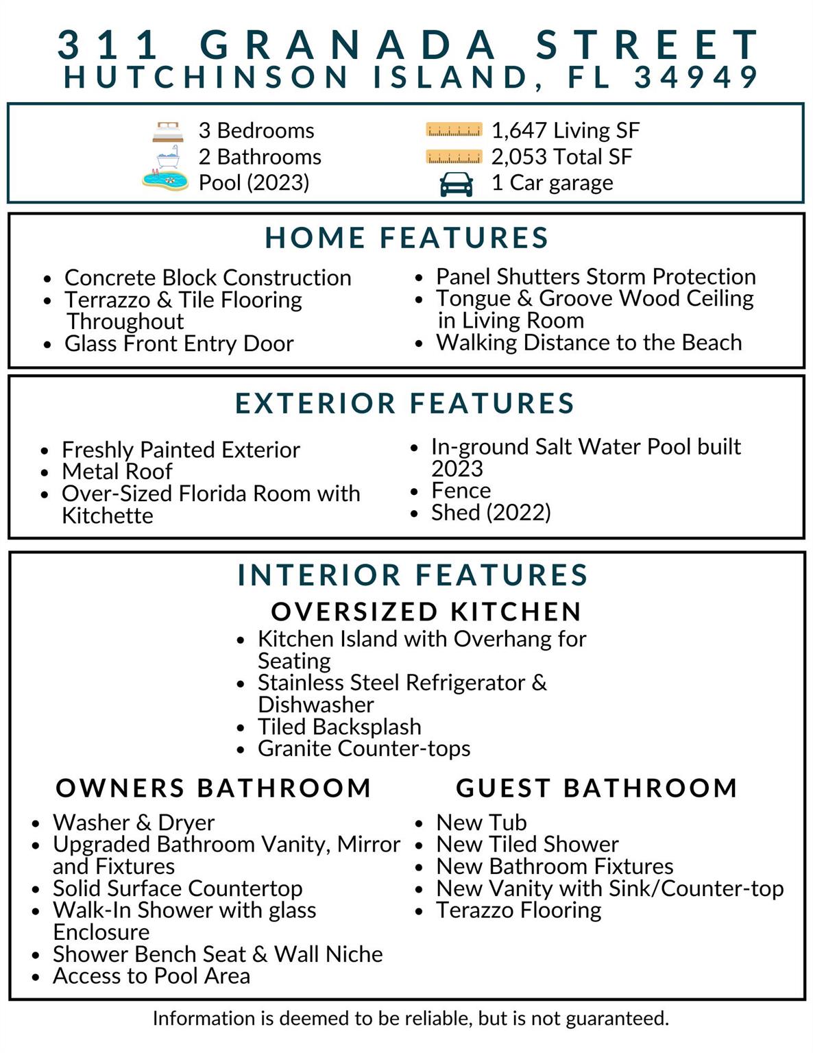 Welcome to this charming beach house, a private retreat designed for relaxation and fun on beautiful Hutchinson Island! This inviting home features an over-sized kitchen perfect for cooking and entertaining, a HUGE Florida Room complete with a kitchenette, and a (2023 built) sparkling saltwater pool for endless outdoor enjoyment. With three spacious bedrooms, two updated bathrooms, and a metal roof, this home is built for comfort and style. Whether you're looking for a full-time residence or a vacation getaway, this prime location offers the best of island living!