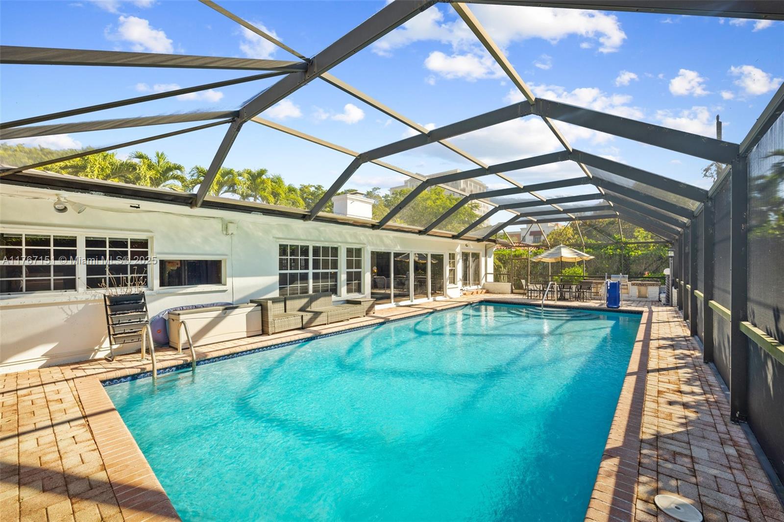 Discover the epitome of Coral Gables living in this elegant home, perfect for family living and entertaining. Featuring wood floors throughout, it offers 3 spacious bedrooms, a den, 2 baths, and a cozy wood-burning fireplace, blending classic charm with modern comfort. The bright family room opens to a private over sized pool area, complete with a new screen, built-in barbecue, and outdoor shower. Ideally located within walking distance to Miracle Mile's vibrant restaurants, shops, and entertainment, with easy access to the airport, Coral Gables Country Club, and golf courses just ten minutes away.