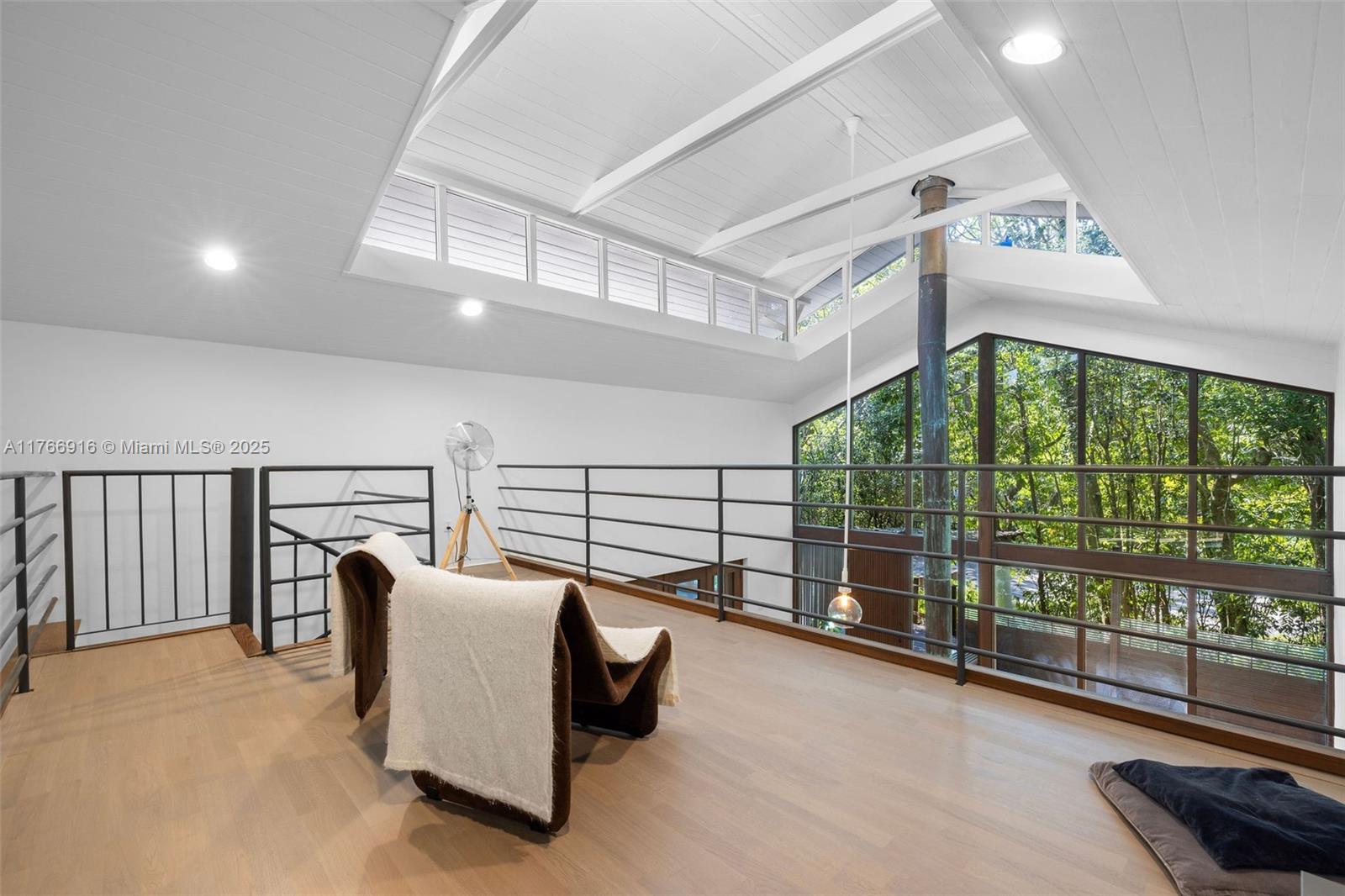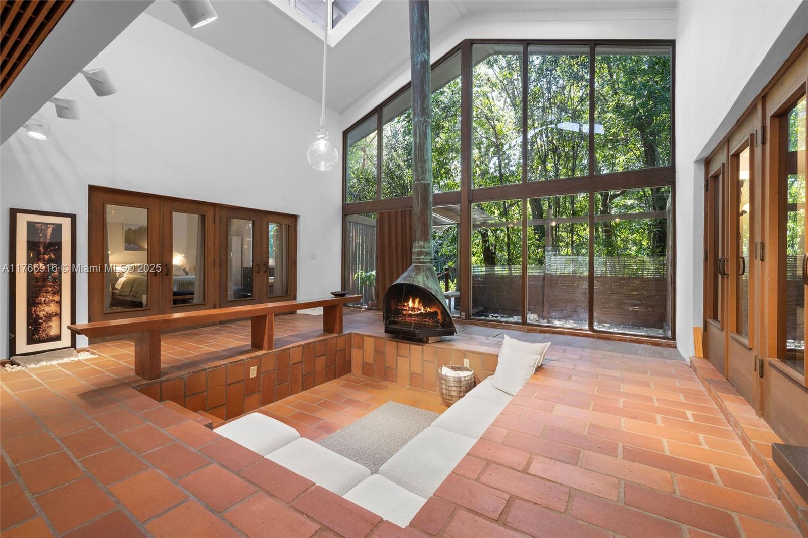 This architecturally unique Tropical Modern home in Pinecrest’s Devonwood neighborhood is perched on a hill in a peaceful, hammock forest-like setting. A clerestory above 20’ vaulted ceilings and window wall allows for abundant natural light. A wood stairway and front entry open to a great room with a modern conversation pit and hanging fireplace with patina finish. A spiral staircase leads to a spacious upper-level open loft with treetop views – perfect for home office. Other areas have high volume 9-10’ ceilings. The split plan layout with 3 bedrooms and 3 full baths offers privacy and functionality. The attached 2-car carport w/ storage converts easily to a garage or addition for a 4th bedroom—plans available. The large lot includes a wonderful garden-surrounded pool & fenced backyard.
