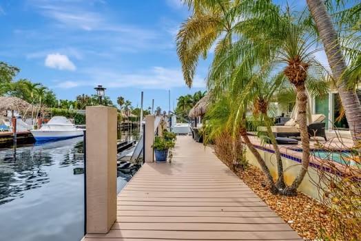Paradise awaits! Discover your new waterfront home in Pompano Beach, featuring NO FIXED BRIDGES and 77 feet of water frontage with a composite dock and direct ocean access. Boating enthusiasts will love the remote-controlled 25,000 lb boat lift and submersible jet ski lift. Step into your private resort-style backyard, complete with a heated pool, outdoor kitchen, and a luxurious tiki hut equipped with lighting, surround sound, cable, and a ceiling fan. Inside, this beautifully designed home offers 3 bedrooms, 2 bathrooms, a spacious interior laundry room, and a attached garage. The open floor plan includes two living areas and an oversized, remodeled kitchen—perfect for entertaining. All of this is just blocks from the beach, top-rated restaurants, shopping, and private schools.