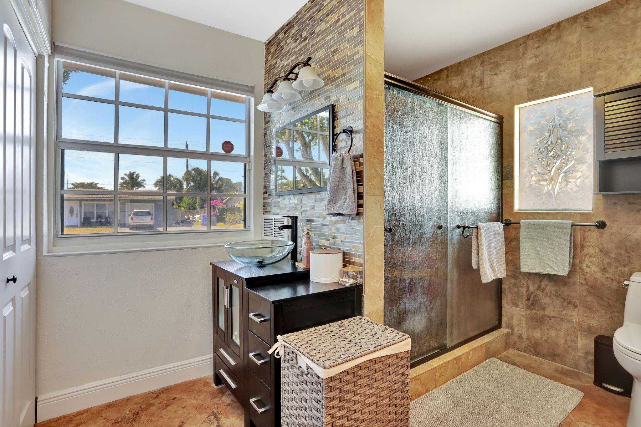 Welcome to your Pompano Beach sanctuary! This charming 3-bedroom, 2-bathroom home offers 1,207 square feet of comfort and style. The 2020 roof and 2022 A/C ensure modern convenience, 2022 water heater, while impact windows and doors provide peace of mind. Enjoy energy savings with fully paid-off solar panels and a Generac battery backup. Step inside to find an updated kitchen and bath featuring sleek LG appliances. The oversized primary bathroom boasts dual vanities and upgraded TOTO water closets. Outdoors, a PVC privacy fence surrounds the property, complemented by an aluminum electric double swing gate—perfect for your boat or RV. Relax on the screened-in back patio, illuminated with tile and lighting. With LED lighting throughout and a spacious driveway, this home is ready for you!