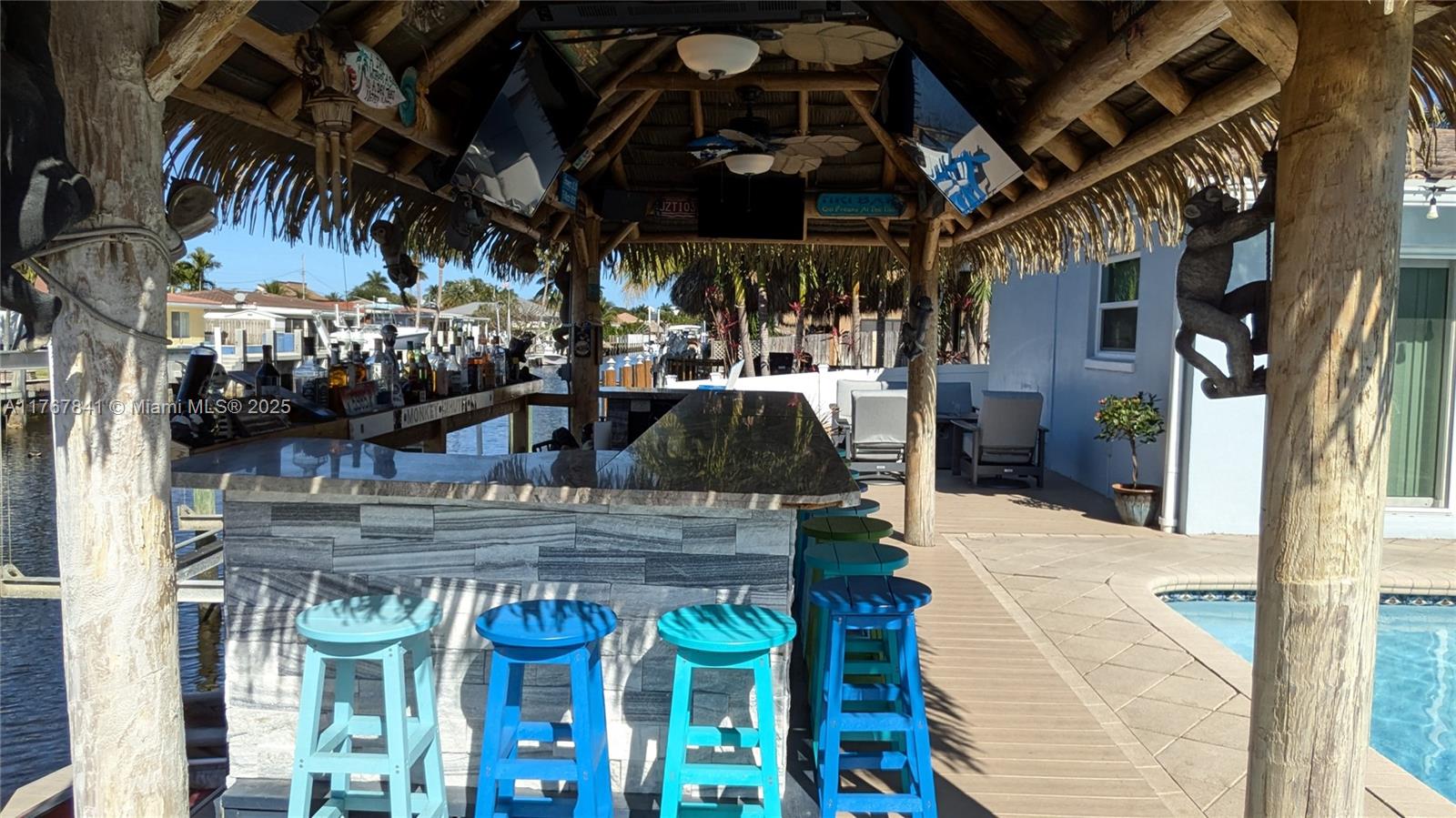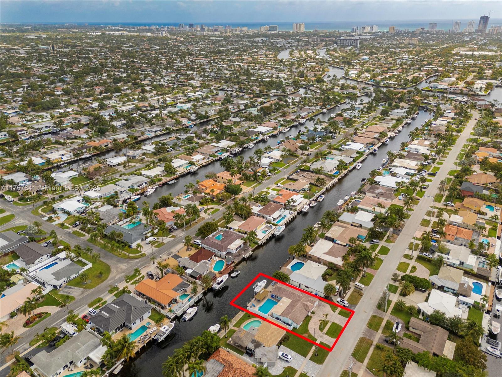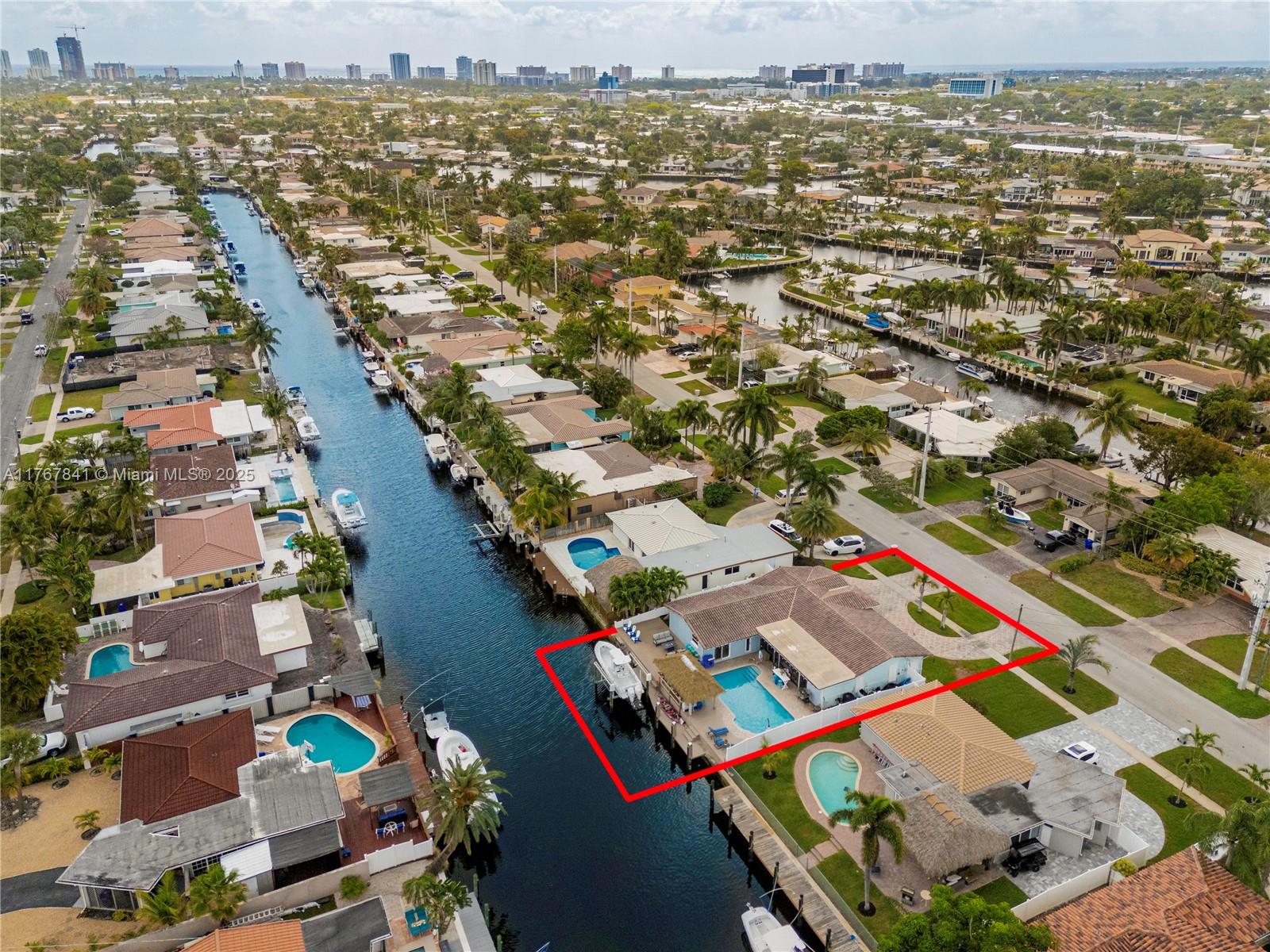 Resort-style living in this waterfront property. Bring your boat to this ocean access, split floor plan home. Complete hurricane windows, doors, and garage door. 3-bedroom, 2-bathroom gem includes a heated pool. 2-car garage is air-conditioned and carpeted & auto garage door opener. NO CAST IRON PIPES, build with PVC. Backyard paradise, complete with a TIKI Bar featuring refrigerators, ice maker, & sink. Enjoy ample room for entertaining under the synthetic palm roof. Take advantage of the $10,000lb four-post boat lift, second bridge clearance same as Federal Highway bridge. The large primary bedroom and bath include a separate shower, whirlpool tub, and walk-in closet. Each bedroom has a walk-in closet. EV charger. East Pompano Beach close to beaches, I-95, shopping & restaurants