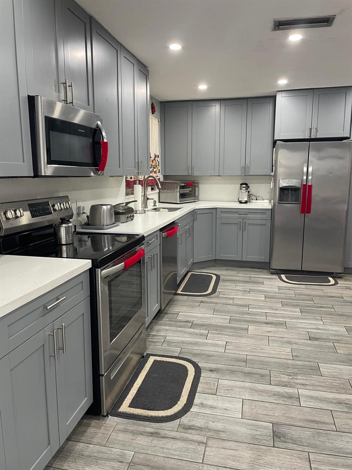 Charming and well maintained 3 BR, 2 BA single family home with no HOA! This move-in ready home features a new roof (2024), impact windows/accordion shutters for the patio. Enjoy screened in pool with water view, security camera system, & fully equipped lawn sprinkler system to keep your yard lush year-round! The updated kitchen boasts quartz countertops and lots of cabinets! Both bathrooms have been renovated. Inside you'll find beautiful ceramic tile that looks like wood throughout, a spacious laundry room with extra storage, & 2 car garage for convenience. A storage shed in the backyard. Close to shopping centers, dining & Hard Rock Stadium, schools, parks and major highways. (Exclude extra freezer in kitchen from sale)
