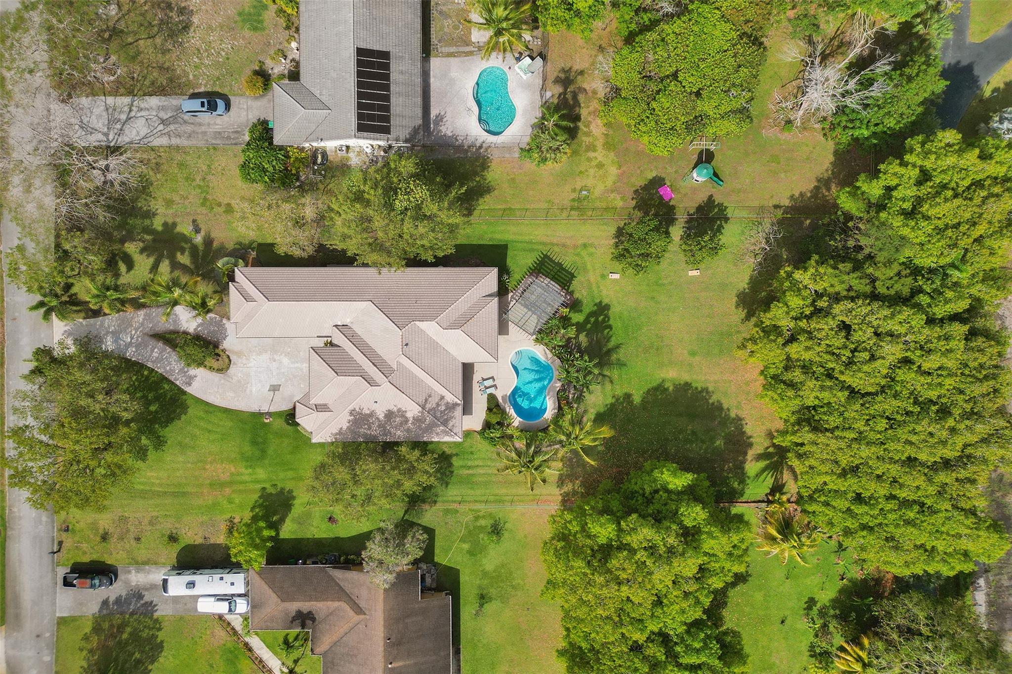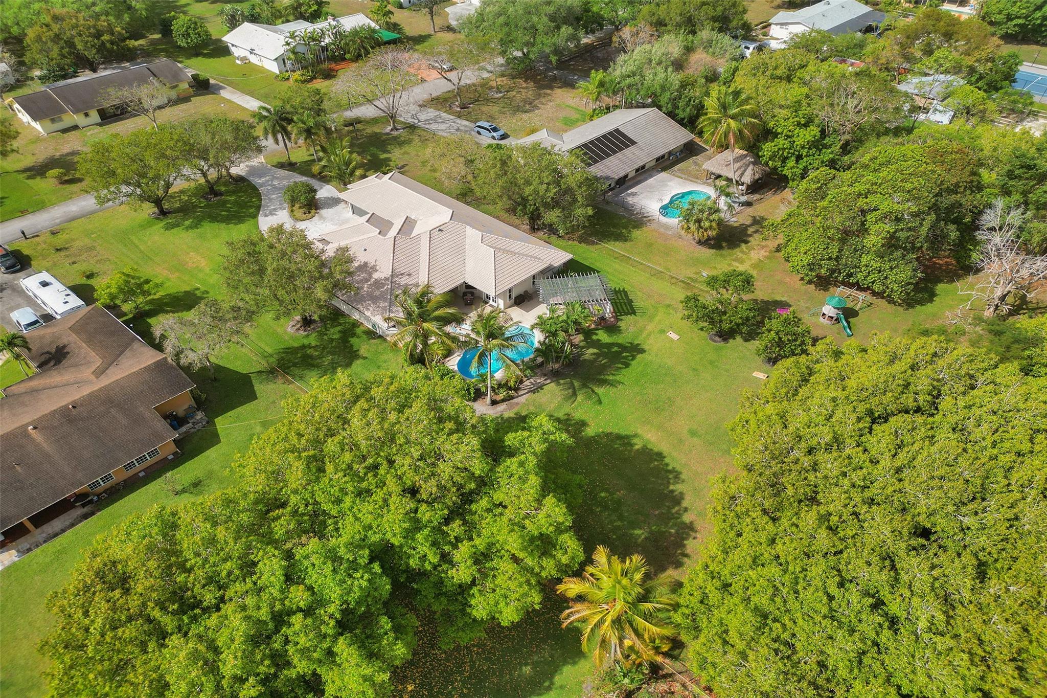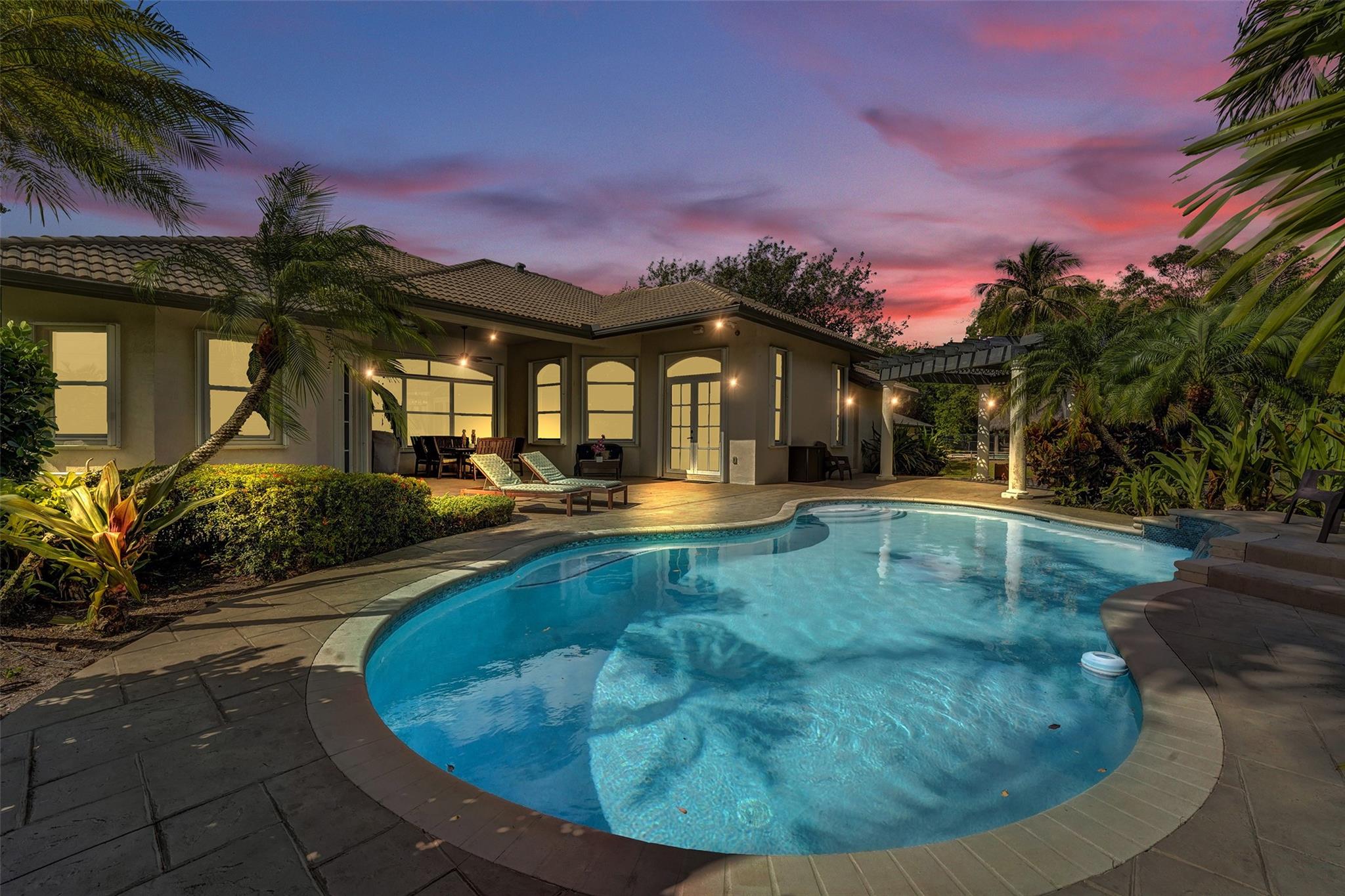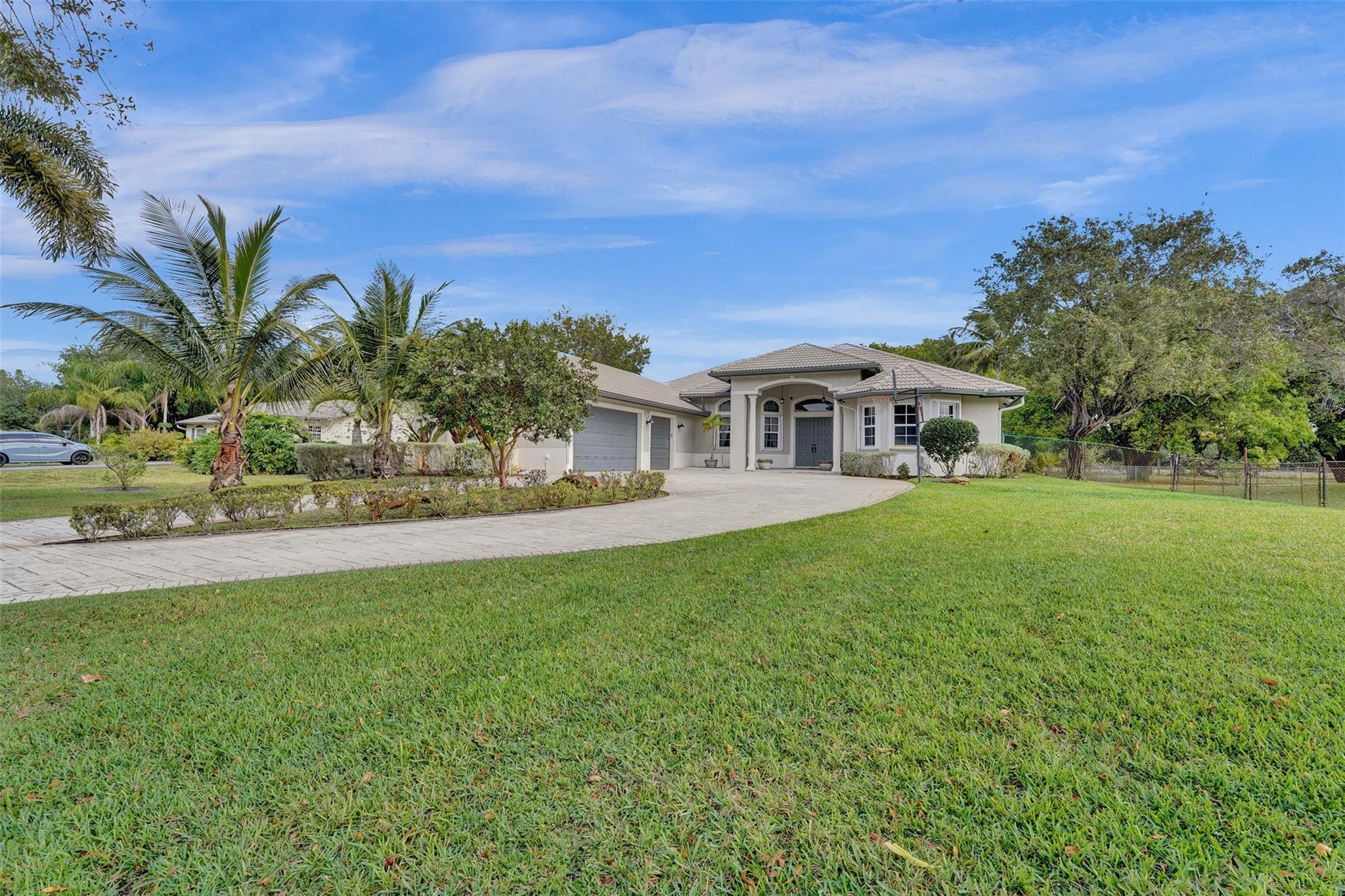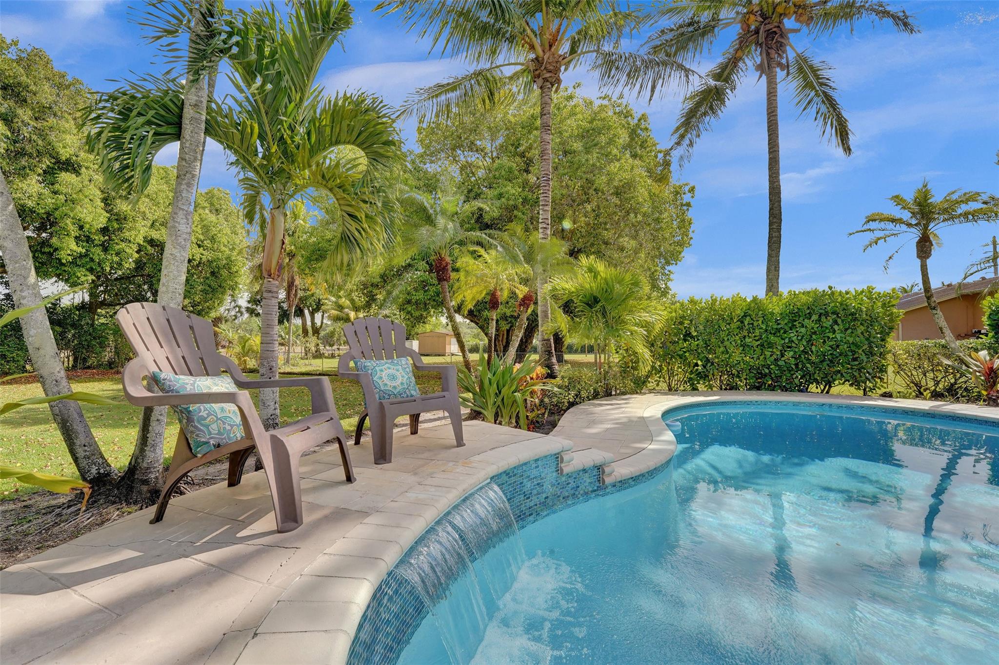 Tropical Paradise in this charming estate pool home with over $200K in upgrades! It's nestled in the sought after West Davie community of custom homes on almost one full acre lot. Step into a meticulously clean & bright "triple split" floor plan that boasts 5 true bedrooms, plus office area, & 3 full baths. Super spacious chef's kitchen featuring crisp white cabinetry with stylish backsplash & SS appliances. Luxury vinyl flooring thru out! Designers touch with soaring ceilings, recessed lighting, textured walls, decorative crown & window trim finishes. Your own tropical oasis awaits with a covered patio, pergola, & tranquil pool w/ waterfall with lush landscaping & mature trees. Conveniently fenced yard for boat/RV parking. Large circular driveway w/ 3 car garage. Top schools. No HOA
