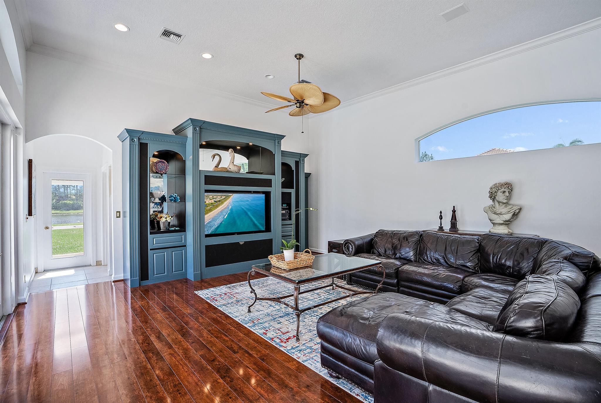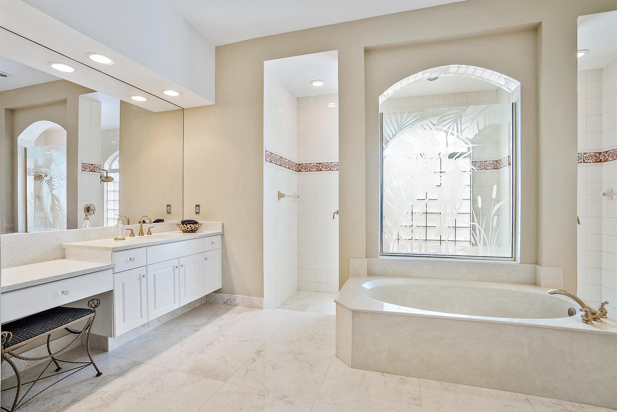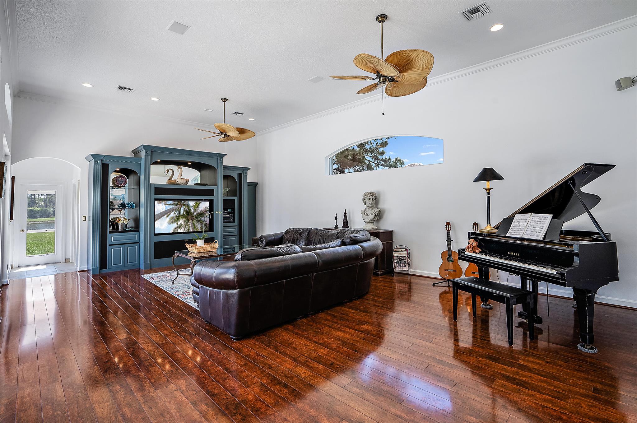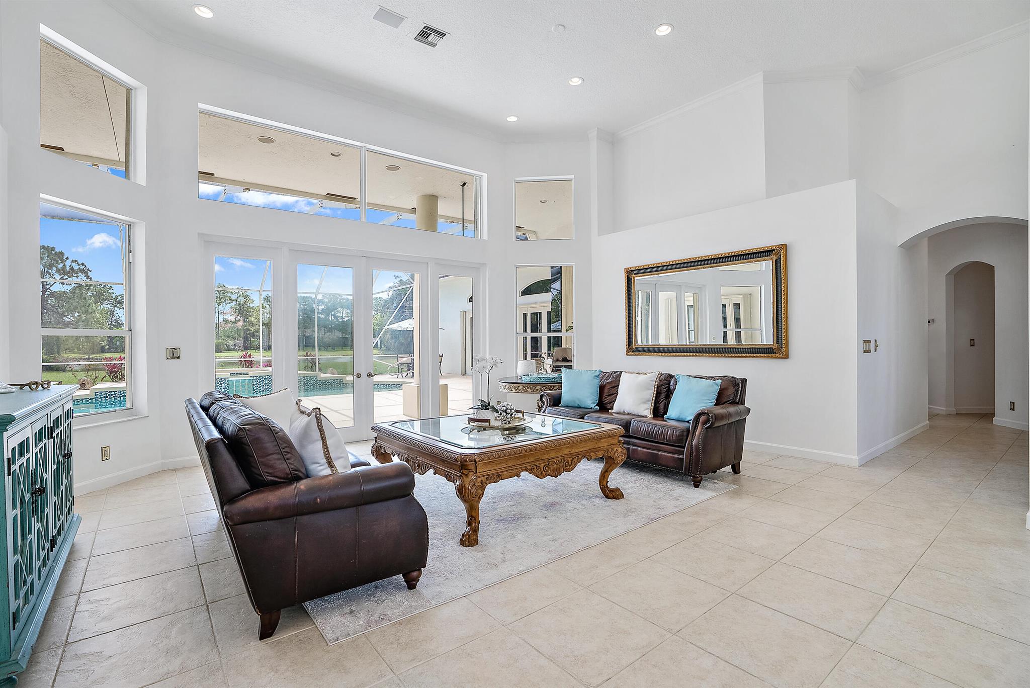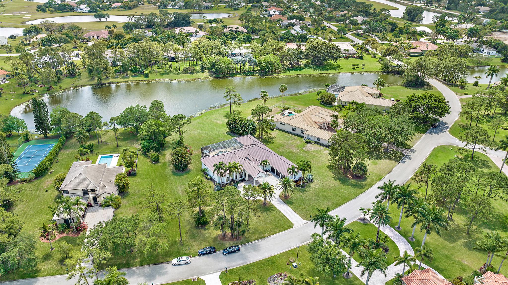 Welcome to your own 1.05 ACRE ESTATE located in the sought-after Bay Hill Estates neighborhood of Palm Beach Gardens. From the moment you approach the magnificent property, you'll be wowed by the dramatic circular driveway and regal Porte Cochere entry, flanked by lion statues. Perfect for entertaining and casual living, the open floor plan has expansive views of the lake from most of the windows in the home. Soaring 18-foot ceilings in the living room provide major architectural drama, while the outdoor pool and open patio draws one's eye outside to the tropically landscaped property. Enjoy immense privacy as you're secluded from neighbors. Three full bedrooms, including a spacious 15ft x 24ft Primary Bedroom, plus a convertible bedroom/den/office. Both secondary bedrooms are en suite.