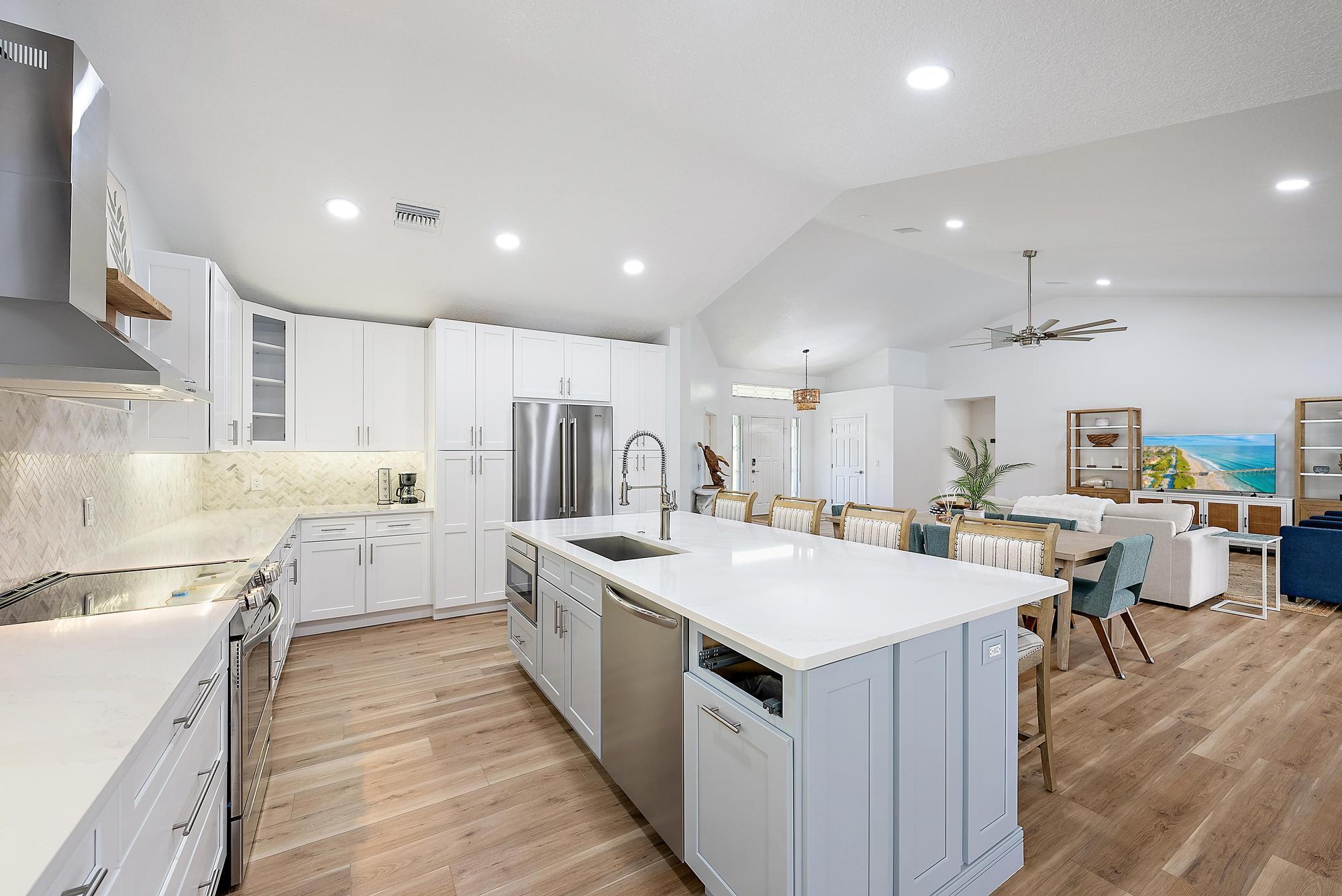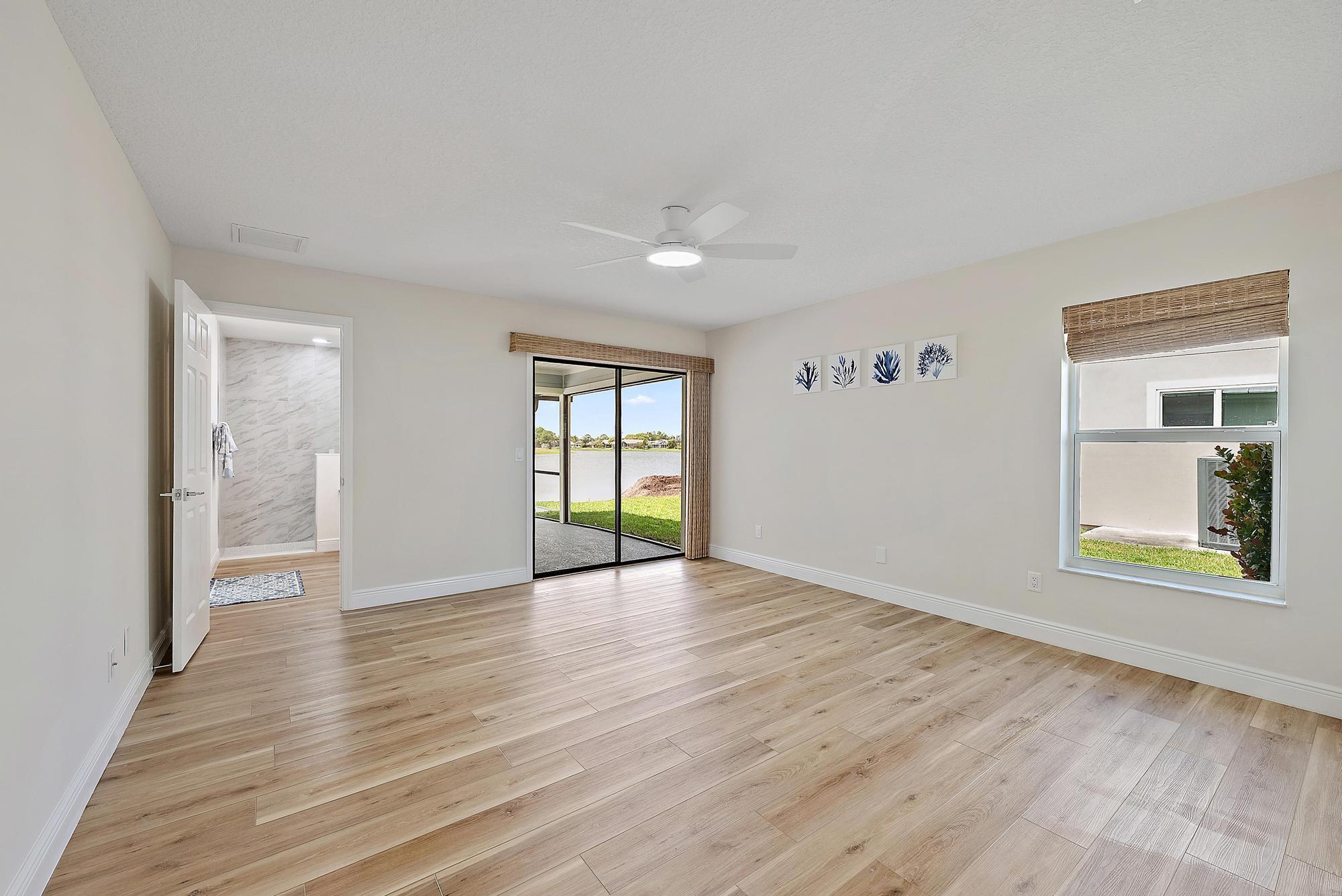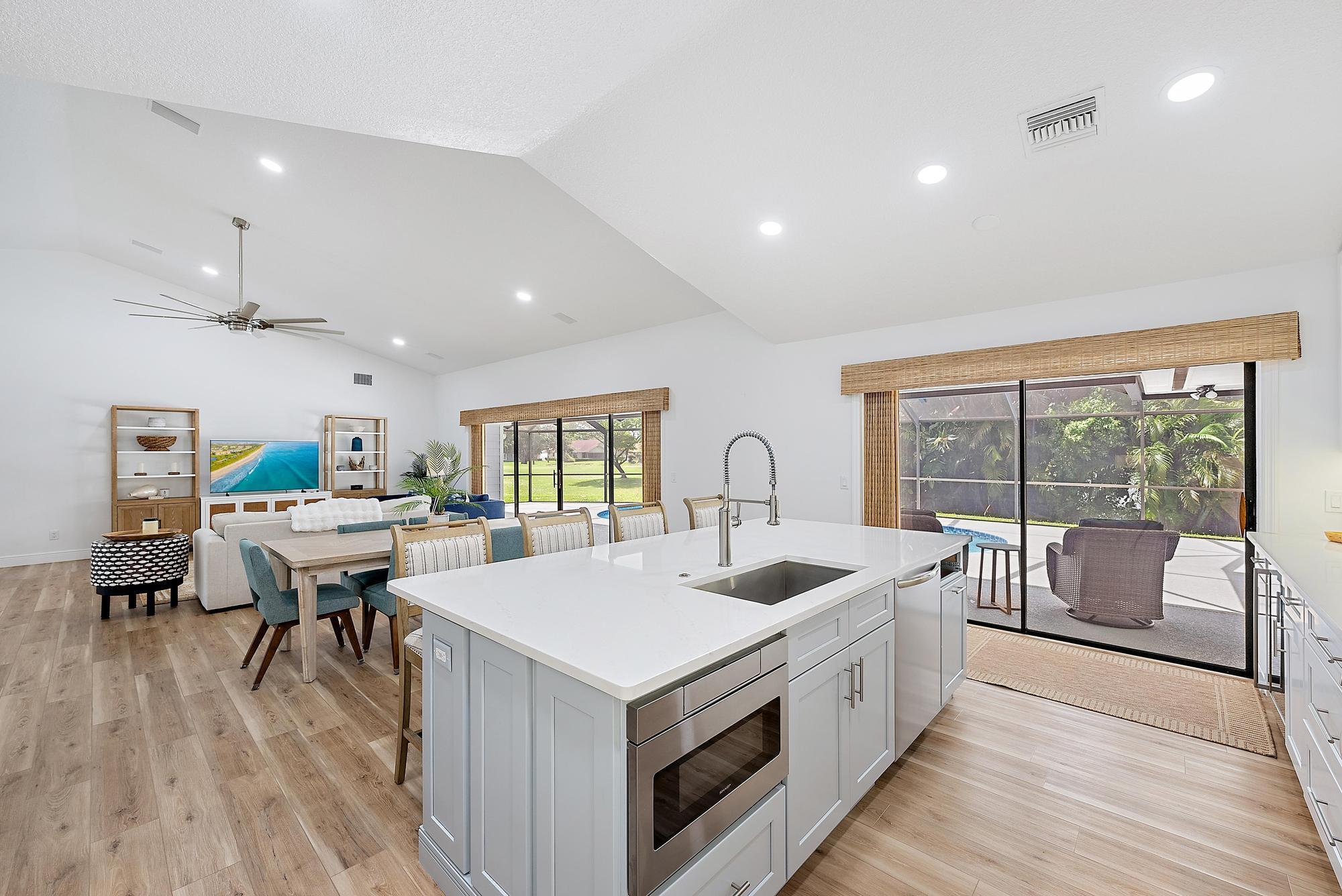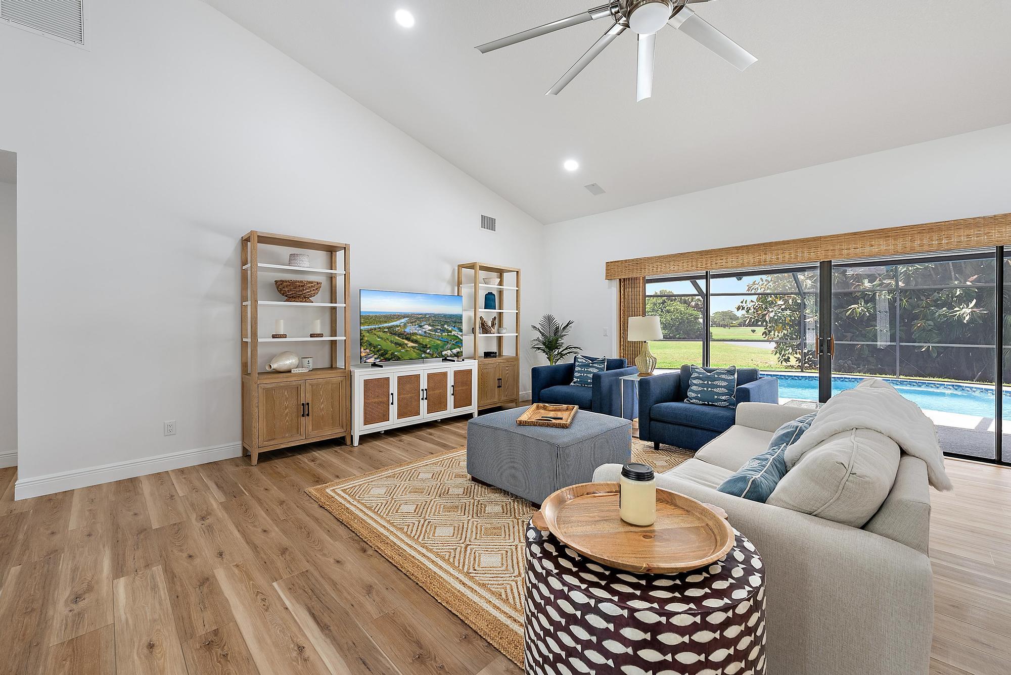 Stunning Lakefront One Story Home w/ Designer Finishes Throughout & Optional Golf Membership Only $1,750! Enjoy Beautiful Lanai, Custom Screened In Pool on Lake w/ Over 1,000 ft of Wide Water, Gorgeous Sunsets & Golf Views. Some Features Include Over 2,400 A/C SF, 3,600 Total SF, New Metal Roof, Vaulted Ceilings, Quartz Countertops, Stainless Steel Appliances w/ Wine Chiller, Dual Built-In Pantries, Impact Glass Windows, Great for Entertaining w/ Pocket Sliding Doors to Patio, Large Laundry Room, New AC, New Water Heater, Cabana Bath, HOA $500/yr, Huge 2 Car Garage w/ Epoxy Floor, Low Martin County Taxes & Located on Quiet Cul-De-Sac. Main Master Suite Offers Access to Pool, 2 Walk In Closets, Large Shower w/ 3 Shower Heads, Free Standing Tub, Dual Vanities. 2nd Master Suite has Walk