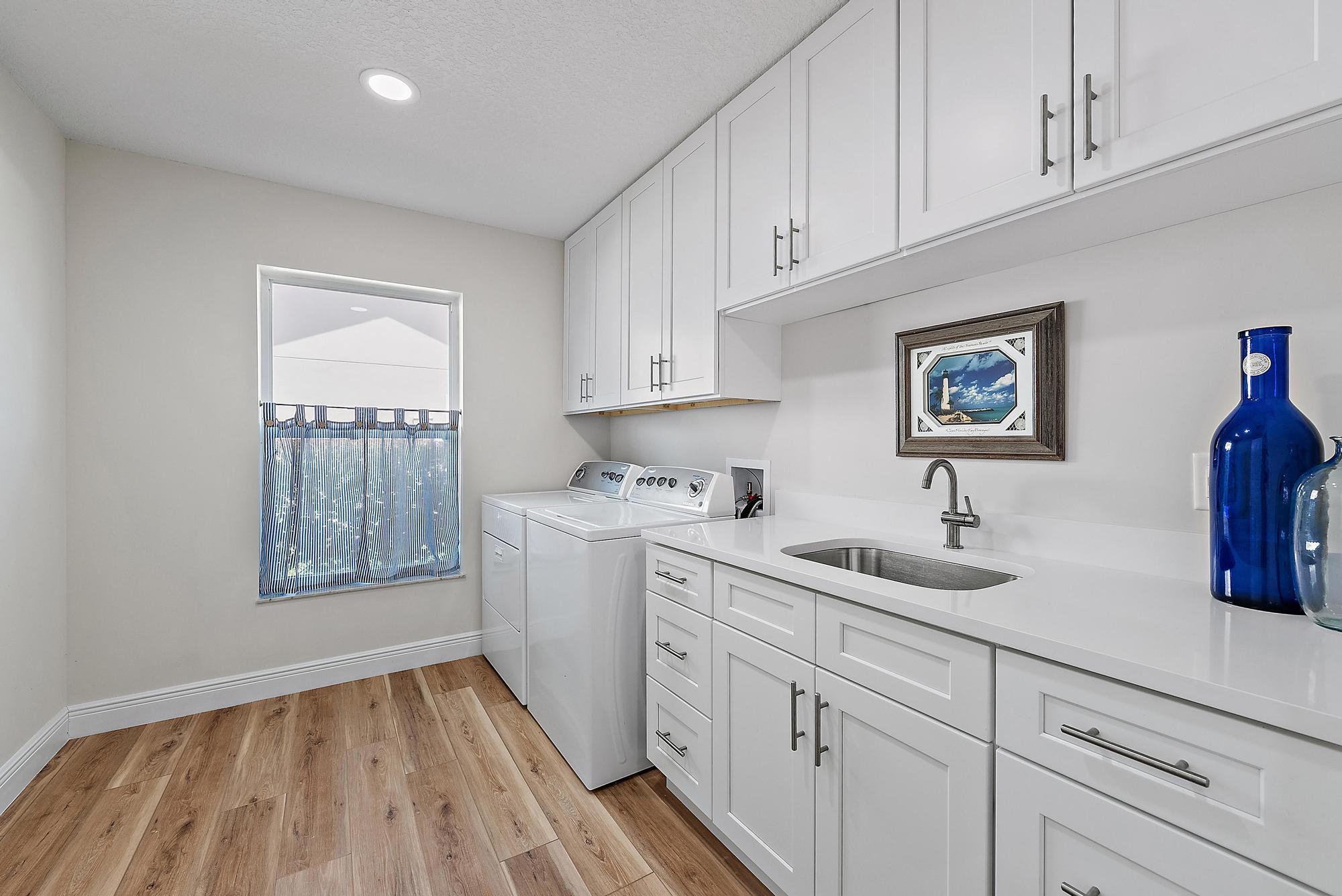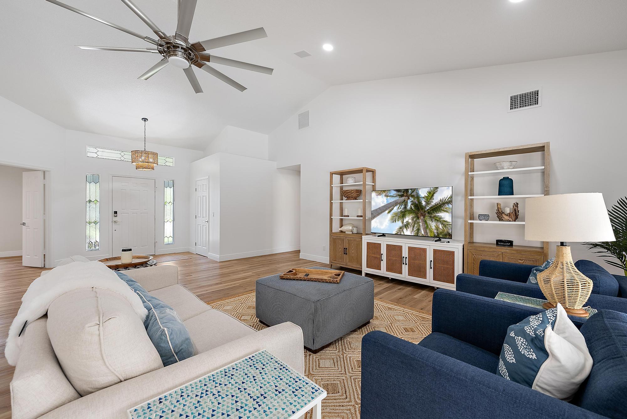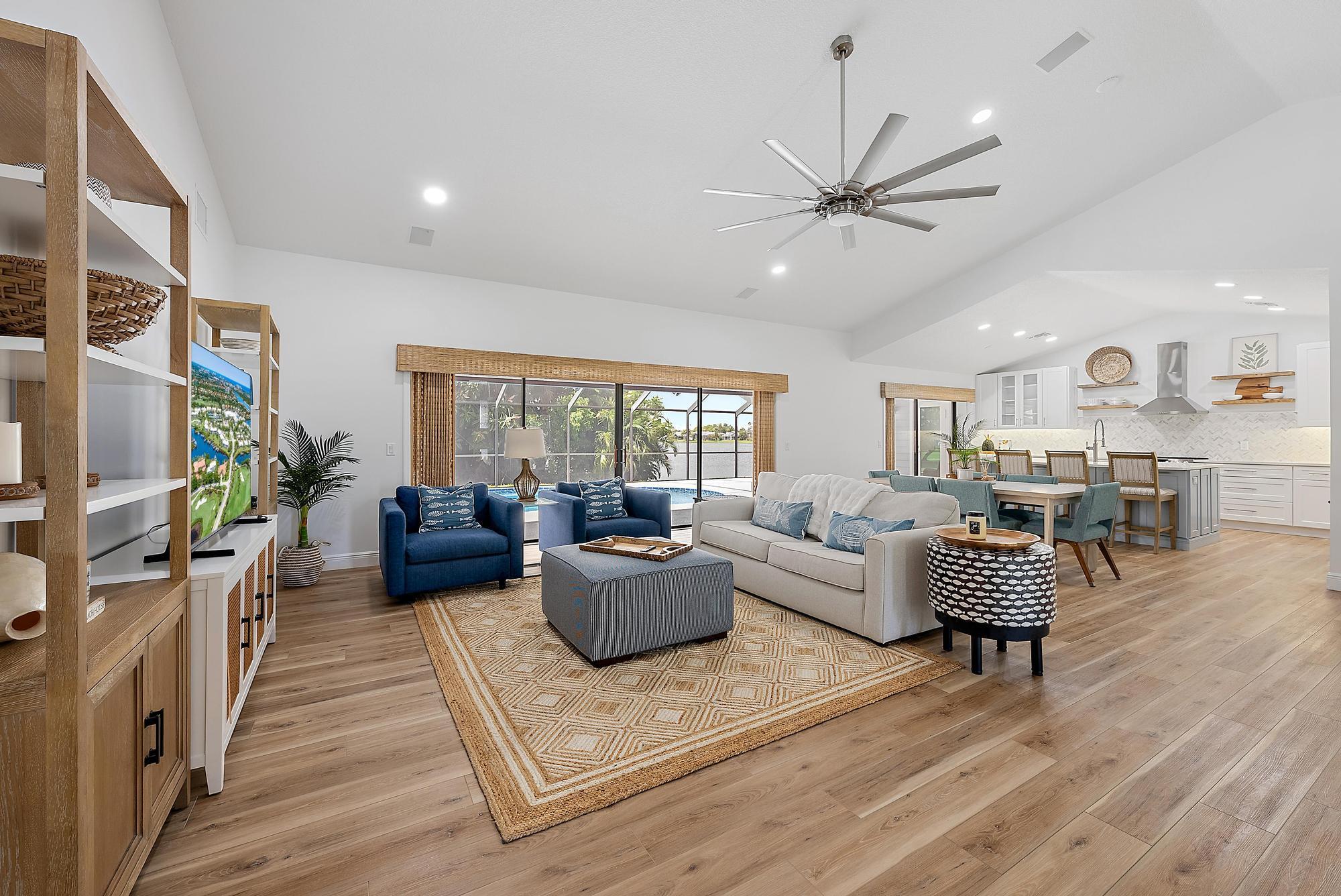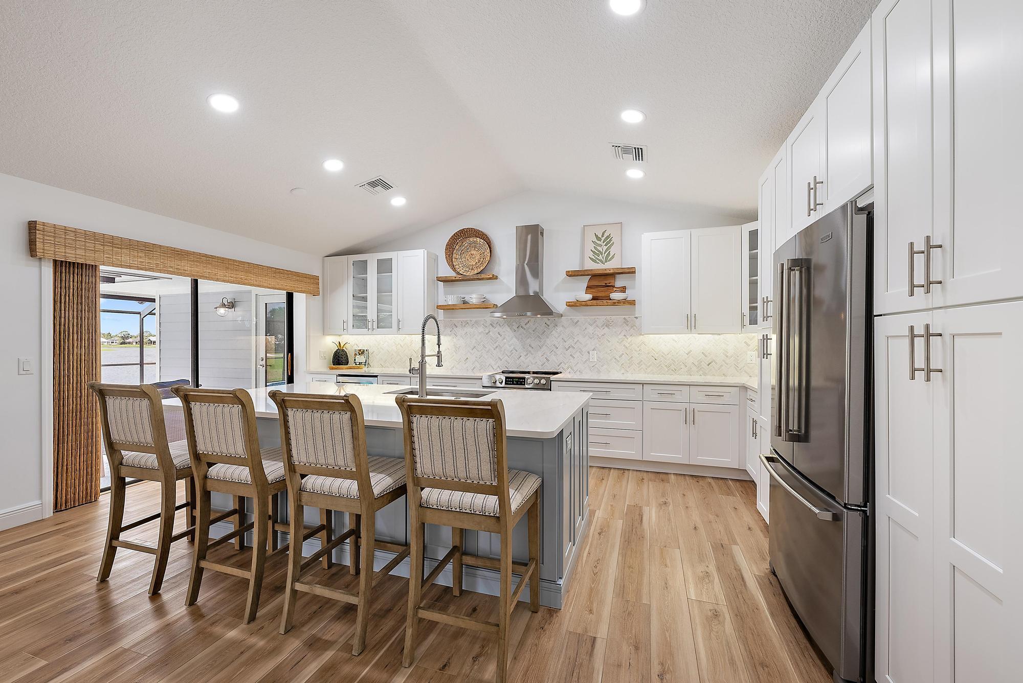 Stunning Lakefront One Story Home w/ Designer Finishes Throughout & Optional Golf Membership Only $1,750! Enjoy Beautiful Lanai, Custom Screened In Pool on Lake w/ Over 1,000 ft of Wide Water, Gorgeous Sunsets & Golf Views. Some Features Include Over 2,400 A/C SF, 3,600 Total SF, New Metal Roof, Vaulted Ceilings, Quartz Countertops, Stainless Steel Appliances w/ Wine Chiller, Dual Built-In Pantries, Impact Glass Windows, Great for Entertaining w/ Pocket Sliding Doors to Patio, Large Laundry Room, New AC, New Water Heater, Cabana Bath, HOA $500/yr, Huge 2 Car Garage w/ Epoxy Floor, Low Martin County Taxes & Located on Quiet Cul-De-Sac. Main Master Suite Offers Access to Pool, 2 Walk In Closets, Large Shower w/ 3 Shower Heads, Free Standing Tub, Dual Vanities. 2nd Master Suite has Walk